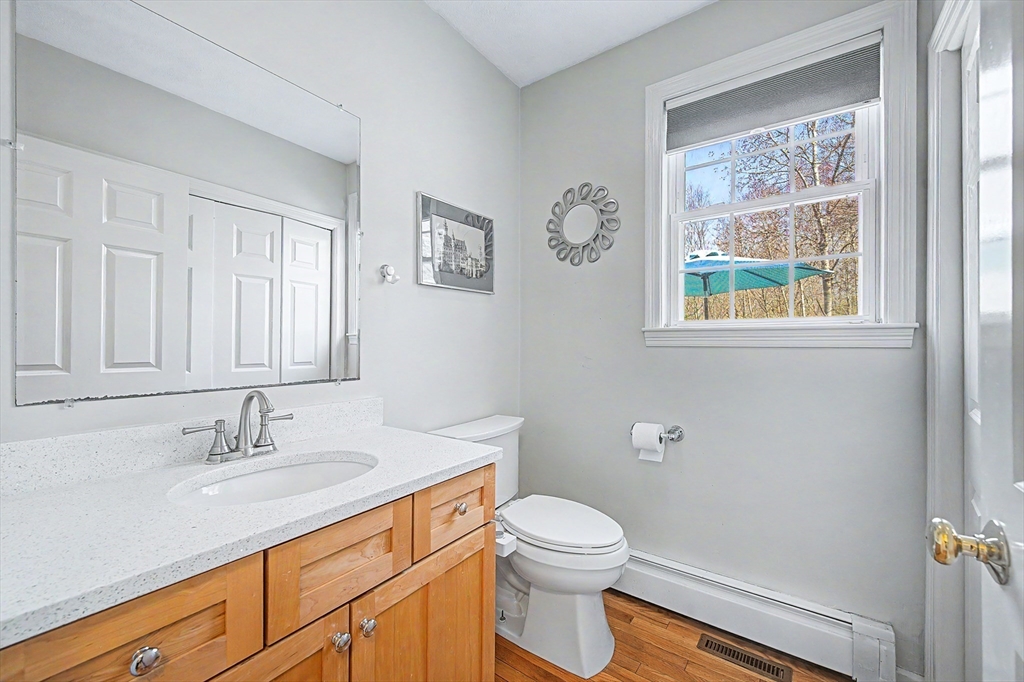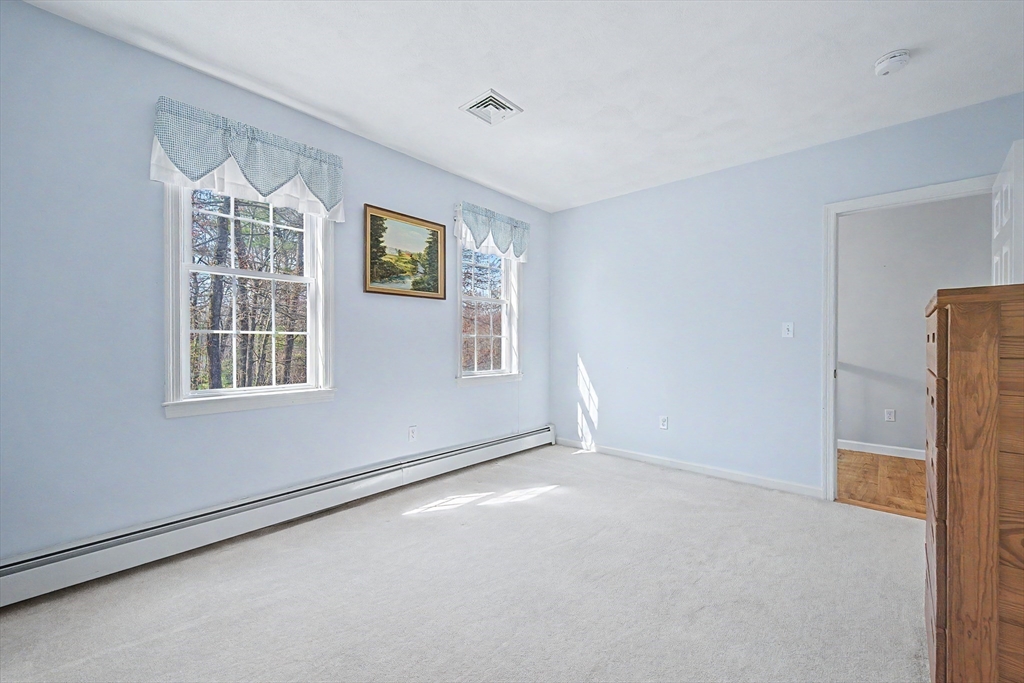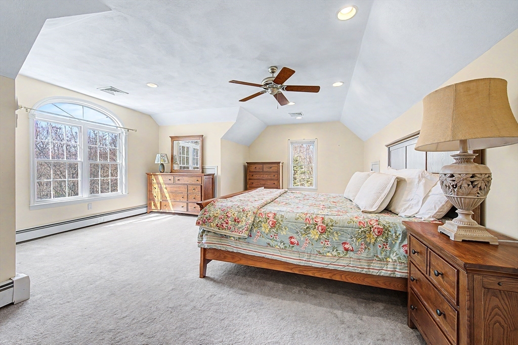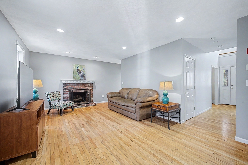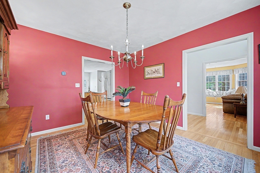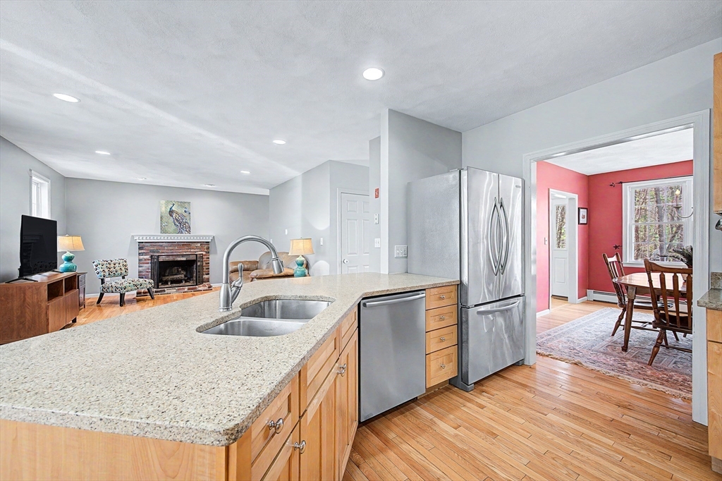 Welcome to beautiful 6 Field Pond Road nestled on two private and wooded acres! The inviting farmers' porch greets you as you enter the front door. The first floor has hardwood flooring throughout. Open kitchen and family room with views to the huge composite deck and woods behind . Kitchen has SS appliances, quartz counter tops and breakfast bar, as well as large eating area and door to deck. Family room has wood burning fire place. First floor office has bay window with window seat. Bedrooms are spacious and primary bedroom has vaulted ceiling, a lovely updated shower, ceiling fan, and a walk in closet. Lower level is a walk out to the backyard. Sellers have done major updates to the home including new high end propane heating system ( replacing former oil heat) in 2021. Driveway replaced in 2025. Newly finished basement with new half bath in 2024. New high efficiency AC units in 2023. With conservation land right behind your backyard, this home has everything!