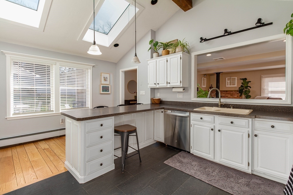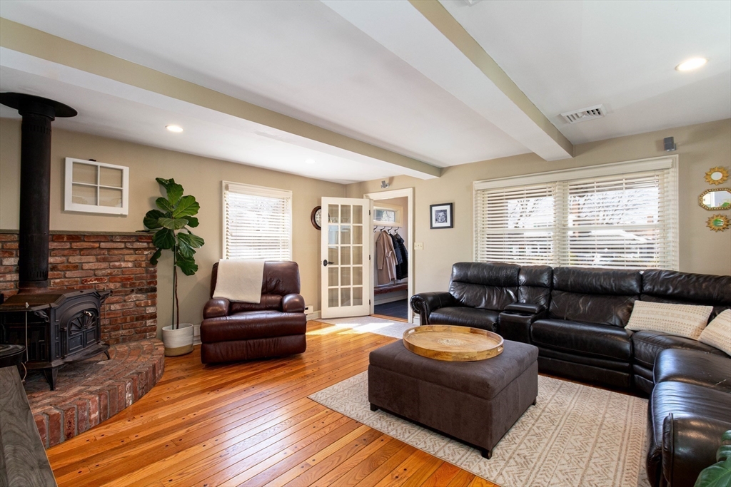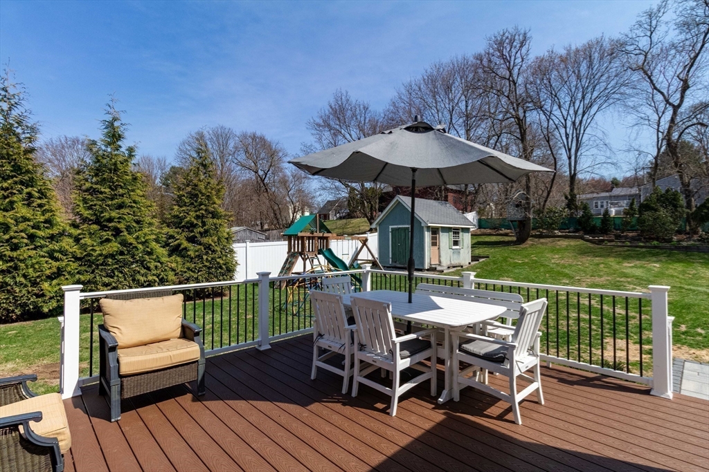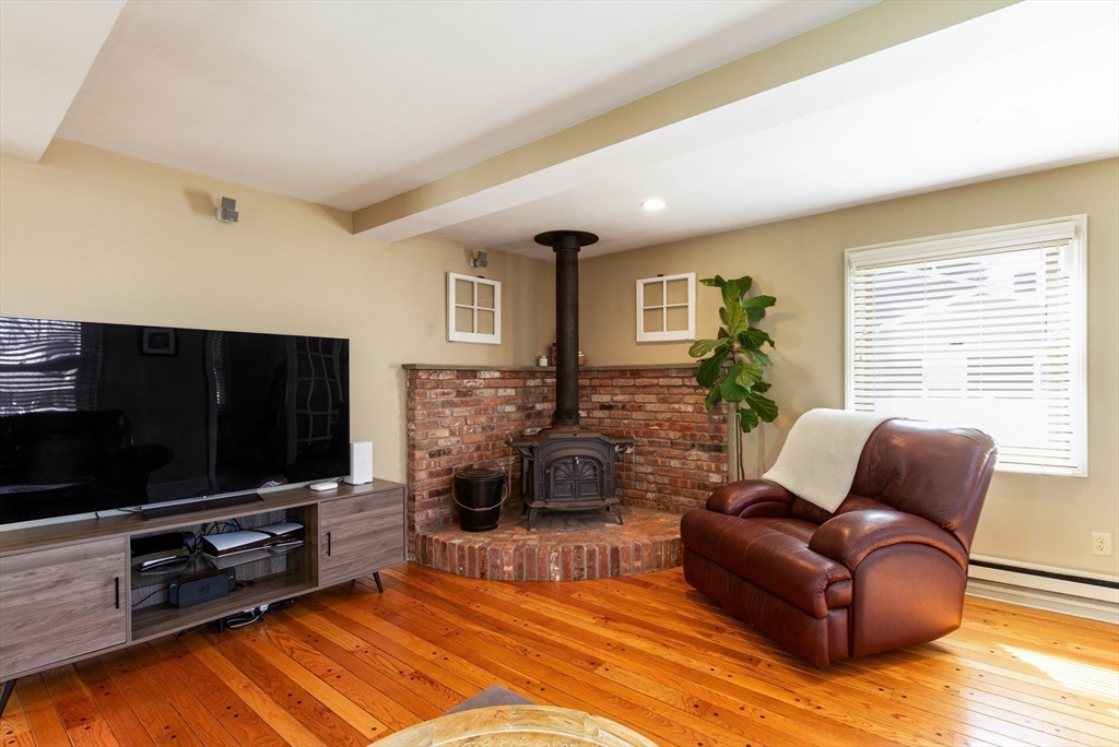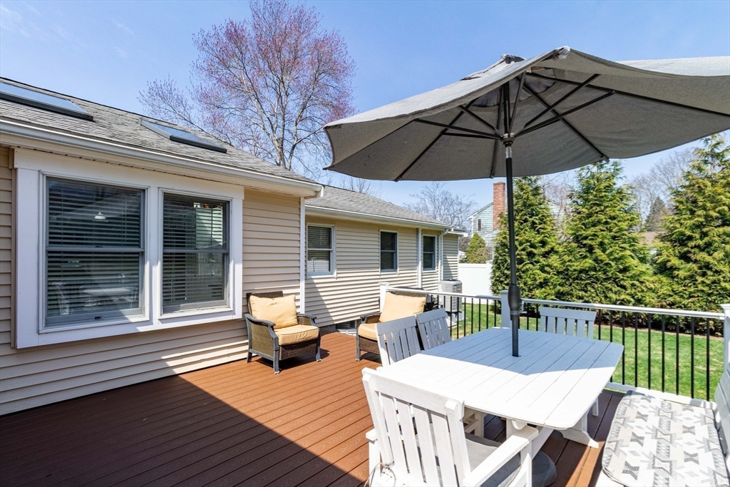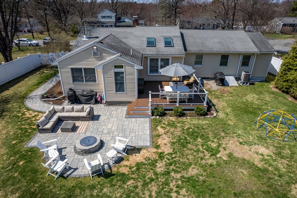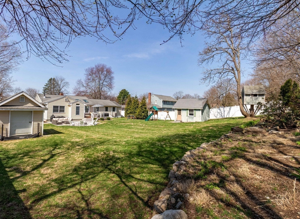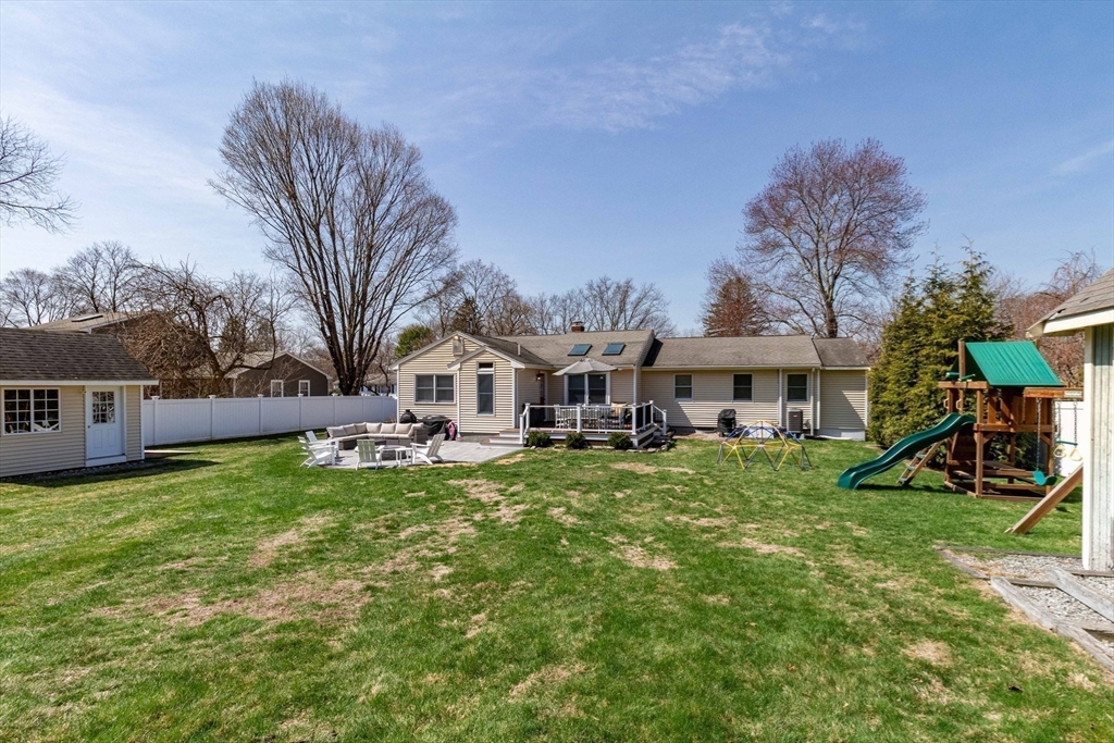 This spacious ranch offers the ease of one-floor living in a fantastic neighborhood close to the center of town. Featuring 3 bedrooms (two with walk-in closets) and 2 full baths, this home offers plenty of space to spread out. The bright kitchen is a standout with granite countertops, a peninsula with seating, new tile flooring, newer stainless steel appliances, and a vaulted ceiling with skylights that flood the space with natural light. Enjoy a living room with hardwood floors and a cozy wood stove, a formal dining room with wood beamed ceiling, and a family room with fireplace and custom built-ins. The finished basement adds flexible space ideal for a playroom, gym, office, or guest area, plus a separate laundry room and a large unfinished area with great storage or future potential. Step outside and enjoy an impressive backyard retreat featuring a large deck, beautiful stone walkways, a patio with fire pit, fenced-in privacy, two storage sheds, and even a treehouse and swing set.