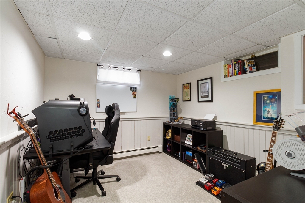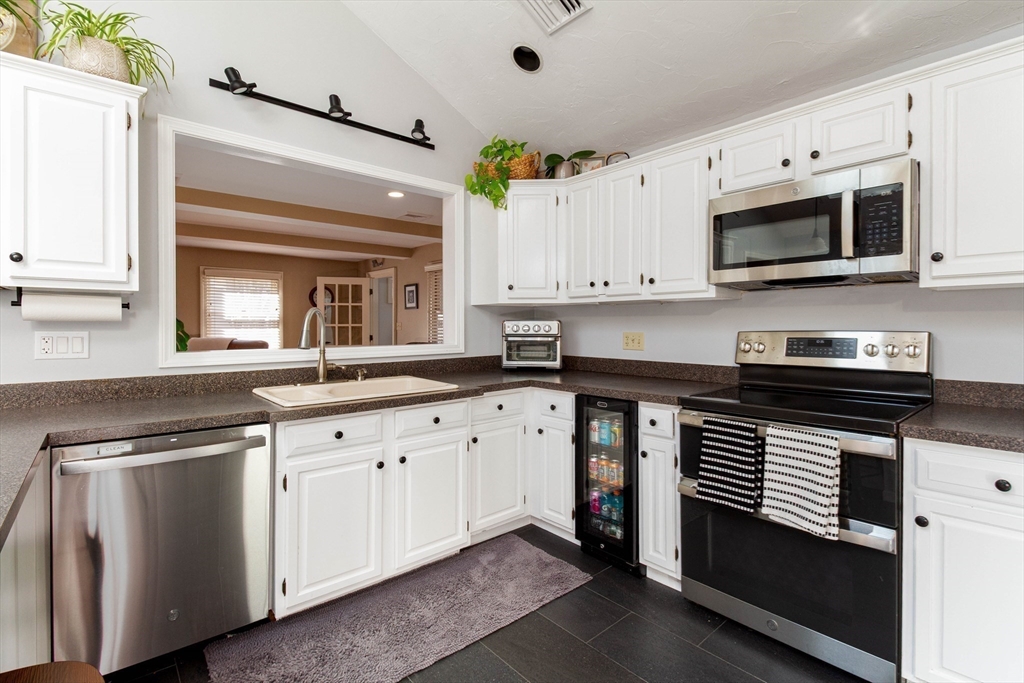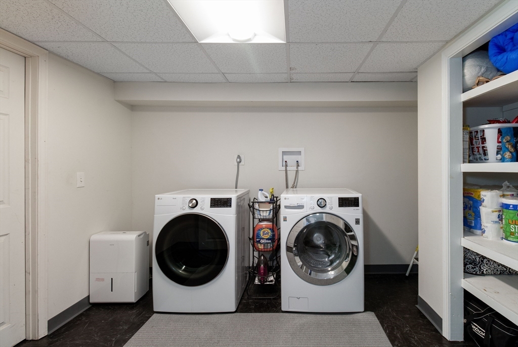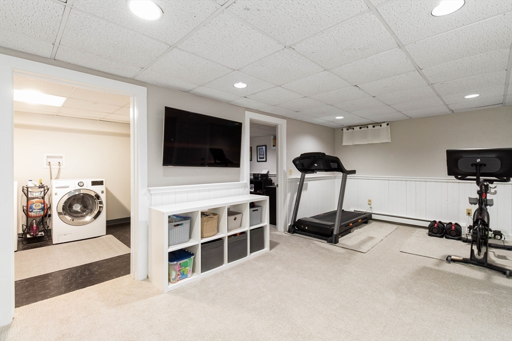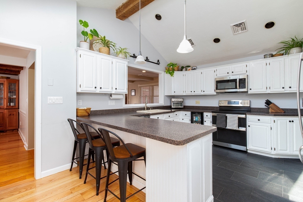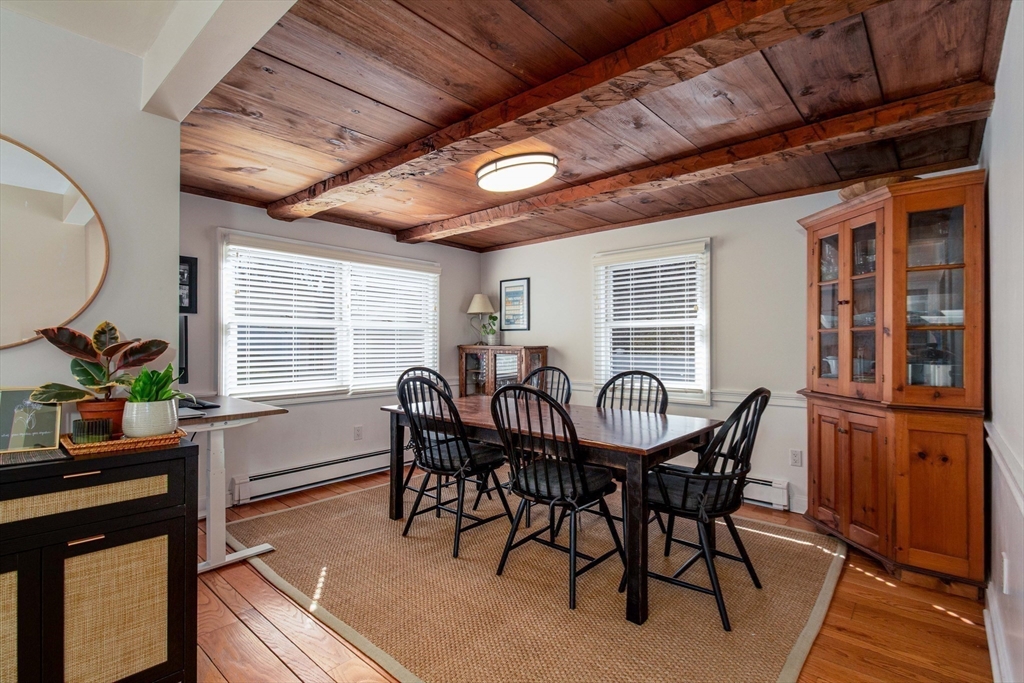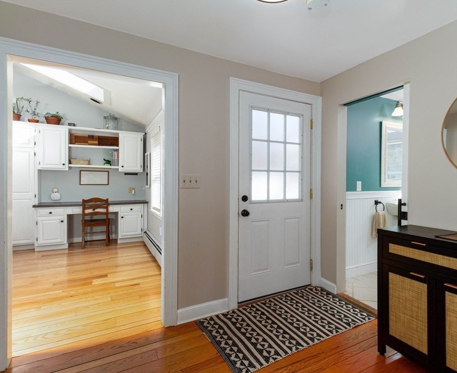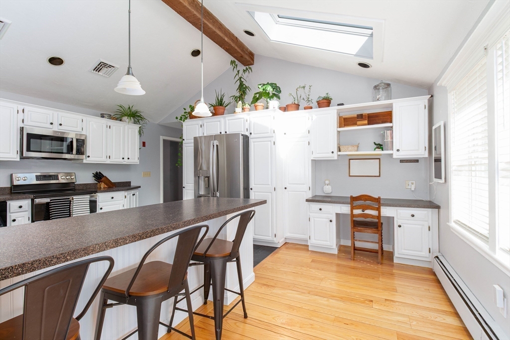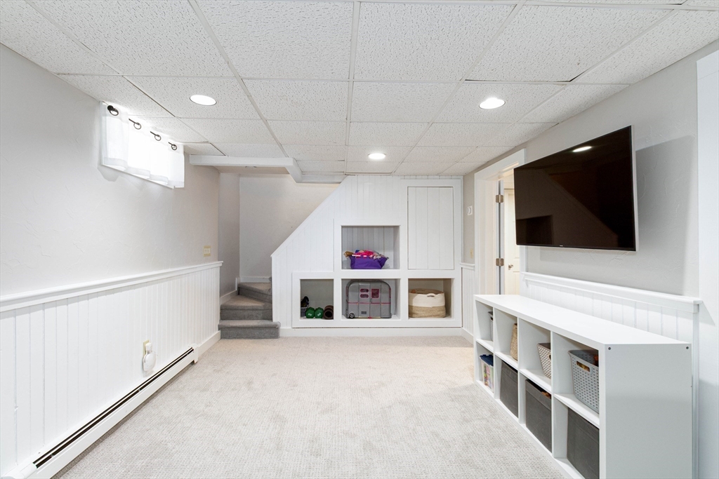This spacious ranch offers the ease of one-floor living in a fantastic neighborhood close to the center of town. Featuring 3 bedrooms (two with walk-in closets) and 2 full baths, this home offers plenty of space to spread out. The bright kitchen is a standout with granite countertops, a peninsula with seating, new tile flooring, newer stainless steel appliances, and a vaulted ceiling with skylights that flood the space with natural light. Enjoy a living room with hardwood floors and a cozy wood stove, a formal dining room with wood beamed ceiling, and a family room with fireplace and custom built-ins. The finished basement adds flexible space ideal for a playroom, gym, office, or guest area, plus a separate laundry room and a large unfinished area with great storage or future potential. Step outside and enjoy an impressive backyard retreat featuring a large deck, beautiful stone walkways, a patio with fire pit, fenced-in privacy, two storage sheds, and even a treehouse and swing set.