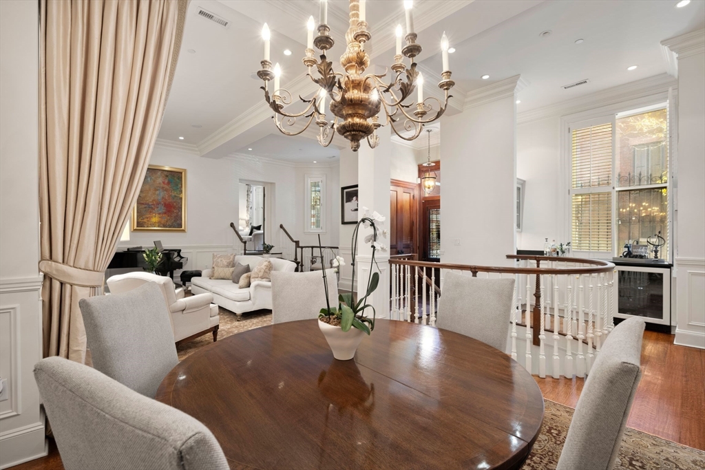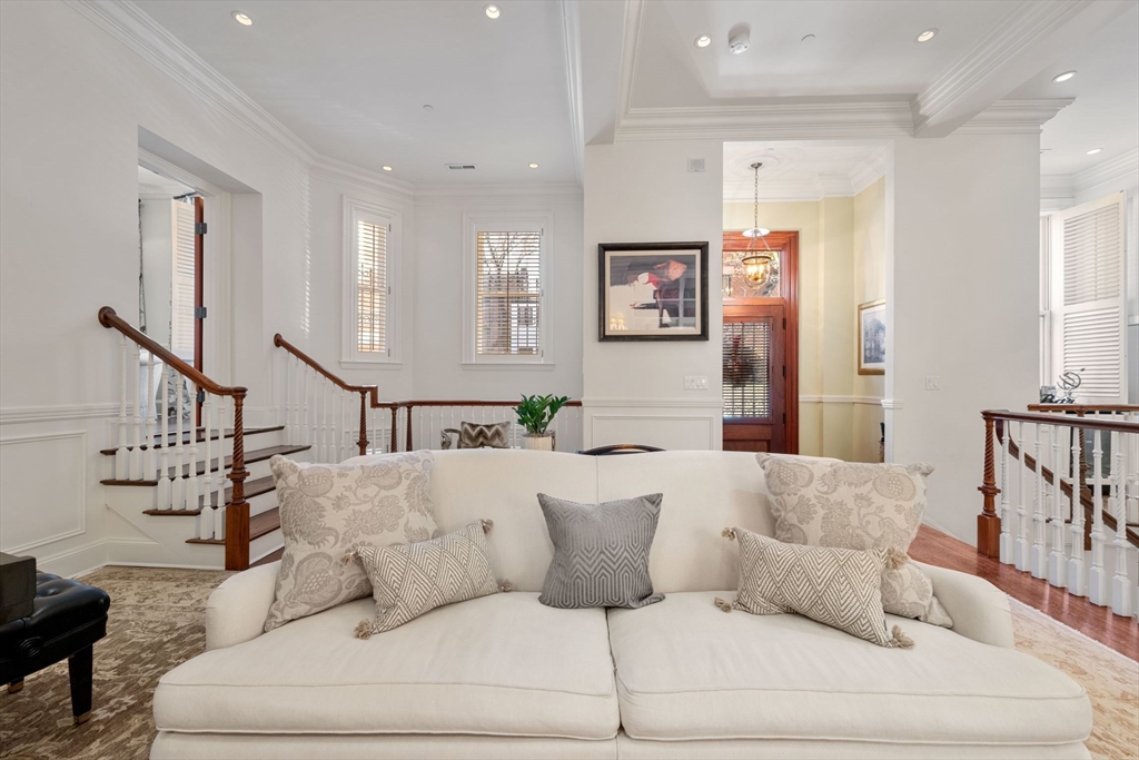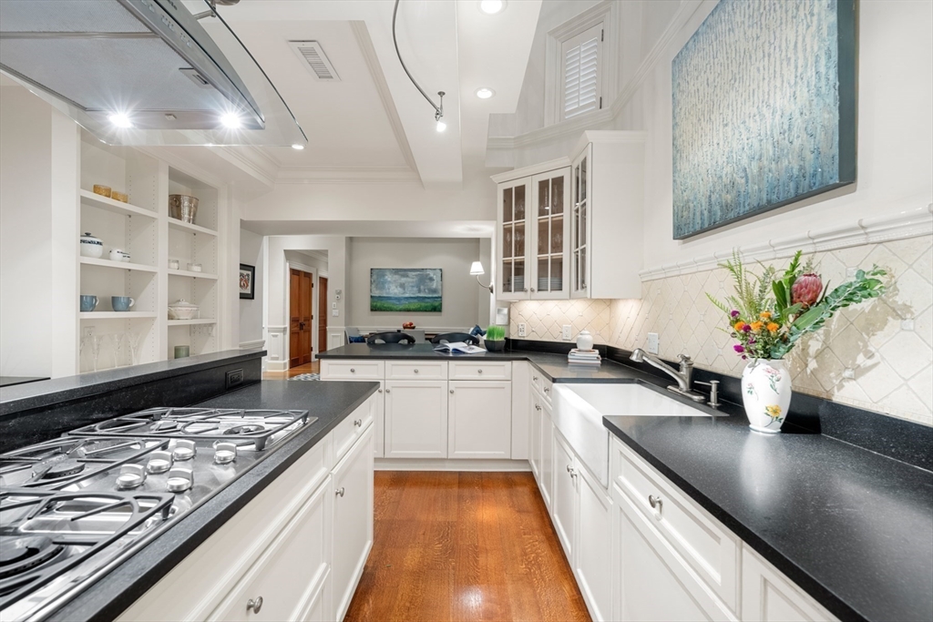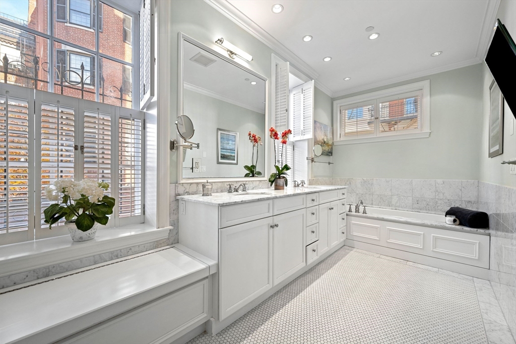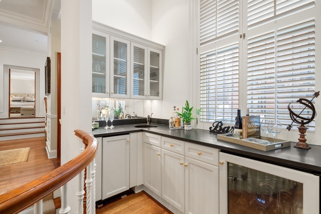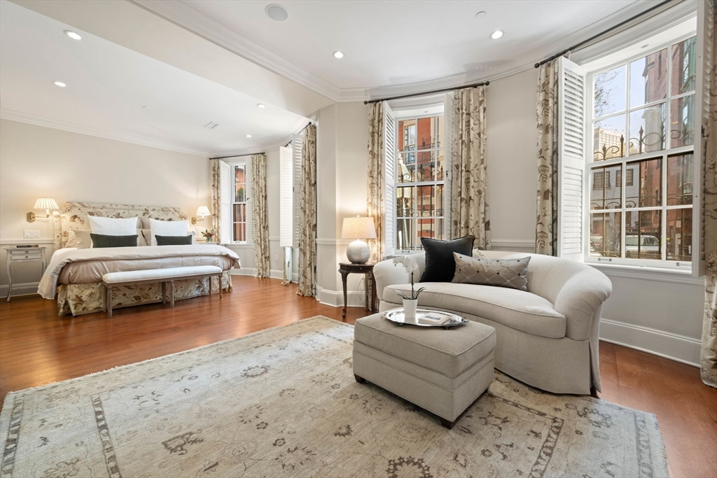 This elegant duplex condo, with 17(!) windows on the parlor level alone, is located within The Armory - a distinguished concierge building at 50 Beacon Street in Beacon Hill - an intimate 5 residence building. Offering a private townhouse style entrance on picturesque Spruce St., the grand spaces welcome you upon entry with their allure and volume. Guests will be in awe of the expansive living and dining spaces w/ 12 foot ceilings - unique, rarely seen architecture and scale. Beautiful millwork, a gas fireplace & warm hardwood flooring all add to this graceful space. Standout features include a handsome library/home office w/ wood paneled walls-a distinguished setting. A wonderfully laid out, oversized kitchen w/ notable appliances and pantry is adjacent to a fantastic den allowing for casual dining & cozy entertaining options. A luxurious primary suite w/ seating area offers 2 walk-in closets and an opulent bathroom. Two addt'l large bedrooms w/ en suite baths, powder room, storage.