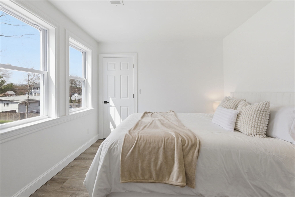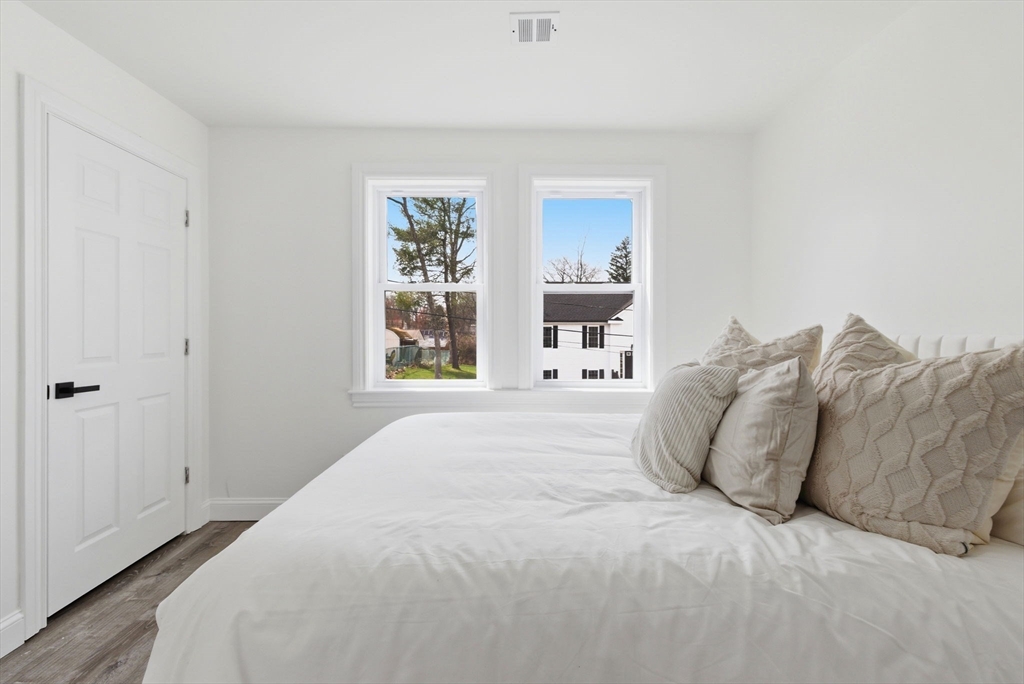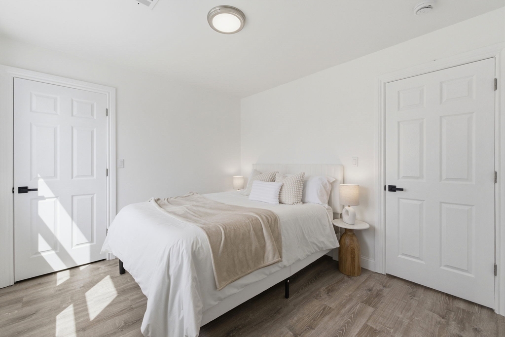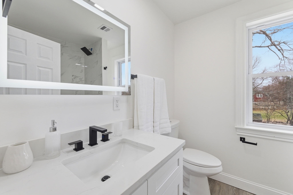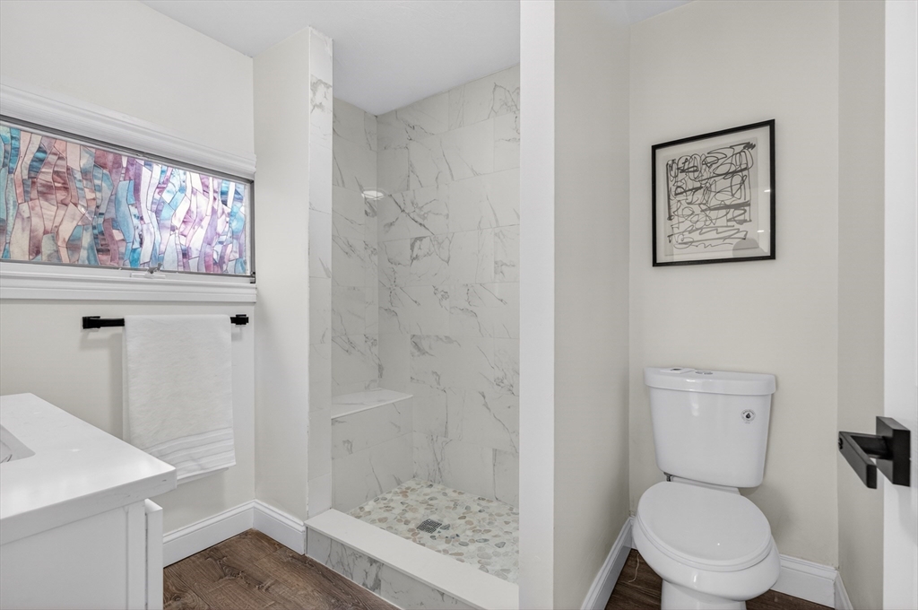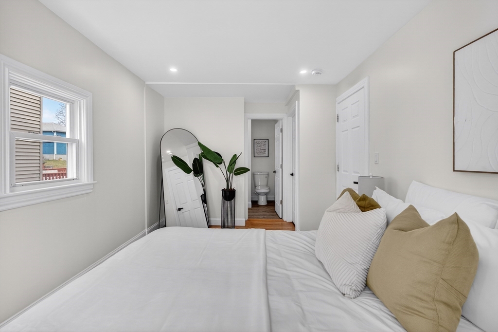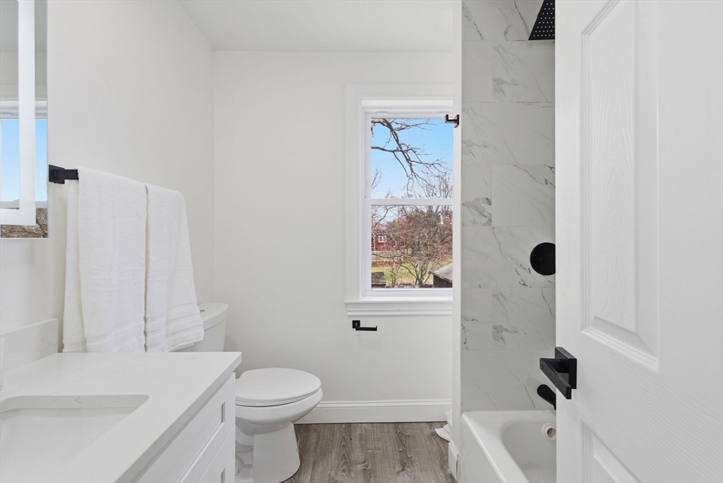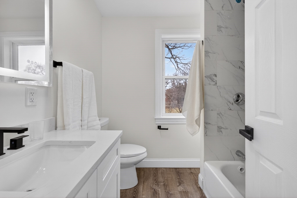 Experience the perfect blend of modern design and impressive scale in this extensively renovated Colonial home. Offering over 2,000 square feet of thoughtfully designed living space, this property has been transformed with high-end finishes throughout, including a fully rebuilt second level from the studs up. Features include new electrical, plumbing, roof, and high-efficiency heat pump providing both heating and central air. The open-concept layout is ideal for both entertaining and everyday living, flowing seamlessly from the sun-filled living area to a formal dining space enhanced by abundant natural light and a skylight, then out to an oversized deck overlooking a quiet, peaceful setting. This versatile floor plan features 4 spacious bedrooms and 4 designer bathrooms, highlighted by two private primary suites—an uncommon feature that provides exceptional flexibility for guests or multi-generational living. The massive unfinished basement offers endless potential for the future!