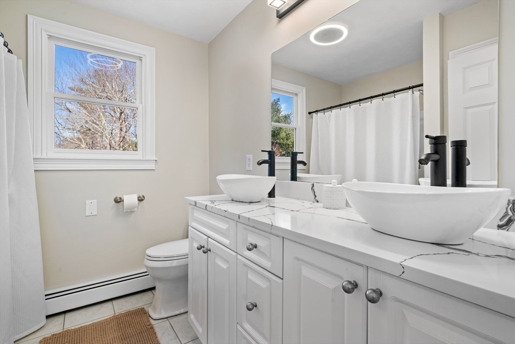 Everything you've been waiting for and more! 14 Hickory Lane boasts 4 bedrooms, 3.5 baths, and a full in-law with 5th bedroom! Perfect for multi-generational living and room for the whole family. Thoughtfully updated, the main level features hardwood floors and a seamless open layout ideal for everyday living and entertaining. The kitchen showcases quartz countertops and a dramatic waterfall island with seating for 7. The private in-law offers its own space downstairs with a full kitchen, updated vinyl flooring and direct walk-out access, adding flexibility and convenience. Located in a settled neighborhood just off Route 1, minutes to Topsfield Fair and Marini Farm, with easy highway access and only 30 minutes to Boston. Set on over an acre of private, wooded land with a fully fenced backyard, this home offers the perfect blend of space, privacy, and style.