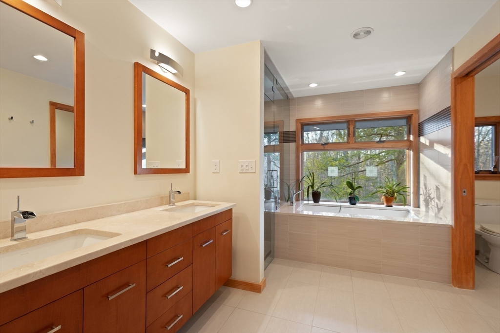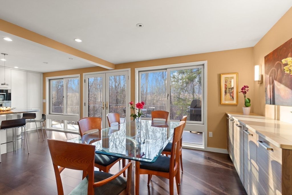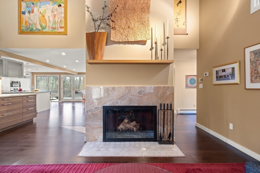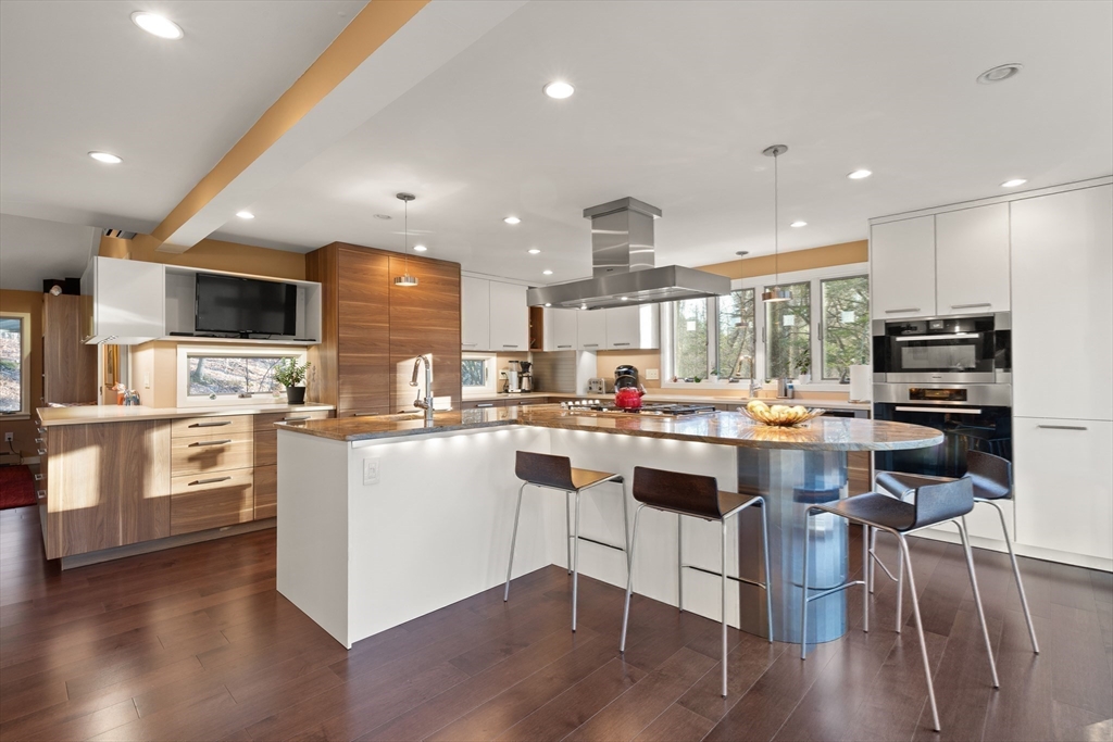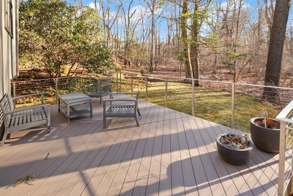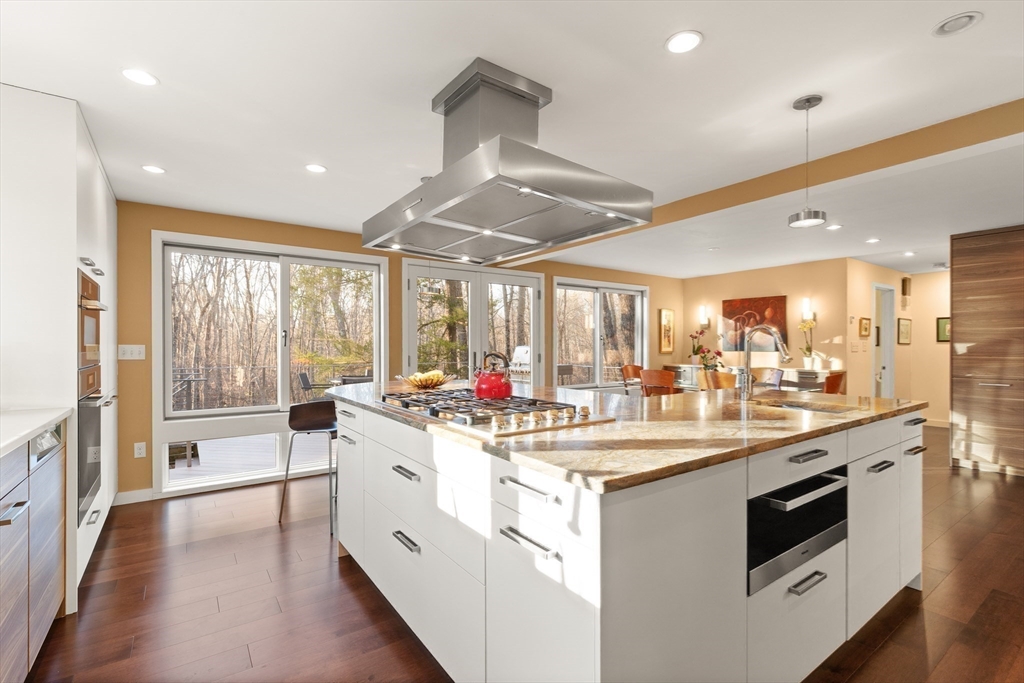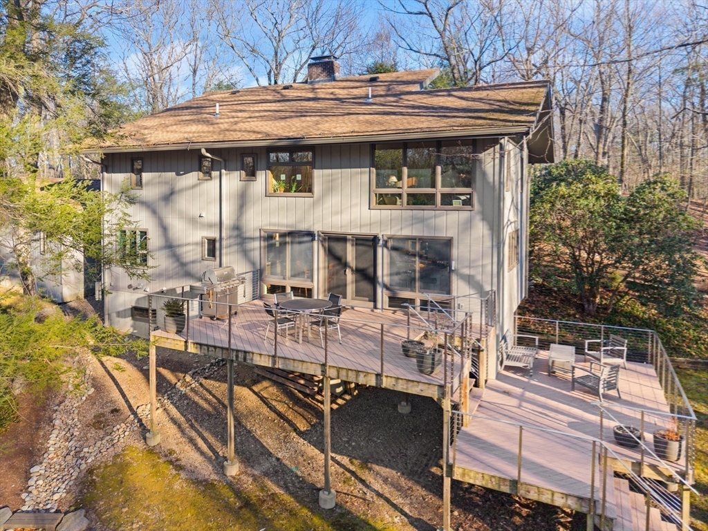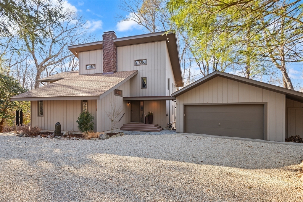 A STUNNING HOME ON A PRIVATE SETTING (4.6 acres) w/ an AMAZING ARRAY OF HIGH END FEATURES. OPEN FLOOR PLAN. Abundant NATURAL LIGHT. 500+ sq ft ADDITION IN 2013 which inc.EXPANSION OF KITCHEN/DINING AREA, PRIMARY BEDROOM & SPA BATH, & MASSIVE TWO STORY DECK. METICULOUSLY MAINTAINED HOME. 3 BRs, 3 FULL BATHS + 1ST FLOOR DEN including1st floor FULL BATH. OPEN FLOOR PLAN - CHEF Kitchen w/ Leicht Cabinetry, Thermador Refrig. & Freezer, MIELE Ovens, Miele Warming Drawer & Miele Dishwasher. ISLAND w/ 4 stools & PREP SINK. EXPANSIVE 19' x 12' DINING AREA w/ Built-In Credenza & 8' Wall of Cabinets. Wall of windows w/French Doors Opens to Two Tier Deck & Views of Good Sized YARD & WOODS w/ CHARMING WOODEN PATH to hiking trails . CATH CEILING 19' x 16' Living Room. HARDWOOD FLOORS. The 2nd Floor includes: Spectacular Cath Ceiling PRIMARY BEDROOM Spa Bath & 2 more bedrooms & FULL BATH. WALK-OUT Lower Level inc. 20' x 18' Family Rm, Laundry Rm & Storage. OVERSIZED 2 Car Garage + addl space.