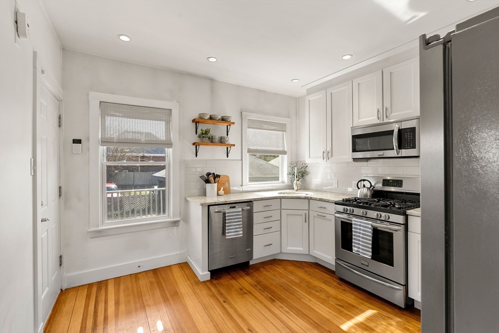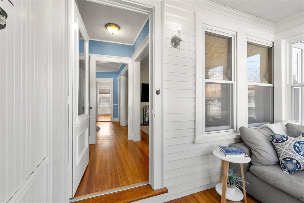 Spring welcomes you to this beautifully updated two-bedroom, one-bath condominium that perfectly balances timeless charm with modern comfort. Designed for effortless single-level living, the home features a renovated kitchen with stainless steel appliances, updated cabinetry, and sleek granite countertops, along with a generous pantry ideal for keeping everything neatly organized. Sunlight pours into the living room and bedrooms, highlighting high ceilings, classic moldings, chair rails, and rich hardwood floors throughout. Begin your mornings on the enclosed front porch with a cup of coffee, or unwind in the evening on the back deck during warm summer nights. Notable updates include a new roof (2020), updated windows, ductless mini-split air conditioning, Wi-Fi-enabled Nest heating, and off-street parking. Conveniently located just minutes from Blue Hills nature trails, restaurants, shopping, and major highway access, this lovely home offers both comfort and convenience.