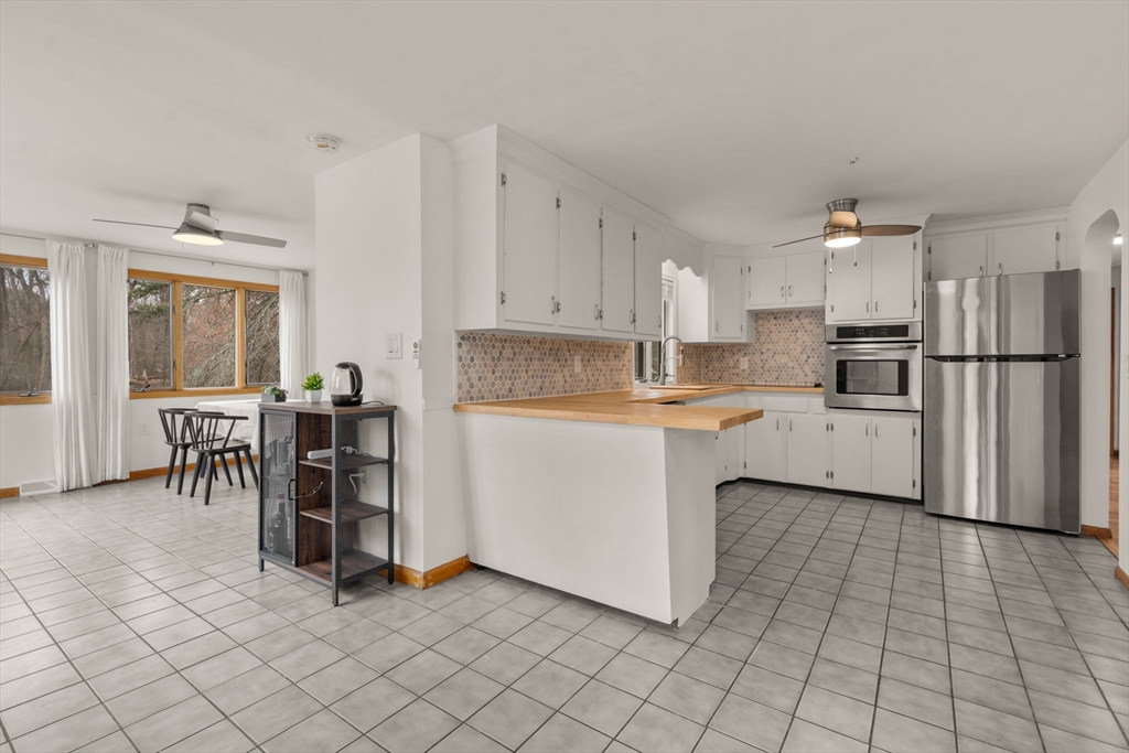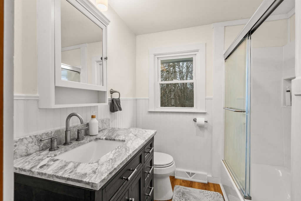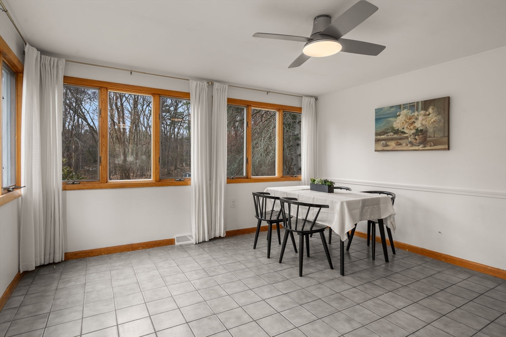 Welcome to this charming single-family ranch in desirable Burlington, offering comfort, updates, and great outdoor space. This 7+-room home features 3 bedrooms and 1.5 renovated baths, along with hardwood floors. The updated kitchen includes new countertops, sink, stovetop, and refrigerator, which connects to the dining room. A bright living room with fireplace sets this house apart. The finished lower level has a spacious family room with wood stove, half bath and office nook. Recent upgrades include a new central heat and A/C heat pump system and a B-Dry system for added peace of mind. The walkout basement offers a large storage space and workshop with additional potential. Enjoy the expansive backyard with patio and fire pit—perfect for entertaining. A horseshoe driveway provides ample parking for 4 cars. Conveniently located near the town reservoir and conservation land with walking and jogging trails, this home combines nature, comfort, and convenience. Open House 4/18-12PM to 1PM