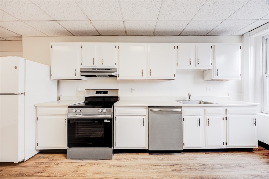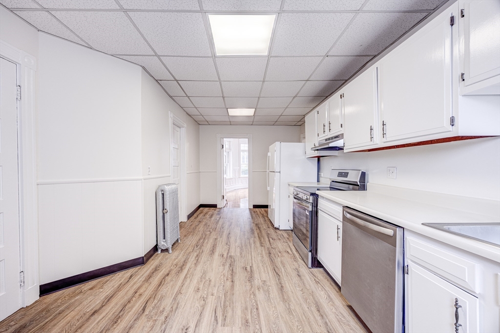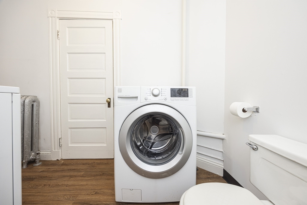 Discover this charming and sun-filled parlor-level Brookline residence that exudes historic character... This inviting home features gleaming hardwood floors, high ceilings, abundant natural light, and elegant period details throughout. The spacious living room offers wide windows, decorative molding, a fireplace, and an adjoining nook ideal for a home office or reading area. The dining room showcases turret windows, a built-in china cabinet, and classic charm. The eat-in kitchen includes newer appliances, and ample cabinet storage and prep space, plus a half bath with in-unit laundry. 2 generously sized bedrooms and a full bath complete the main level. The lower level offers over 550 sq ft. of additional space with a wall of windows, ready for future expansion or customization. Private parking, shared outdoor space, quick access to the T, and proximity to parks, schools, shops, and dining complete this wonderful home.