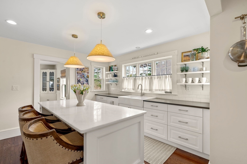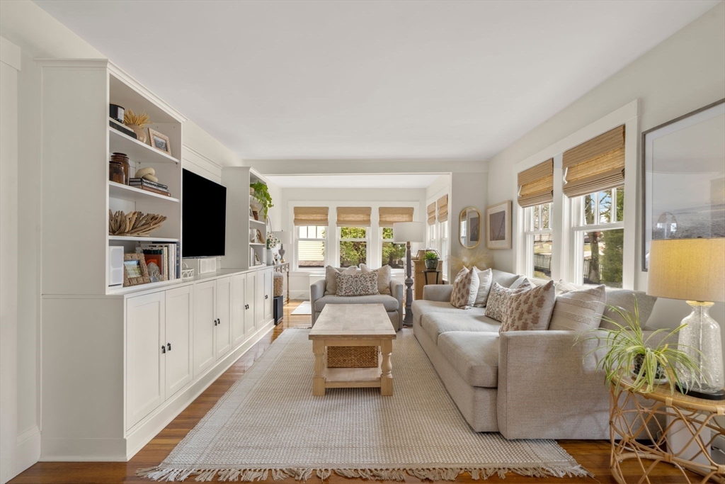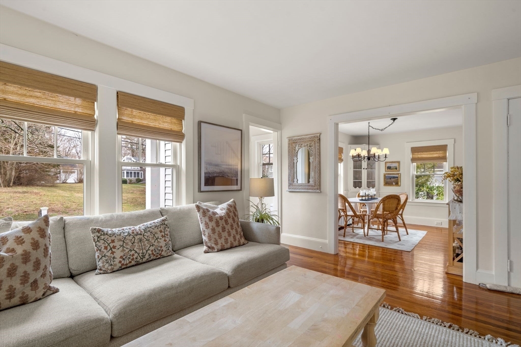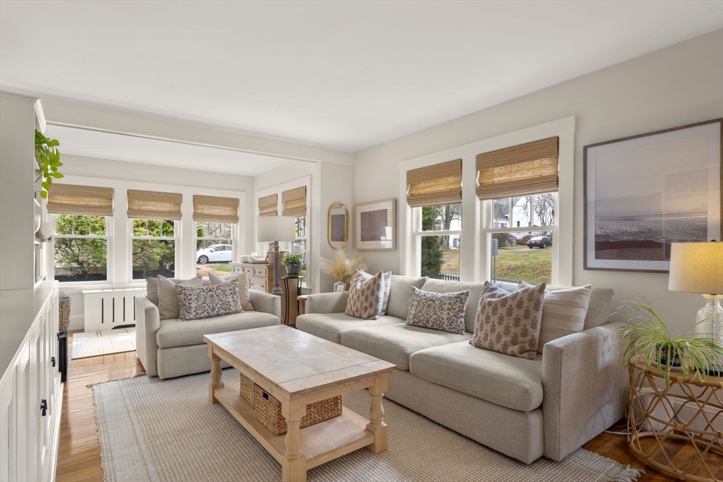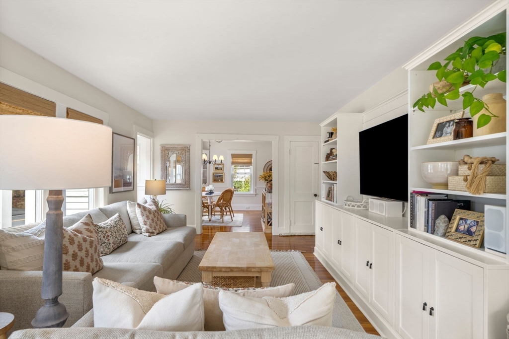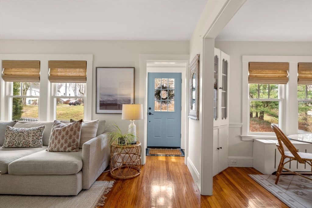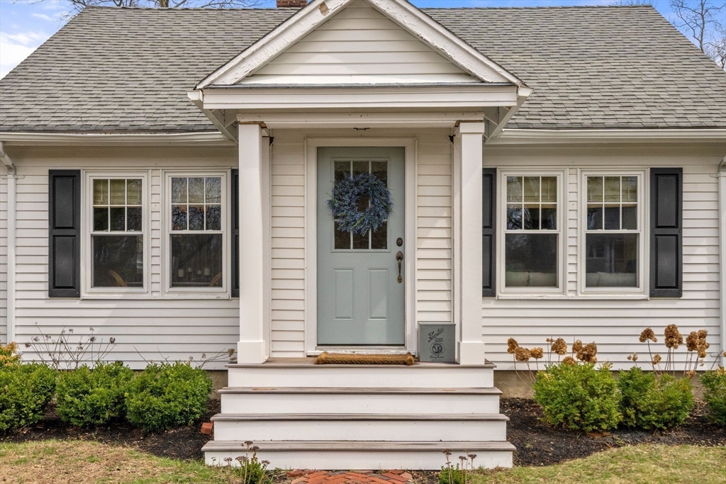 Quintessential New England Cape, beautifully redesigned for today’s modern lifestyle. Ideally located in the heart of town, just a short stroll to schools, Rec. Dept, library, ball fields, and town common. Enter through the newly finished covered porch into a spacious mudroom addition with custom laundry and built-in storage. The stunning designer kitchen showcases rich hardwood floors, an oversized island with polished marble countertops, crisp white cabinetry, and sleek stainless appliances. A sun-filled dining room blends original woodwork and built-ins with stylish updated lighting. The expanded living room offers generous space for entertaining, plus room for a play area or cozy reading nook. Large first-floor bedroom and full bath with glass-enclosed tiled shower provide flexible living options. Upstairs features three additional bedrooms and a full bath with soaking tub. Full basement, two-car garage, and expanded yard with deck perfect for summer cookouts after the beach.
