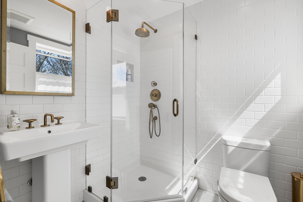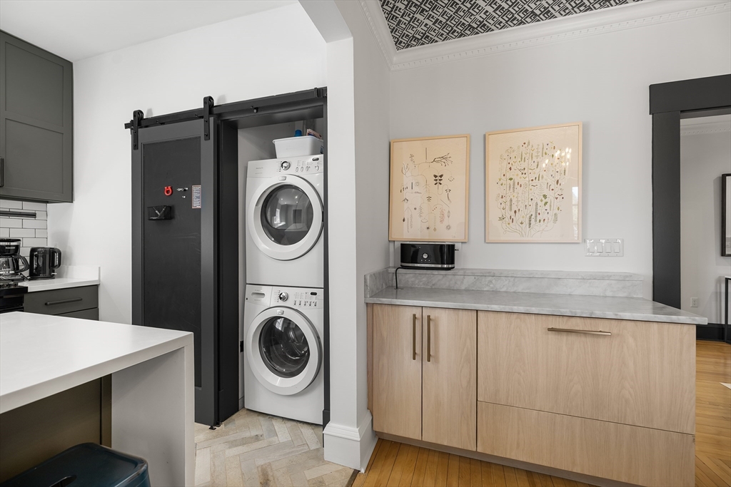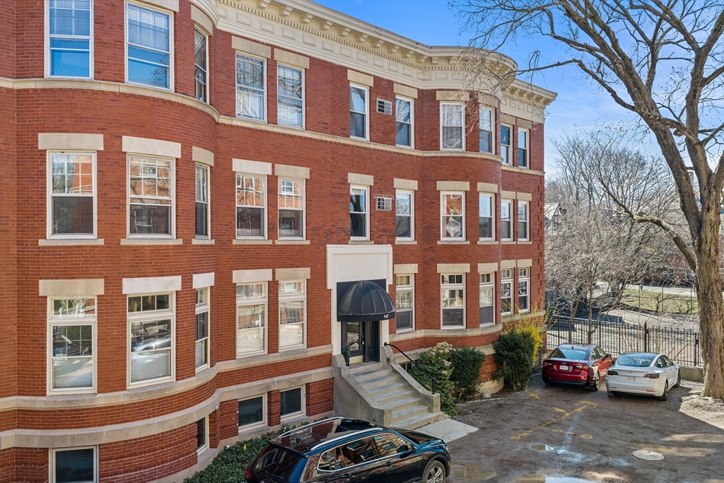This designer-renovated end unit offers a rare blend of historic charm and modern sophistication, featuring high ceilings, maple flooring, and unique fixtures illuminated by three sides of sun-drenched exposures (West, East & South). Freshly painted in 2026, the versatile floor plan flows from a spacious bow-front living room into an integrated dining area, which opens onto a private deck perfect for morning coffee. The gourmet kitchen shines with white corian countertops, gas stove, and paneled dishwasher and refrigerator while three generous bedrooms, two full baths, and the convenience of in-unit laundry provide effortless living. Tucked away on a quiet private way with off-street parking directly at your door, this home is adjacent to Lawrence School’s park and tennis courts. Enjoy a prime location with easy access to the T, Longwood Medical Area, Coolidge Corner, and Brookline Village. As a bonus, this unit is complemented by two large storage rooms in the basement.