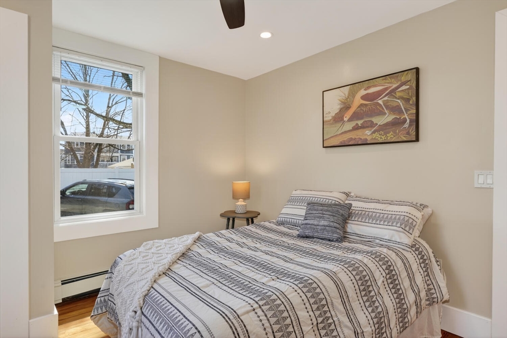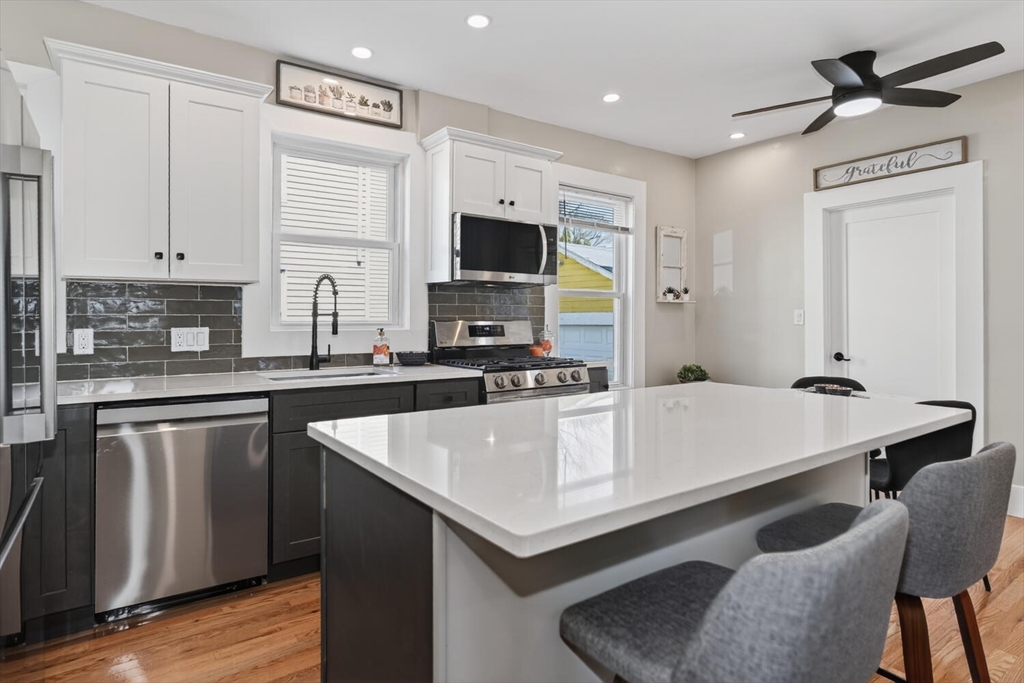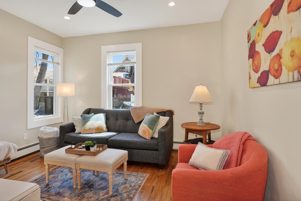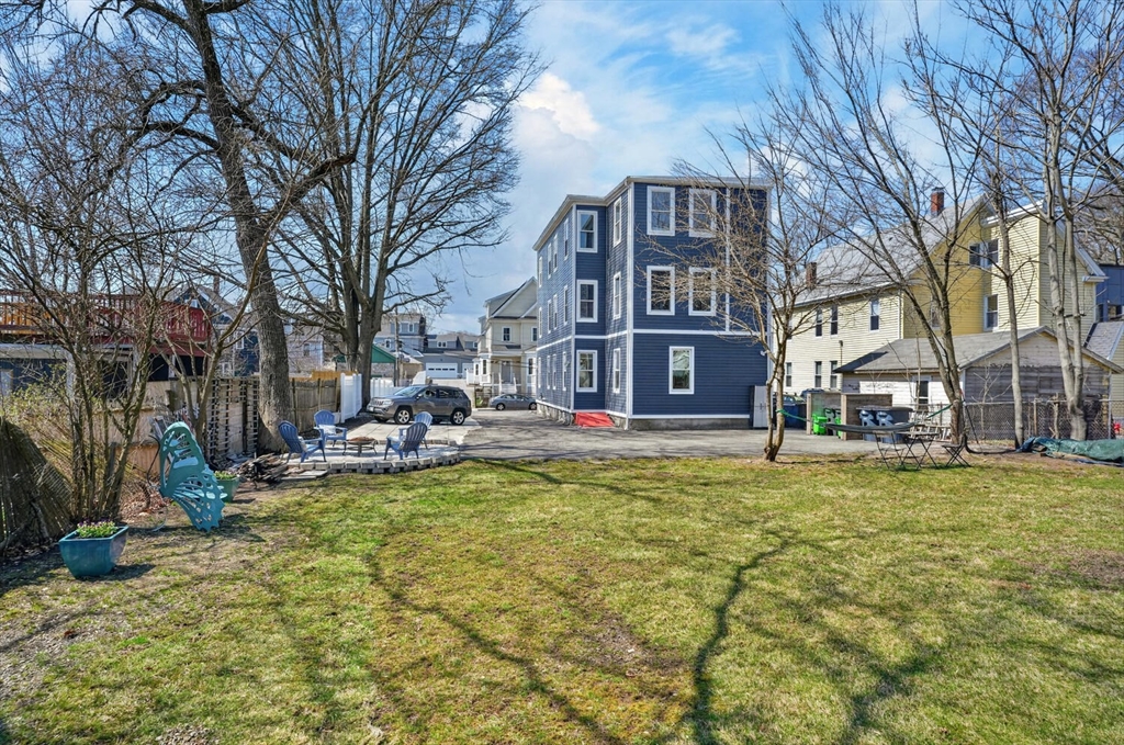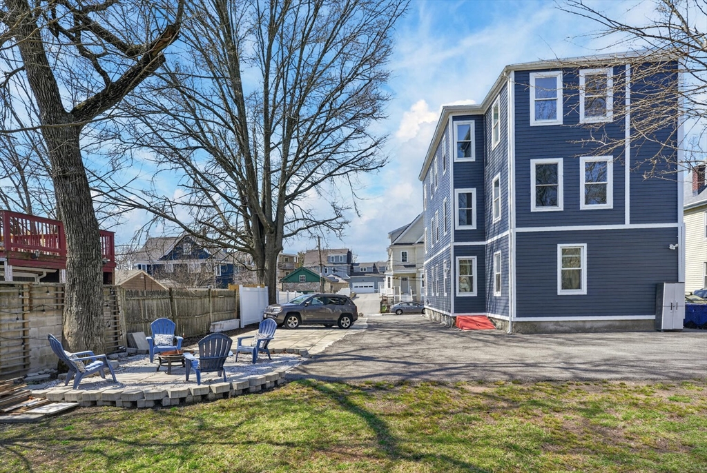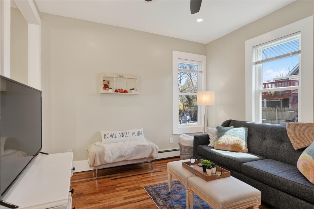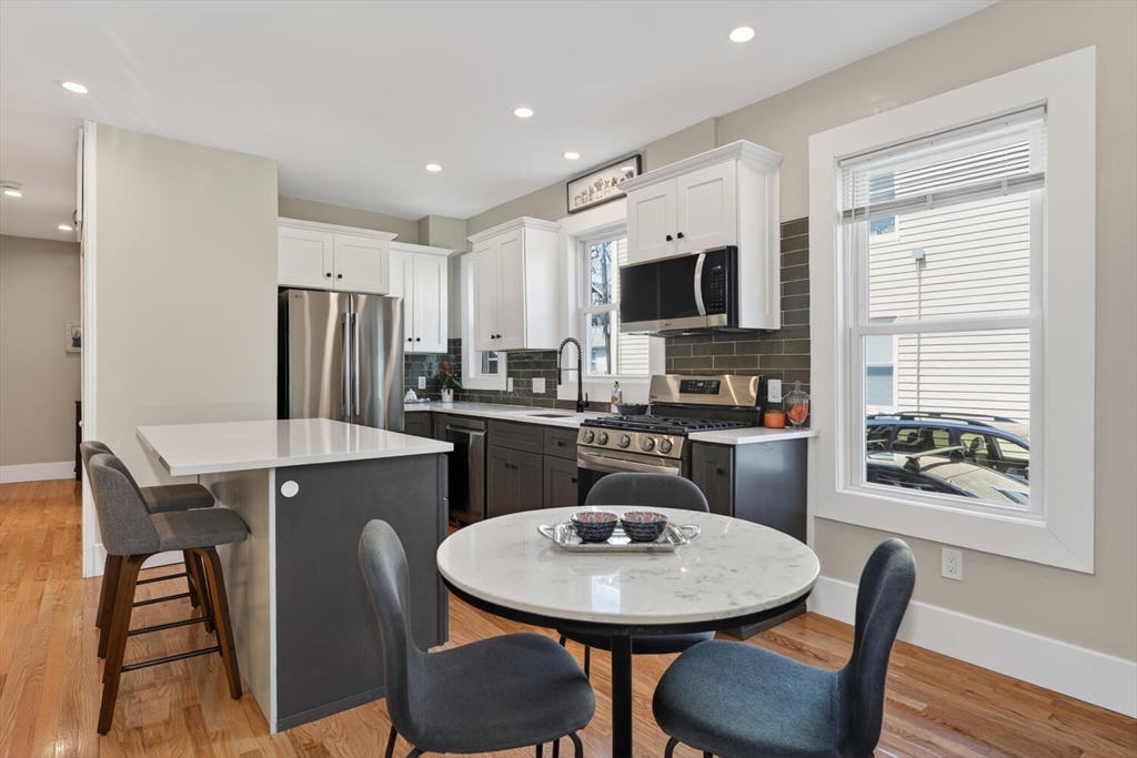 An Urban Oasis in Woodbourne. Discover a rare find: a stunning 3-bed, 2-bath condo tucked on a quiet dead-end street with a sprawling 3,000+ sq ft shared backyard and patio. Step inside to a sun-splashed home fully transformed from top to bottom. Soaring ceilings, gleaming hardwoods, and oversized windows create an airy, inviting feel. The showstopping open-concept kitchen features white shaker cabinetry, a large island, quartz countertops, and stainless appliances — perfect for everyday living and entertaining. The retreat-like primary suite offers a brand-new ensuite bath, while two additional bedrooms provide great space and flexibility. Enjoy peace of mind with extensive building updates including new siding, roof, windows, front porch, blown-in insulation, and high-efficiency heating. Additional perks include in-unit laundry, two deeded parking spaces, and ~200 sq. ft. of private storage. All near Forest Hills, the Arboretum, and JP/Roslindale dining. Your urban sanctuary awaits!