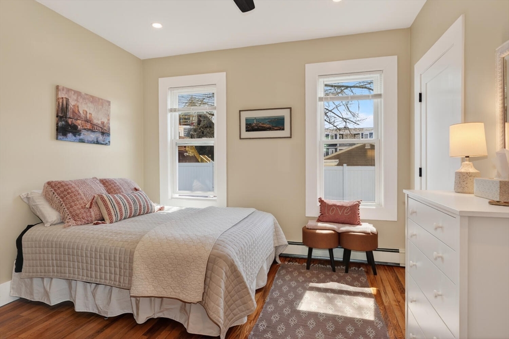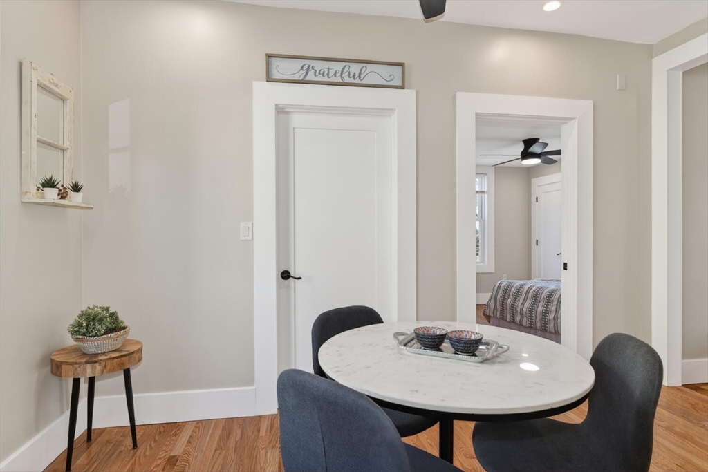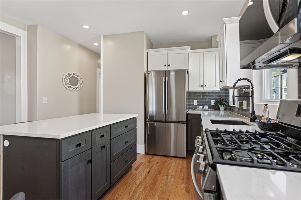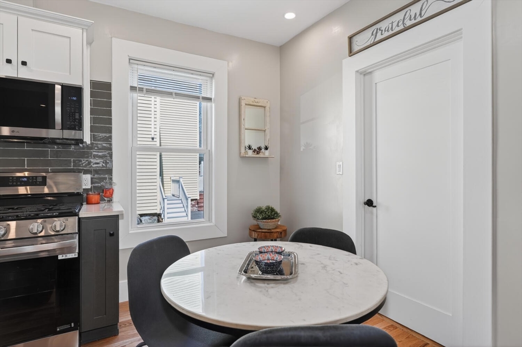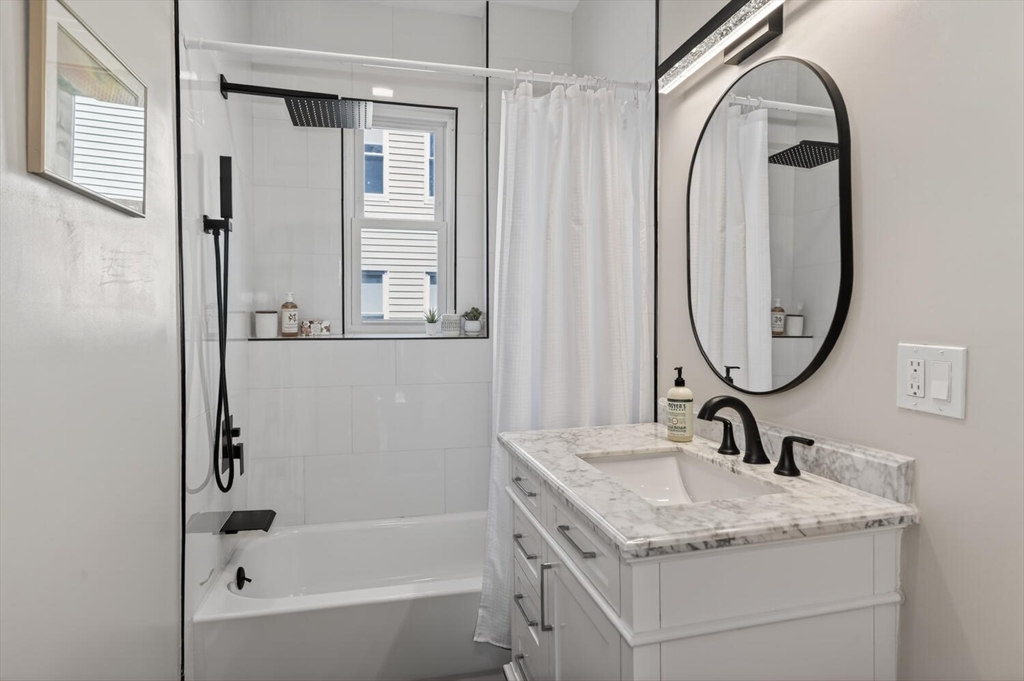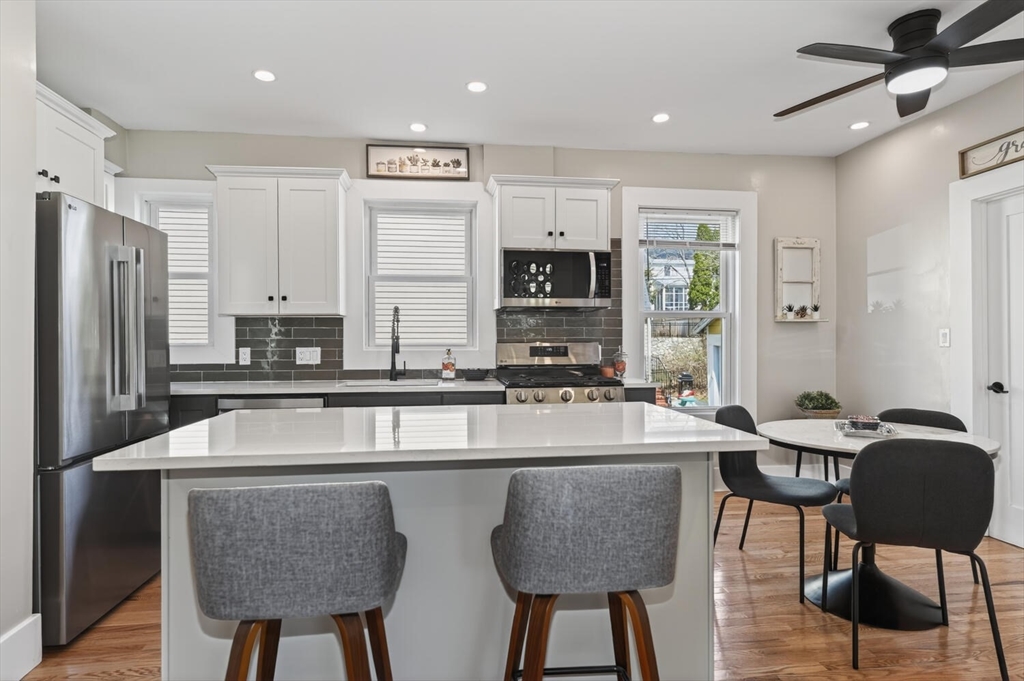 An Urban Oasis in Woodbourne. Discover a rare find: a stunning 3-bed, 2-bath condo tucked on a quiet dead-end street with a sprawling 3,000+ sq ft shared backyard and patio. Step inside to a sun-splashed home fully transformed from top to bottom. Soaring ceilings, gleaming hardwoods, and oversized windows create an airy, inviting feel. The showstopping open-concept kitchen features white shaker cabinetry, a large island, quartz countertops, and stainless appliances — perfect for everyday living and entertaining. The retreat-like primary suite offers a brand-new ensuite bath, while two additional bedrooms provide great space and flexibility. Enjoy peace of mind with extensive building updates including new siding, roof, windows, front porch, blown-in insulation, and high-efficiency heating. Additional perks include in-unit laundry, two deeded parking spaces, and ~200 sq. ft. of private storage. All near Forest Hills, the Arboretum, and JP/Roslindale dining. Your urban sanctuary awaits!