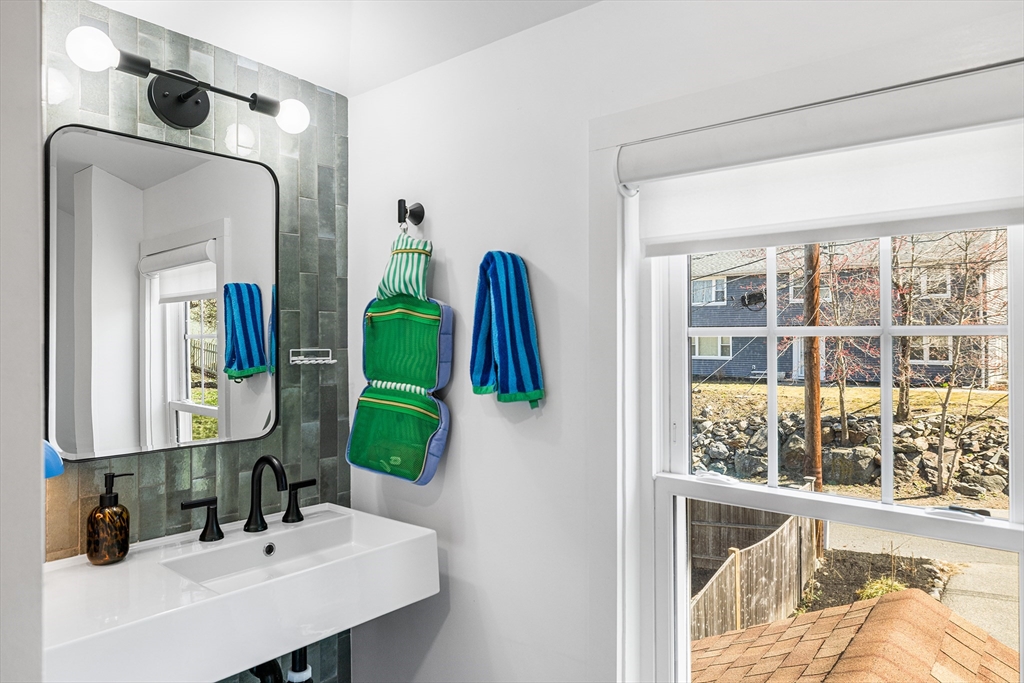 Nestled on a quiet Greenwood side street in a sought-after neighborhood, this updated 3-bedroom Colonial offers a perfect blend of comfort and style. The sunny living room features crown molding and hardwood floors, flowing into a formal dining room ideal for gatherings. The updated kitchen boasts stainless steel appliances, painted cabinets, and easy access to a full-length bonus family room with a mini split system and a convenient half bath. Sliders lead to a spacious deck overlooking a private backyard oasis with a mix of sun and shade, a firepit area, a large grassy yard, garden space, and a dedicated dog pen. Upstairs, enjoy a renovated 2023 bathroom with stylish tile, a deep tub with glass doors, and built-in storage. Major updates include furnace, oil tank, hot water heater, and 200 amp electric (2022), plus new windows (2024). Minutes to dining, parks, commuter rail, and bus service.