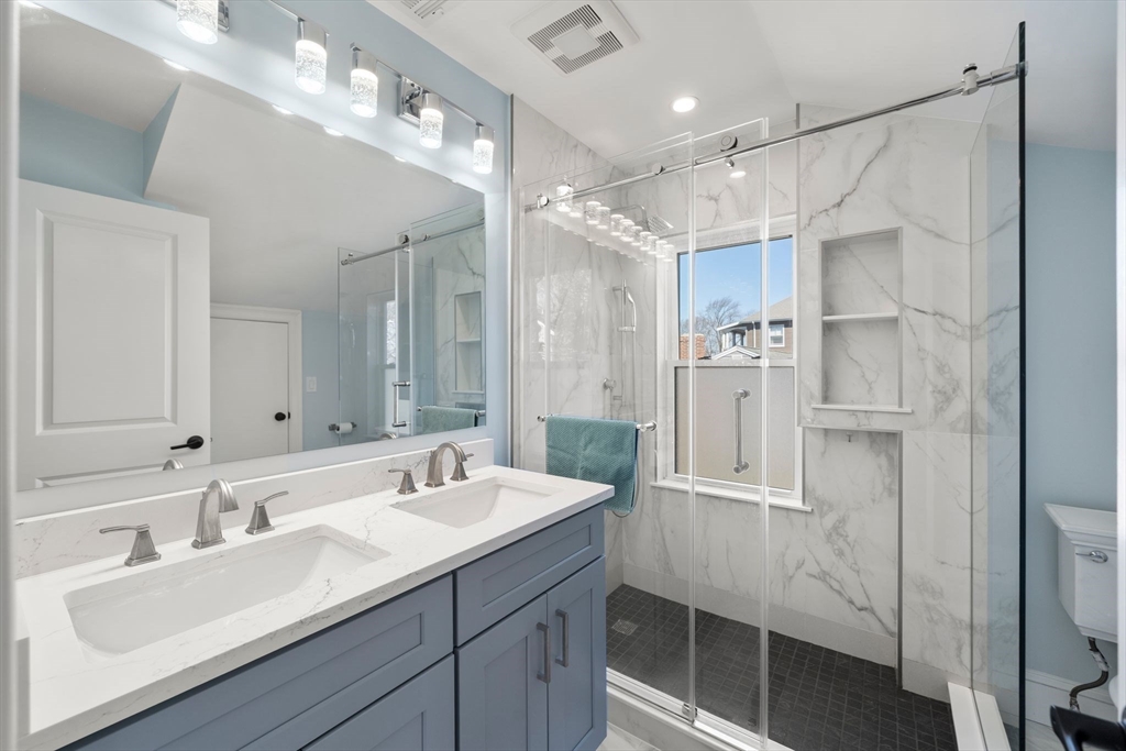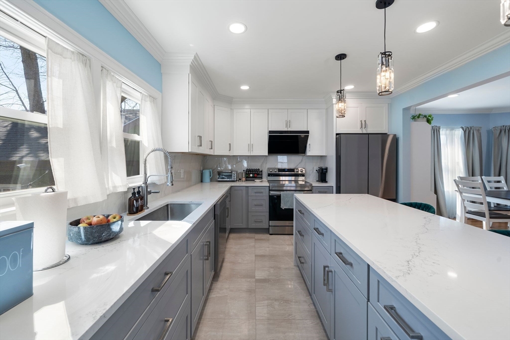 Sophisticated and fully renovated in 2024, this exceptional North Weymouth residence offers refined living with every detail thoughtfully reimagined. The home features four generously sized bedrooms and three beautifully appointed full baths, including a serene primary suite with a walk-in closet and elegant double vanity. A stunning designer kitchen anchors the home, complete with premium stainless steel appliances, custom cabinetry, and striking waterfall countertops, seamlessly opening to sunlit living and dining spaces ideal for both everyday living and entertaining. A first-floor bedroom and full bath provide flexibility for guests or extended family. Outside, enjoy a spacious backyard perfect for relaxing or hosting, along with the convenience of dual driveways offering ample parking. A truly turnkey home combining style, comfort, and convenience.