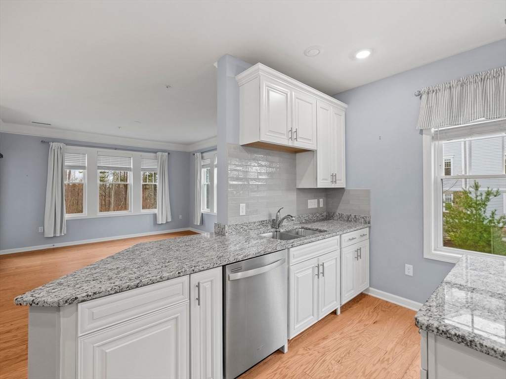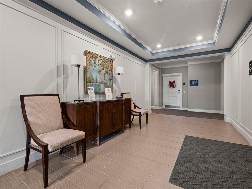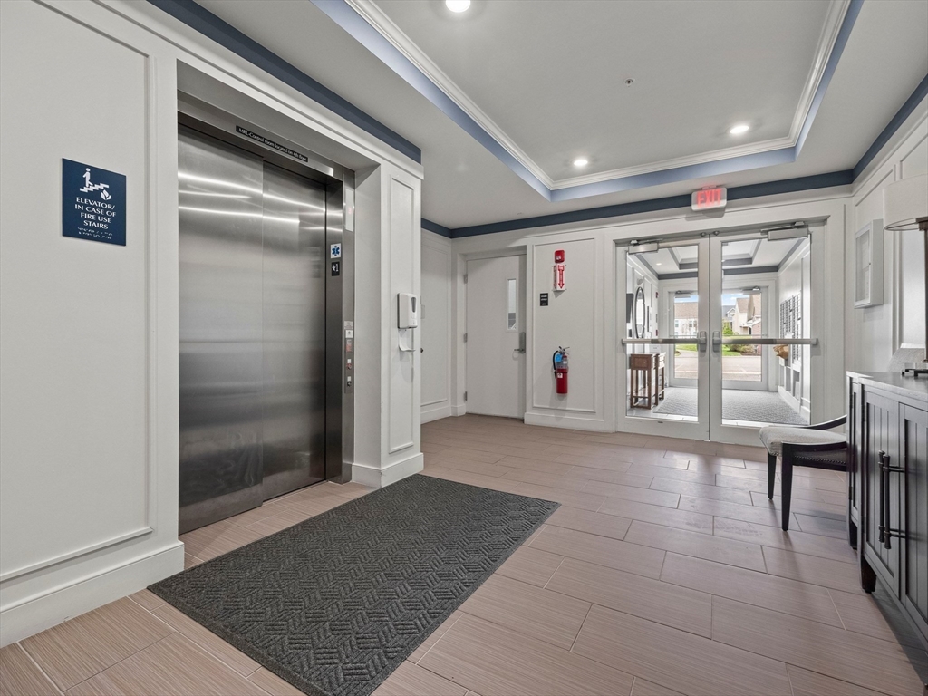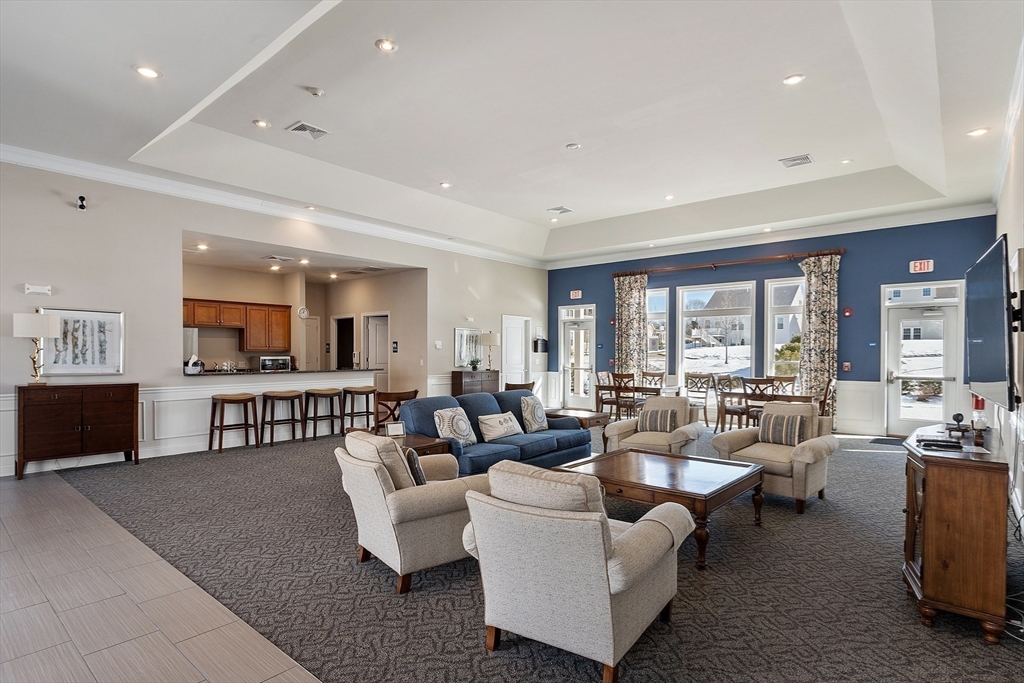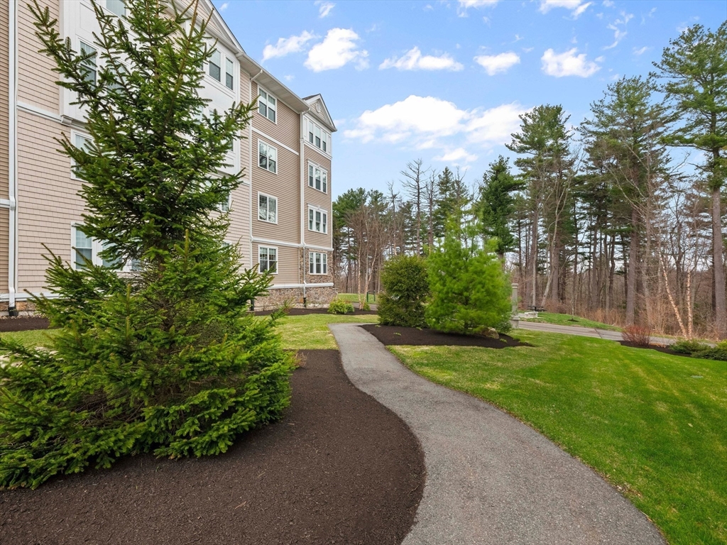 Riverside Woods – Vibrant Adult (62+) Community in a modern, secure building. This desirable first-floor, corner unit offers the ultimate in convenient living, just steps from the elevator and lobby. Enjoy the serene rear-facing setting with peaceful woodland views and direct access to walking paths along the Merrimack River. The open kitchen shines with white cabinetry, stone countertops, and a tasteful backsplash. The spacious living and dining area opens to a private balcony – perfect for morning coffee with nature as your backdrop. The generous primary ensuite and well-separated guest suite each offer privacy and ample space. Hardwood floors, recessed lighting, and crown molding add elegant finishing touches. Two garage parking spaces with additional storge complete the package. The community clubhouse features a fitness center and outdoor patio with grilling area. Easy, elegant living at its best!