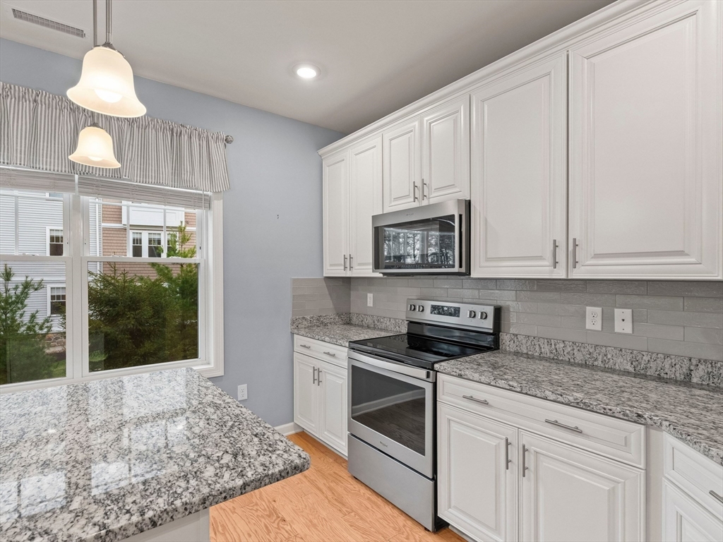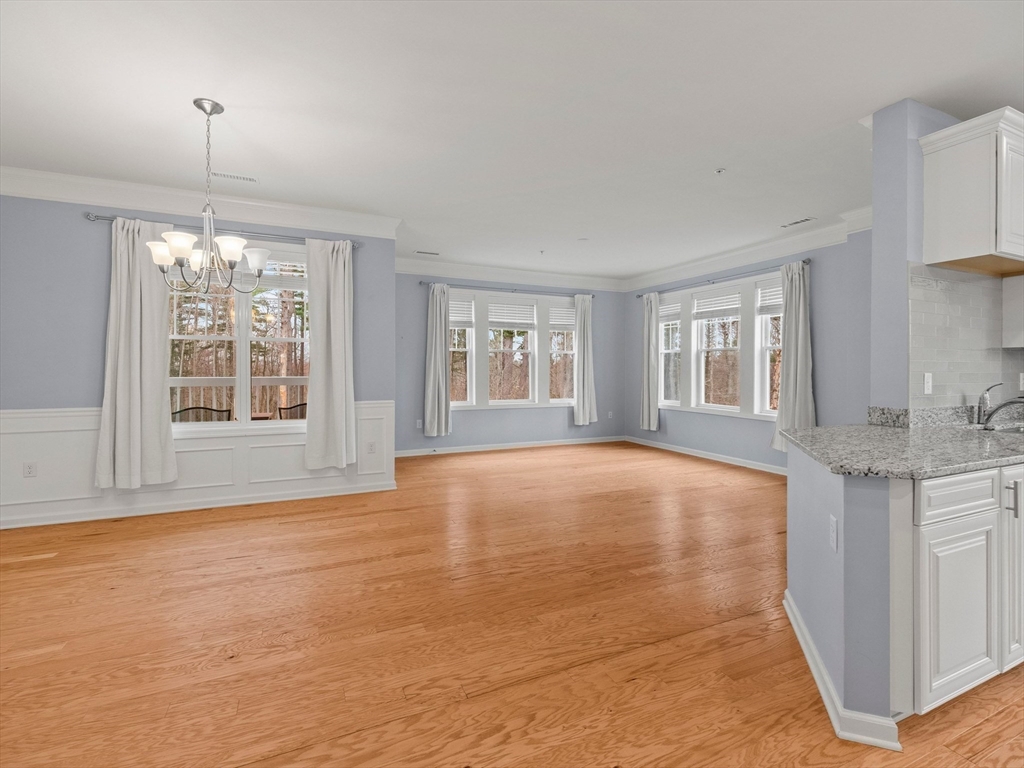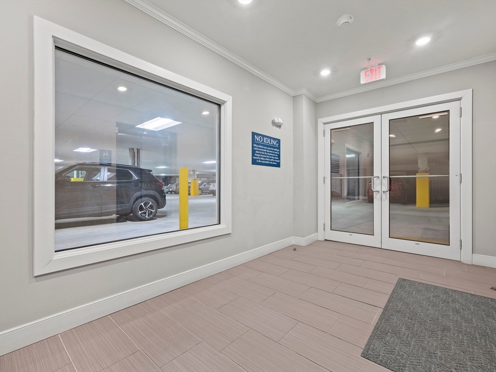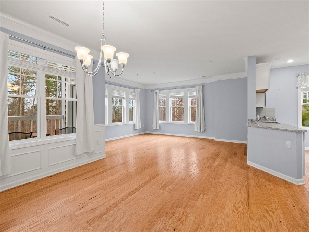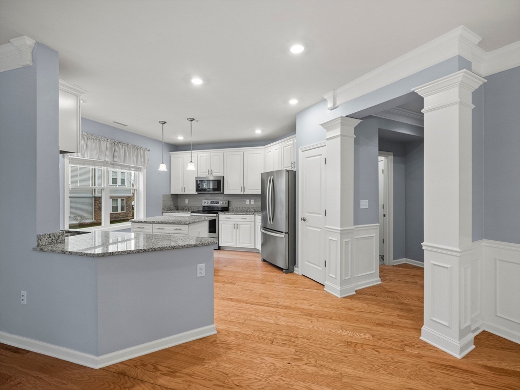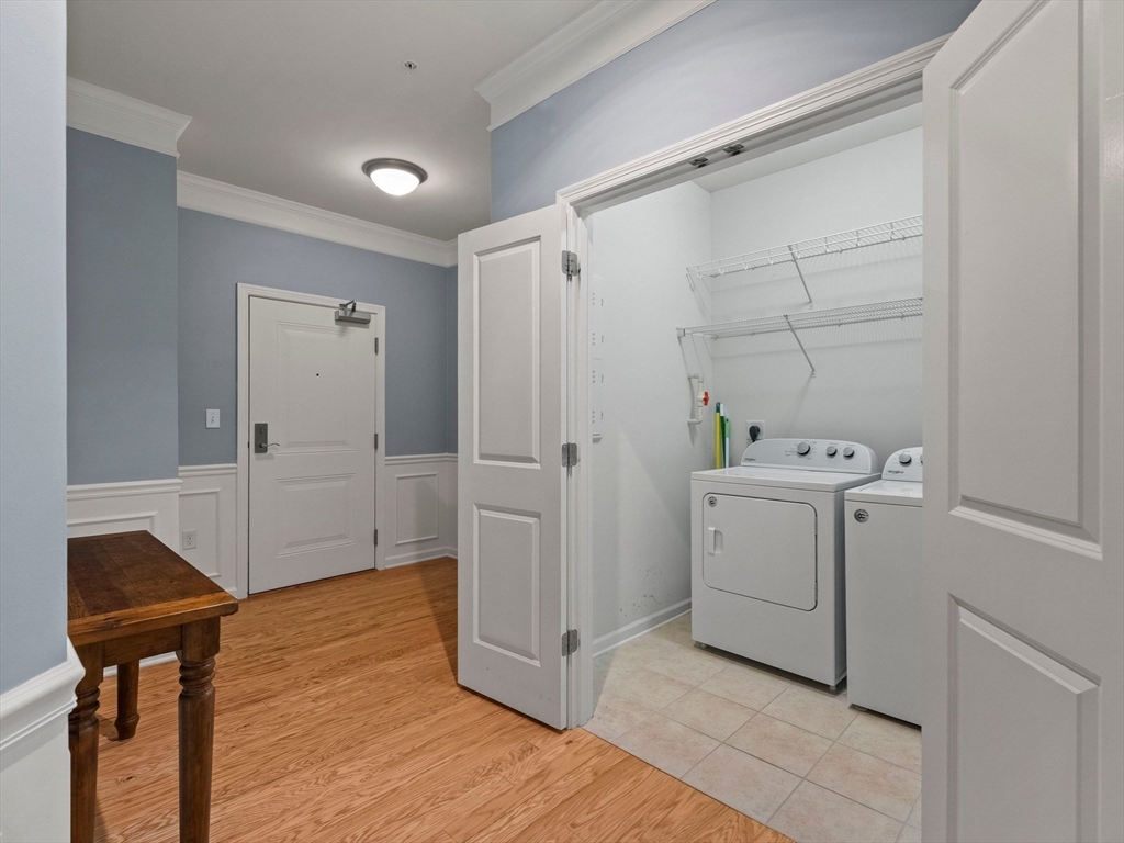 Riverside Woods – Vibrant Adult (62+) Community in a modern, secure building. This desirable first-floor, corner unit offers the ultimate in convenient living, just steps from the elevator and lobby. Enjoy the serene rear-facing setting with peaceful woodland views and direct access to walking paths along the Merrimack River. The open kitchen shines with white cabinetry, stone countertops, and a tasteful backsplash. The spacious living and dining area opens to a private balcony – perfect for morning coffee with nature as your backdrop. The generous primary ensuite and well-separated guest suite each offer privacy and ample space. Hardwood floors, recessed lighting, and crown molding add elegant finishing touches. Two garage parking spaces with additional storge complete the package. The community clubhouse features a fitness center and outdoor patio with grilling area. Easy, elegant living at its best!