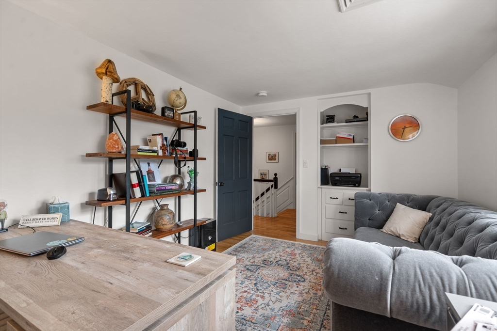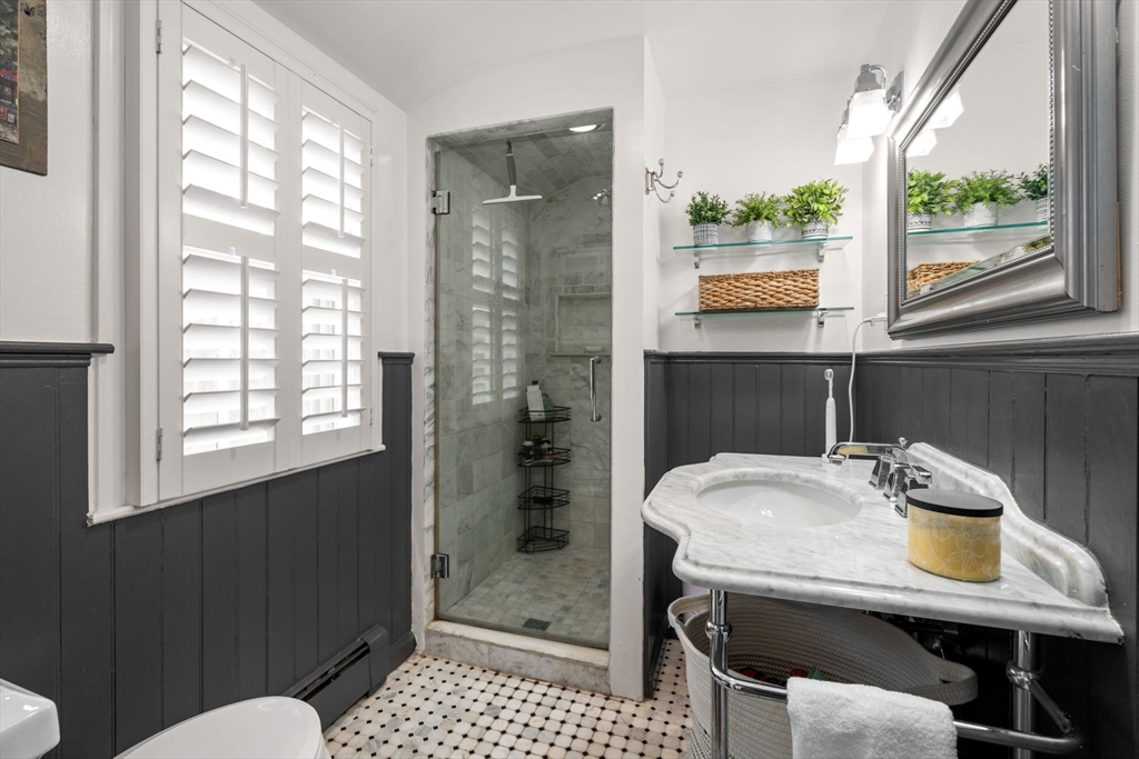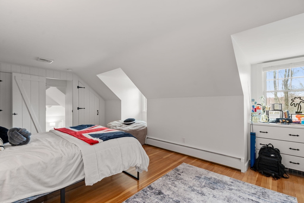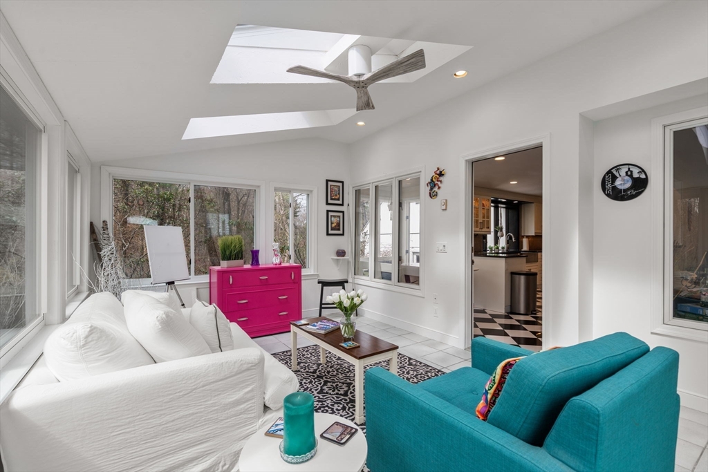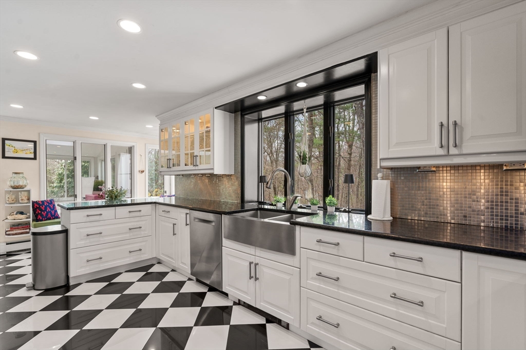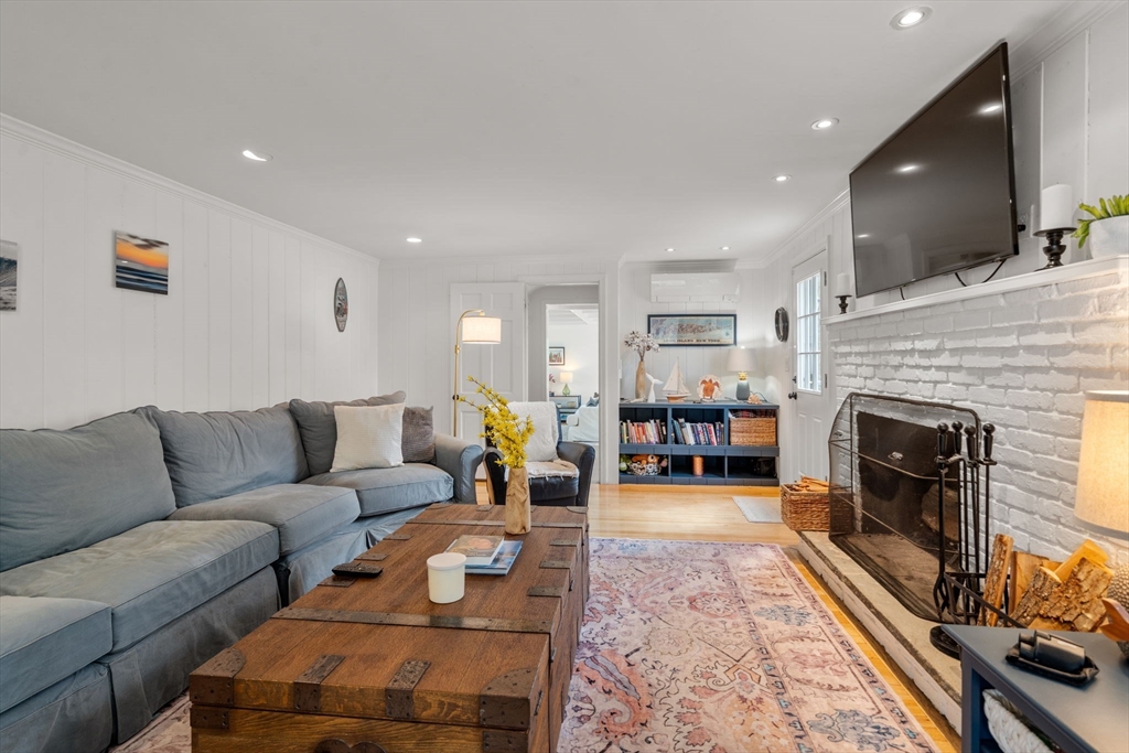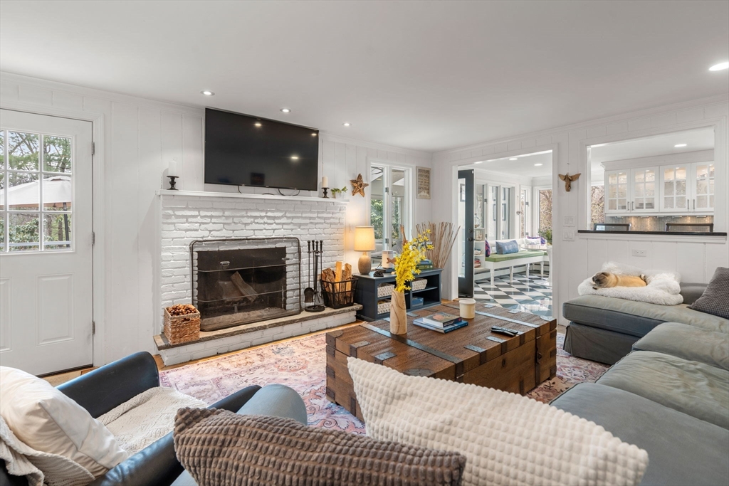 Expanded Cape seamlessly blending New England details with today's sought-after amenities. Welcoming entry foyer sets the tone w custom millwork and elegant turned banister. Generous floor plan flows effortlessly. Front-to-back living room w fireplace, striking coffered ceiling & custom built-ins leads to the family room anchored by 2nd wood-burning fireplace & more built-ins. The eat-in kitchen delights w built-in seating and walls of windows that bathe the space in natural light. Stainless steel appliances include gas cooktop, double sinks, apron sink and internally lit cabinetry. Built-ins continue thruout 2nd floor, offering style and function at every turn. All 4 bedrooms are located on this floor, including a versatile 2-room suite. The vaulted sunroom off the kitchen opens to a beautifully appointed outdoor retreat featuring stone patio, fire pit, koi pond, and protected garden. Finished lower level, including 3rd fireplace, offers endless flexibility to meet all your needs.
