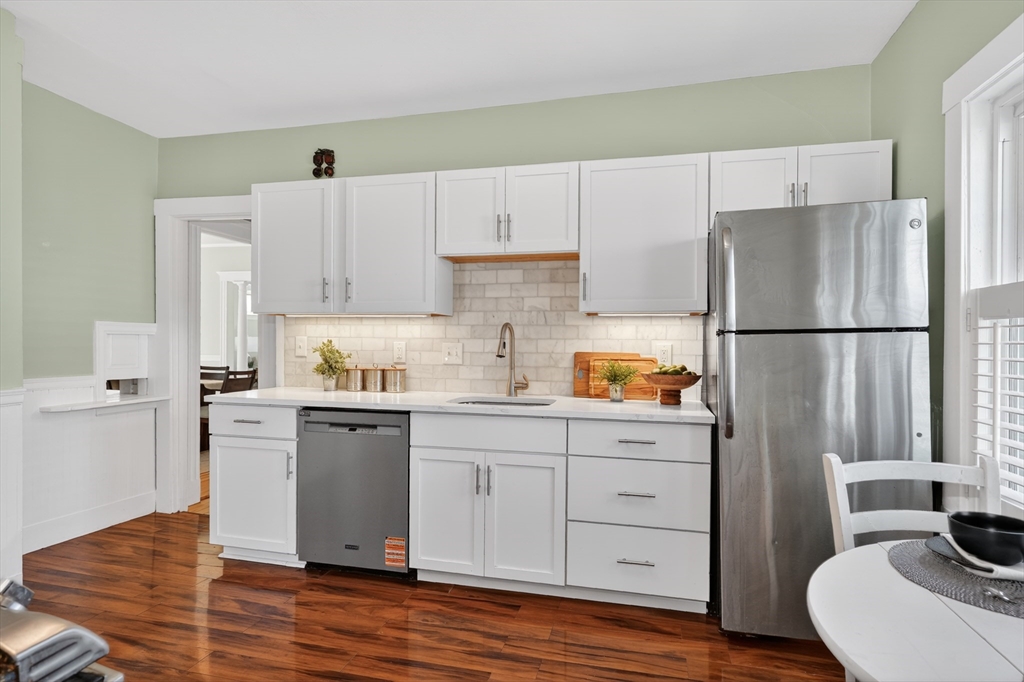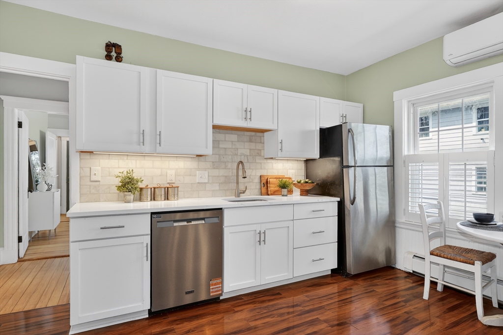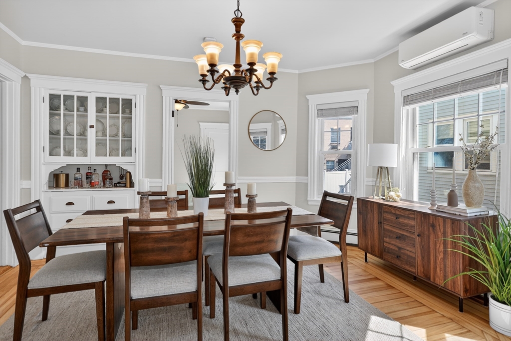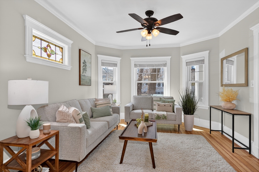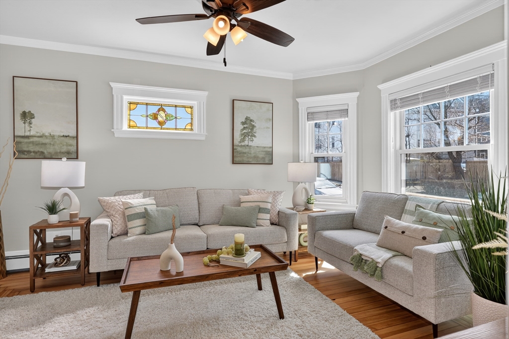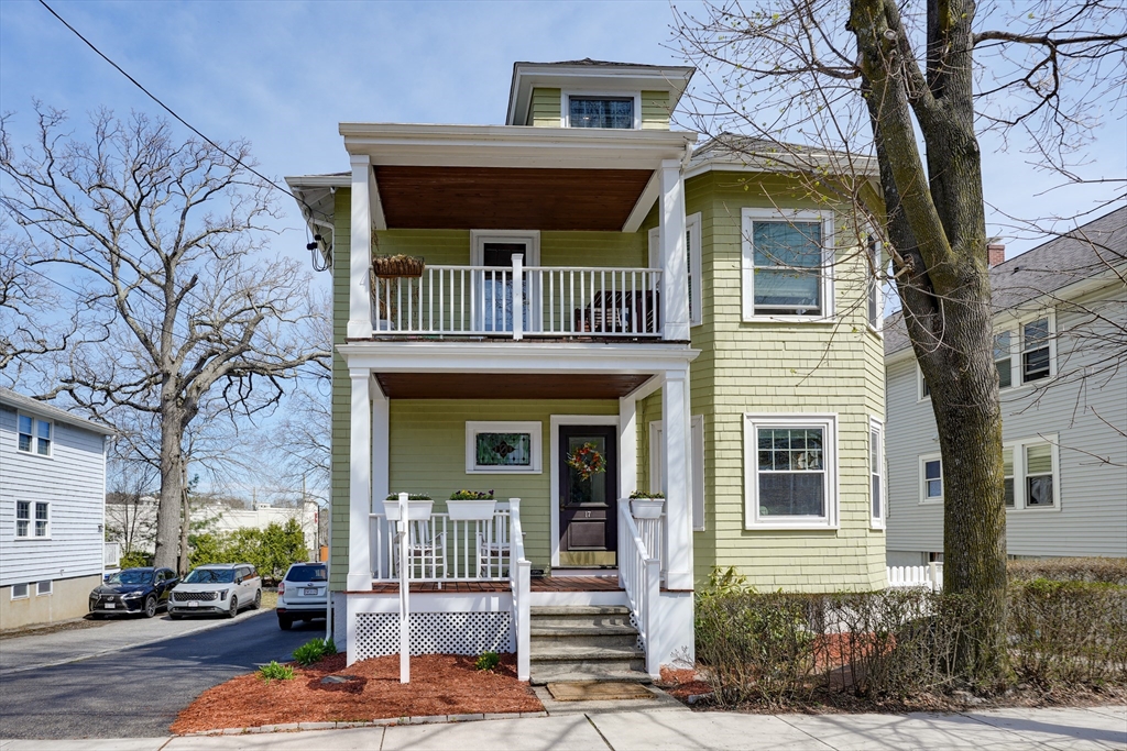 SELLERS ACCEPTED INCREDIBLE OFFER. OH's CANCELLED. Absolutely gorgeous first floor 2 bed/1 bath condo with bonus office/gym in lower level and room for more. Refinished floors, vinyl windows with custom blinds, renovated eat-in kitchen with gas stove and bath with fresh tile and fixtures, 2 original gorgeous stained glass windows, beautiful columns between living and dining rooms, built in china cabinet, in-unit laundry, artistic paint colors, great open layout, entryway & back mudrooms, front farmers porch and back sprawling porch for relaxing overlooking a lovely landscaped yard. Unencumbered side by side parking at end of driveway. Bedrooms, kitchen and LR have mini-splits for zone heating and cooling. Around the corner from the 73 busline stop to Harvard Sq, a huge playground with tennis, basketball, baseball and soccer fields and the famous Butler Elementary School. Just down the road from the commuter rail, many shops, stores, salons, fitness centers, dining options.