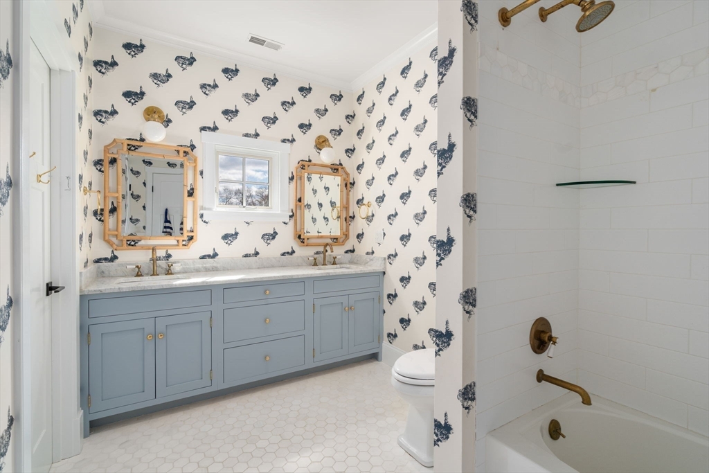 Fabulous custom home with Waterworks fixtures, designer wallpapers, lighting & hardware. Great opportunity to enjoy luxurious living in a coveted double cul-de-sac neighborhood close to new Hardy School, Morses Pond, Fells Market & exceptional restaurants/ shops. Well-designed space, featuring 10-foot ceilings, gourmet chef kitchen w/walk-in pantry & marble counters leads to beautiful dining & living room w/ exceptional finishes. FP w/ gorgeous marble tile. Stunning primary suite w/ new spa like bath w/steam shower, double walk-in closets. 4 additional light filled bedrooms provide generous space & comfortable ambiance & 2 full baths. Lower level includes spacious family/playroom, gym, plenty of storage, plus full bathroom. The house also has a two-car garage for convenient secure parking. Outside, enjoy spectacular private gardens & sunny stone patio, perfect for outdoor entertaining w/ family & friends. One of Wellesley's finest homes.