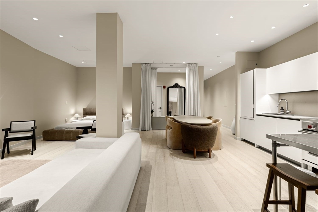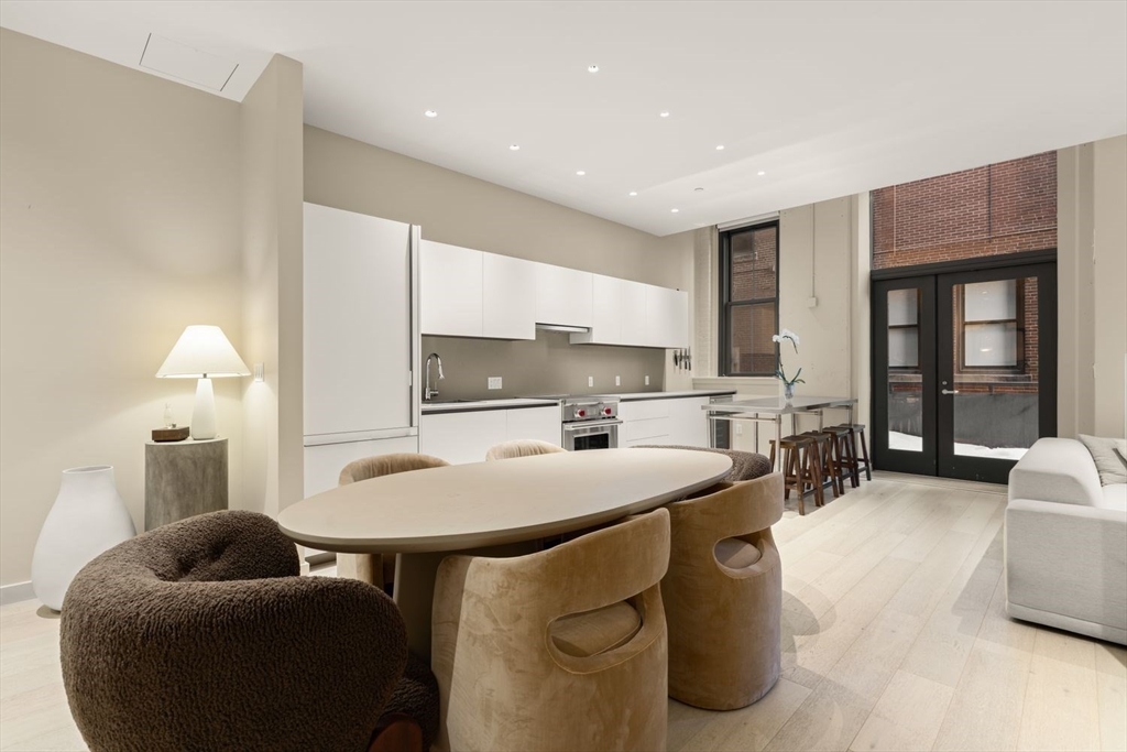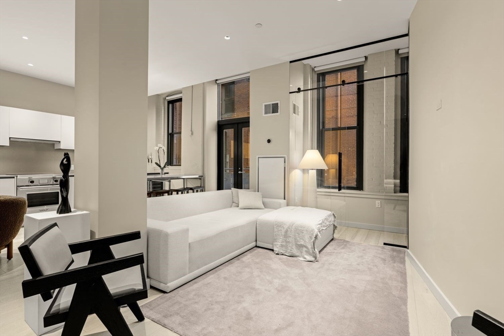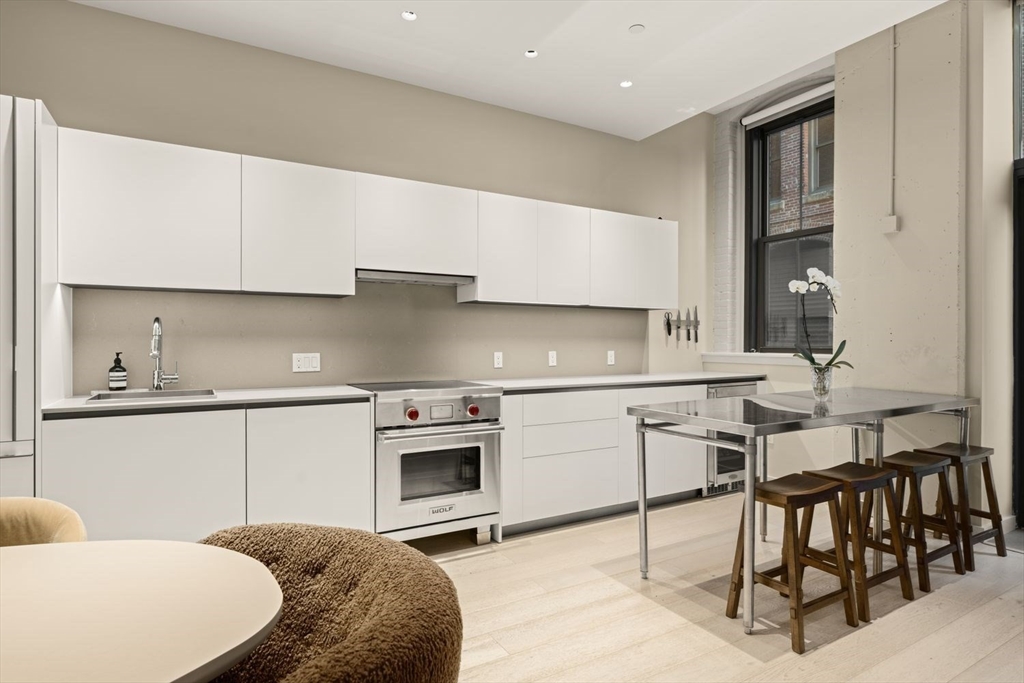 FP3 | Rare Loft-Style Living with Private Terrace in the Heart of SeaportExpansive and design-forward, this rarely available FP3 residence offers a true loft-style layout with soaring ceilings, floor-to-ceiling windows, and a private outdoor terrace in Boston’s most dynamic neighborhood.Bathed in natural light, the open-concept living space showcases wide-plank oak flooring and a refined, modern palette. The kitchen is both sculptural and functional, featuring custom cabinetry and premium appliances including a Wolf range, Bosch refrigerator and dishwasher, and Marvel wine fridge—ideal for both everyday living and entertaining.The bedroom is thoughtfully positioned for privacy and comfort, complemented by a spa-inspired bathroom with radiant heated floors. Additional features include integrated LED lighting, a built-in Molteni mirrored closet system, and in-unit laundry.