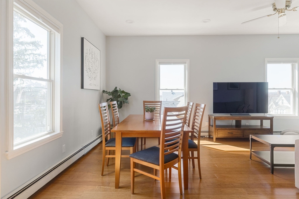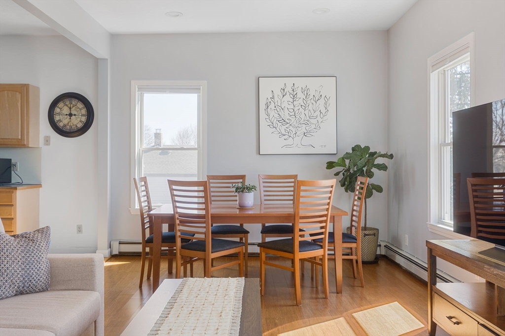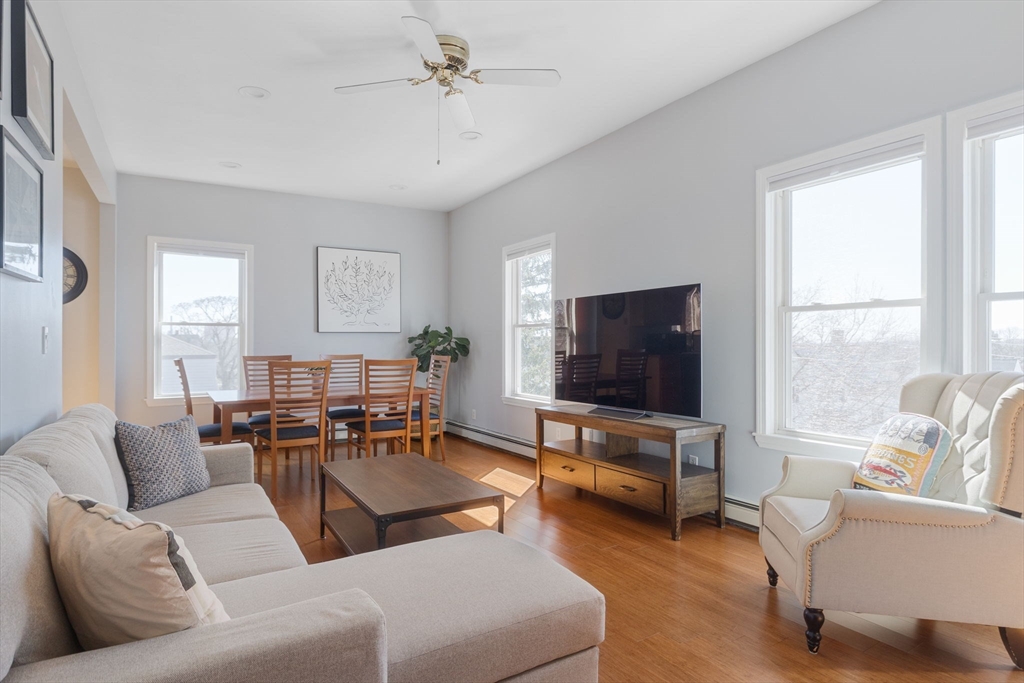 Ideally located in a well-connected pocket of Malden, this meticulously maintained top-floor residence features a spacious floor-through layout with modern updates, hardwood floors, in-unit laundry, and off-street parking. Two separate entrances with dedicated landings lead into a thoughtful layout, with the rear entry opening into a functional mudroom and laundry area with LG machines. This flows into an expansive kitchen with stainless GE and Whirlpool appliances, including a 5-burner gas range w/griddle. The space extends into a bright dining area and a living room with several exposures. The layout naturally separates entertaining areas from private retreats; two bedrooms feature four-exposure bay windows and deep closets, while a flexible third bedroom can serve as an ideal home office or guest room. With a full bath and a convenient powder room off the kitchen, this well-located condo provides effortless living near Malden Center, the Orange Line, Costco, Assembly Row, and I-93.