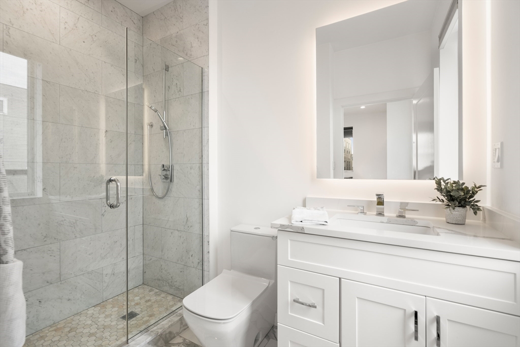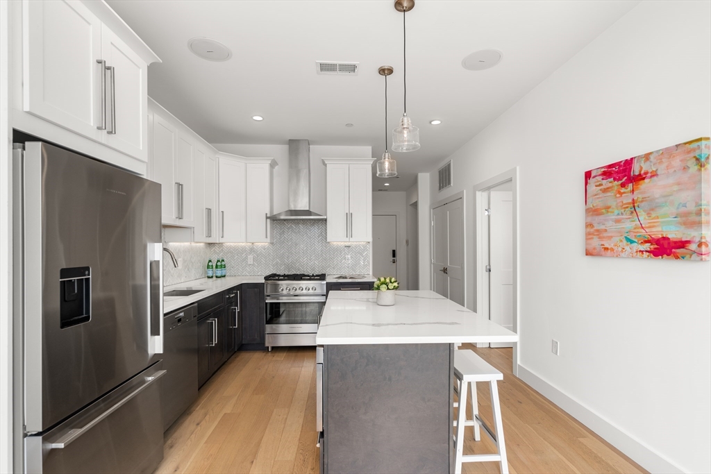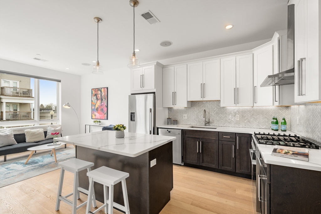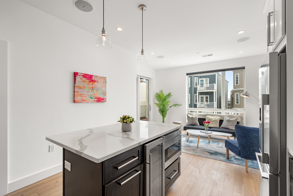 Welcome to Orient Heights! Beautifully designed 2-bed, 2-bath condo offering a refined take on East Boston living, with thoughtful finishes, in-unit laundry, and private outdoor space. Spanning 946 sq ft, the open kitchen, living, and dining area is centered around a sleek island with separate beverage fridge, ideal for both everyday living and entertaining. The kitchen features high-end appliances and custom cabinetry. A private deck extends the living space outdoors, creating a seamless indoor/outdoor flow. The well-proportioned bedrooms include a primary suite with en-suite bath, while the second bedroom offers flexibility for guests or a home office. One covered parking space is included. Ideally located near the Blue Line T and Constitution Beach, with easy access to local dining spots and everyday conveniences along Bennington Street, and a quick commute into downtown Boston.