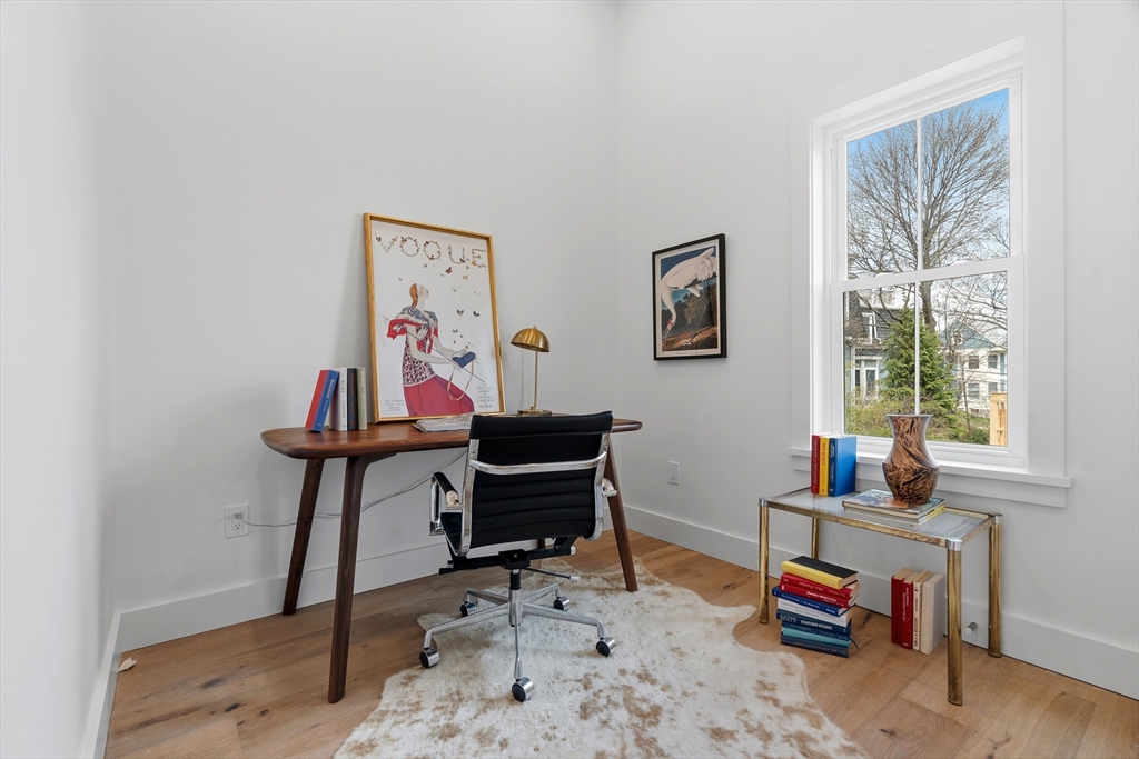 Elevated above the heart of Jamaica Plain in Hyde Square, this gut-renovated 3-bedroom, 2-bath penthouse delivers rare scale, light, and private outdoor living. Soaring 11+ ft ceilings and transom windows flood the open-concept layout, anchored by a sleek chef’s kitchen that flows into expansive living and dining spaces. The home extends seamlessly outdoors with a large private rear deck for dining and a true showpiece - a private roof deck with sweeping skyline views from Downtown Boston to the Blue Hills. A well-appointed primary suite and designer baths are complemented by central air, in-unit laundry, and all new systems including electrical, plumbing, and HVAC. Deeded parking for one adds everyday convenience, and the building is pet-friendly. Ideally located near Tres Gatos, Brendan Behan, Whole Foods, and just moments to Jamaica Pond, this is a rare opportunity to own a penthouse with scale, privacy, and views in one of JP’s most vibrant neighborhoods.