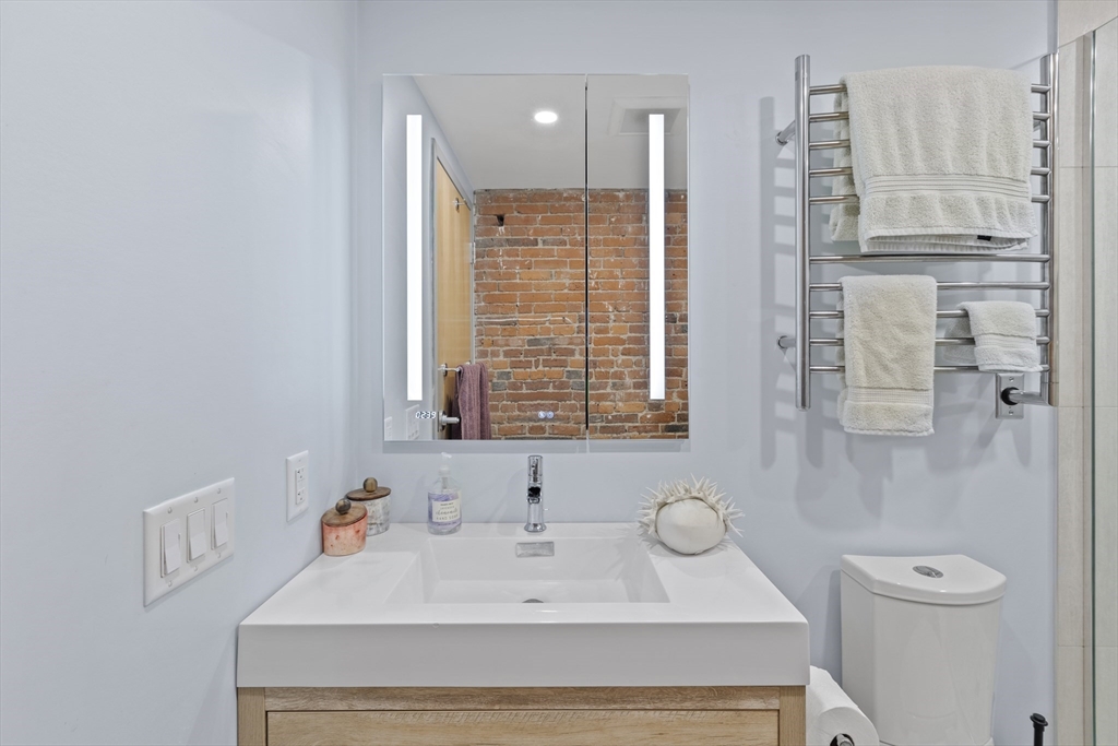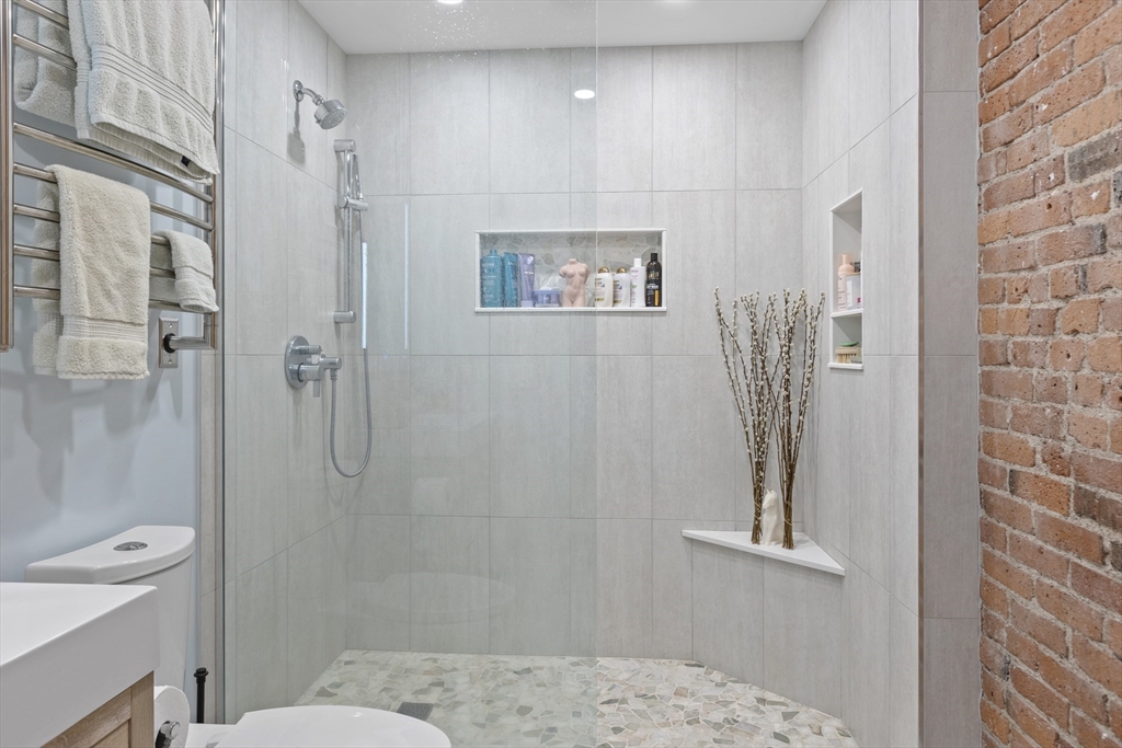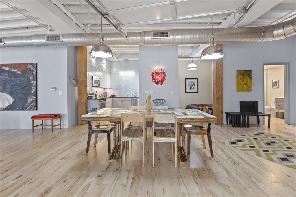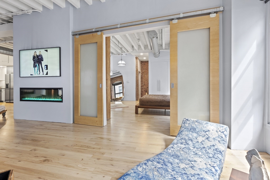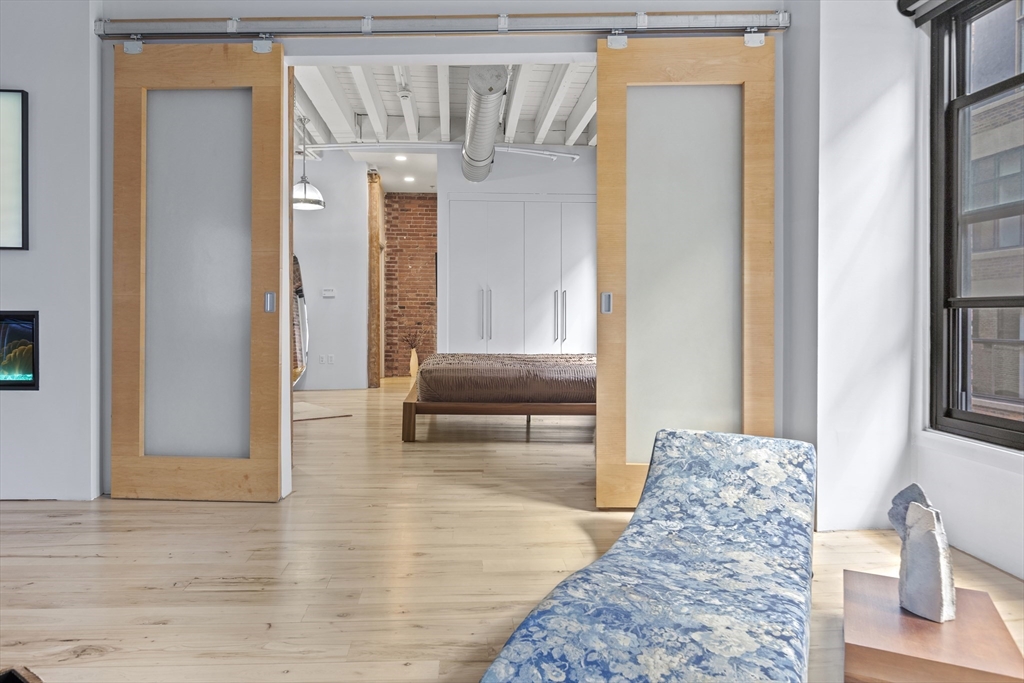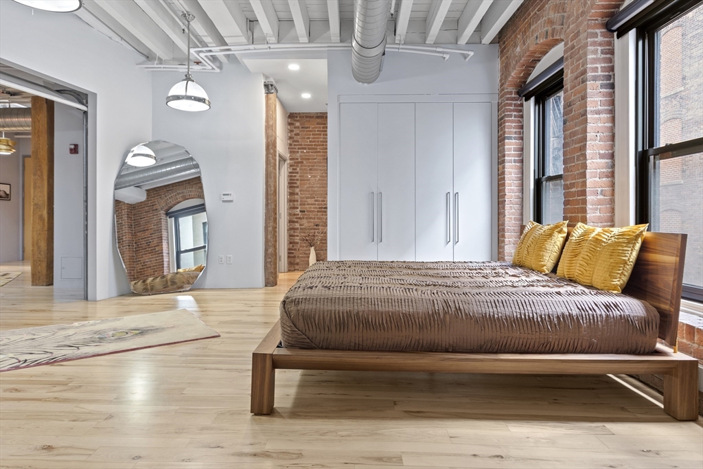 Step into this luxurious modern loft/condo located in Boston's desirable Leather District! This unique 2 bedroom 2 bath allows you to enjoy the exposed brick with architectural features such as arches over the windows and tall ceilings with an industrial feel. This space even has a distinctive garage door that opens to the primary bedroom, comes with state-of-the-art appliances, hardwood floors, full floor to ceiling closet space/plenty of storage, and laundry in the unit. Street parking is available with a permit and rental parking is available at local garages. It's a perfect work/live space and centrally located to Downtown Boson, blocks away from South Station and in walking distance to the Seaport, North End, Quincy Market!