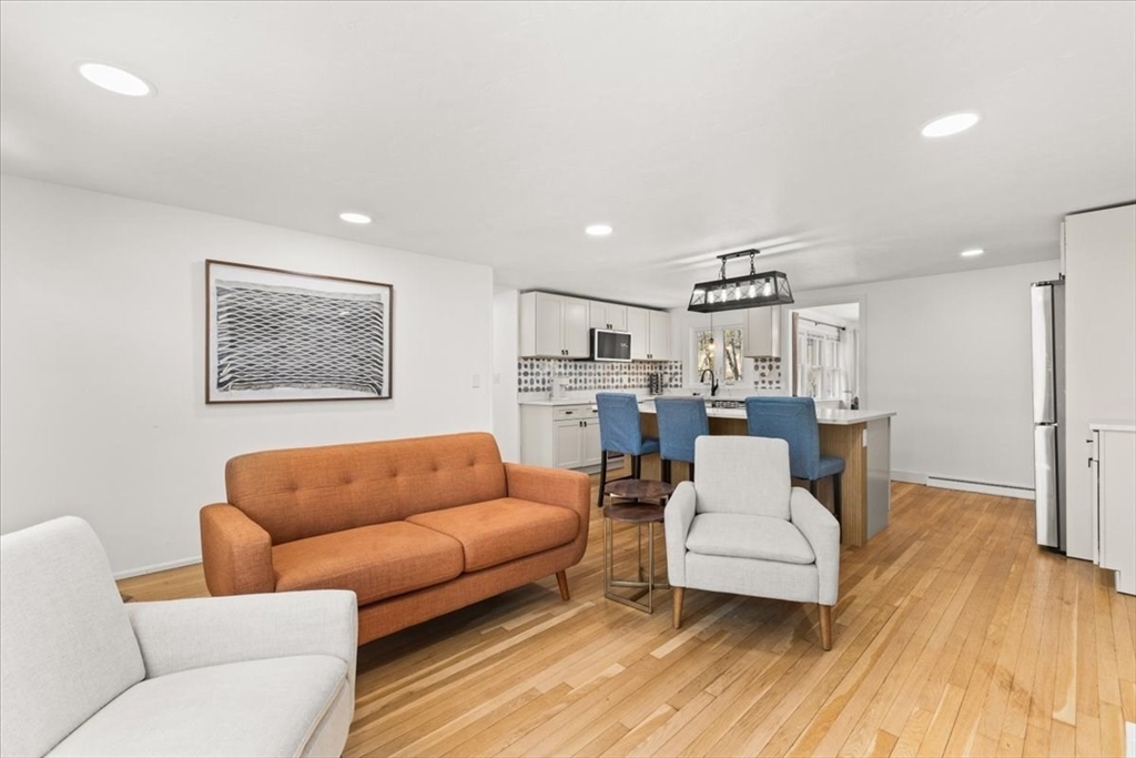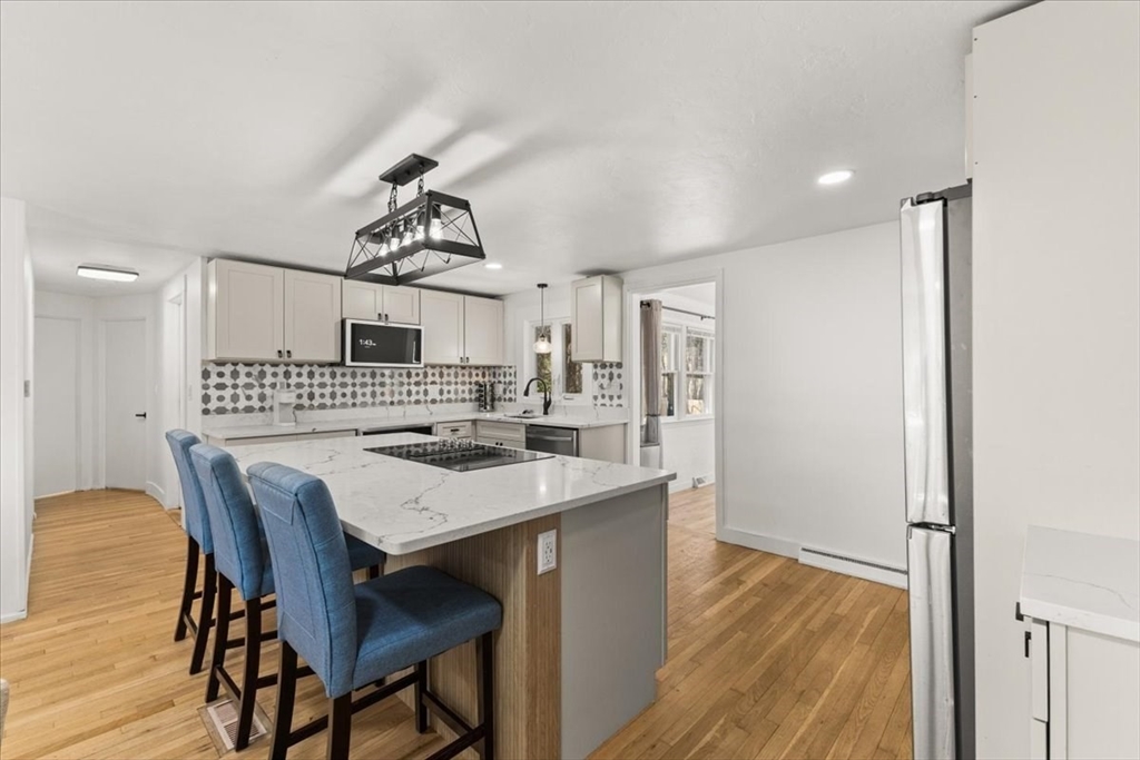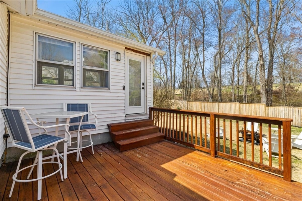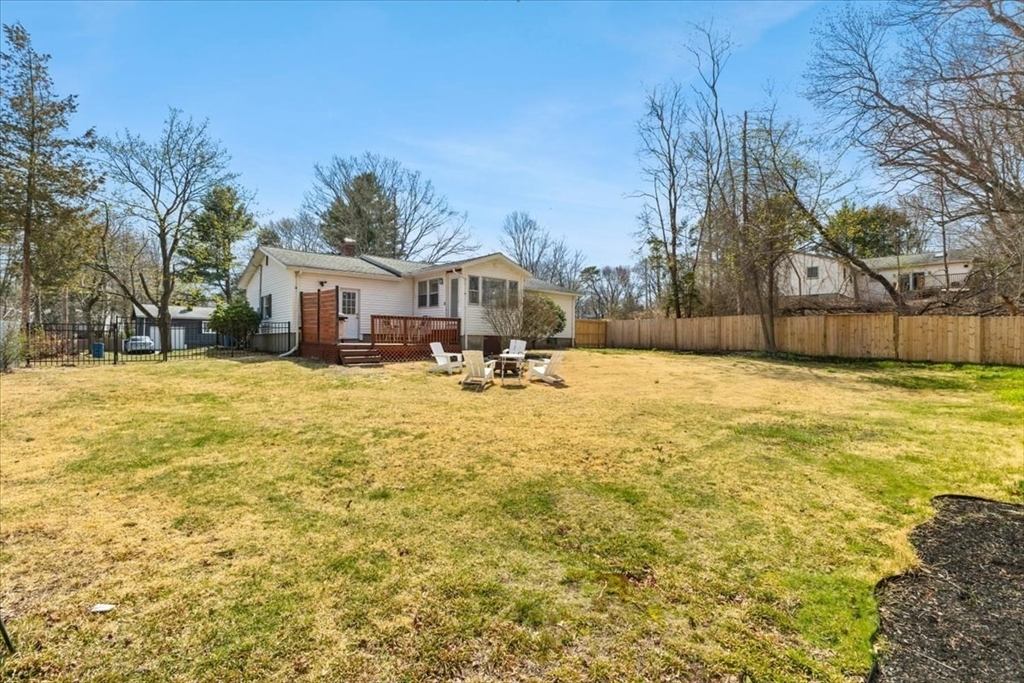 Charming 3-bed, 1-bath ranch offering true one-level living on a quiet cul-de-sac near the Braintree line—no stairs, no hassle, just easy living done right. This 1,032 sq ft home features hardwood floors throughout, an updated kitchen with quartz countertops, stainless steel appliances, and ample cabinet space, plus a renovated bathroom with modern finishes. Bright living room with recessed lighting and a full brick fireplace creates a warm, inviting space perfect for relaxing or entertaining. Enjoy year-round comfort with updated forced hot air heat and central A/C. Set on a level, fenced-in lot with low-maintenance vinyl siding, a 1-car garage, and a full basement ideal for storage or future expansion. Architectural plans and town approval are already in place for an ADU conversion, offering excellent potential for additional living space or future value. Convenient location with quick access to highways, shopping, restaurants, and commuter rail. Move-in ready and well maintained.
