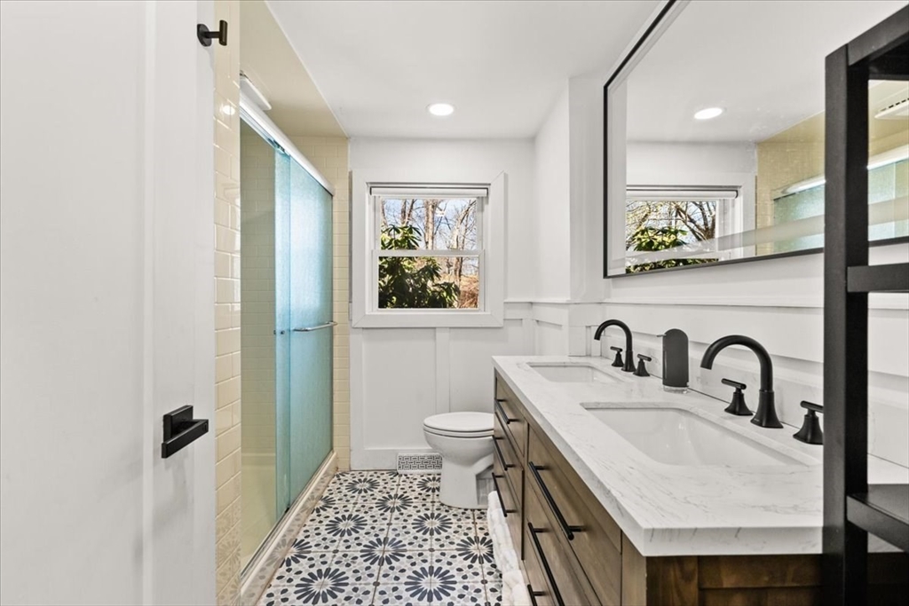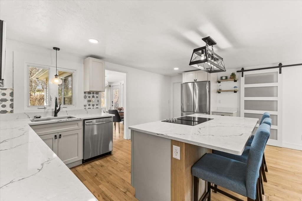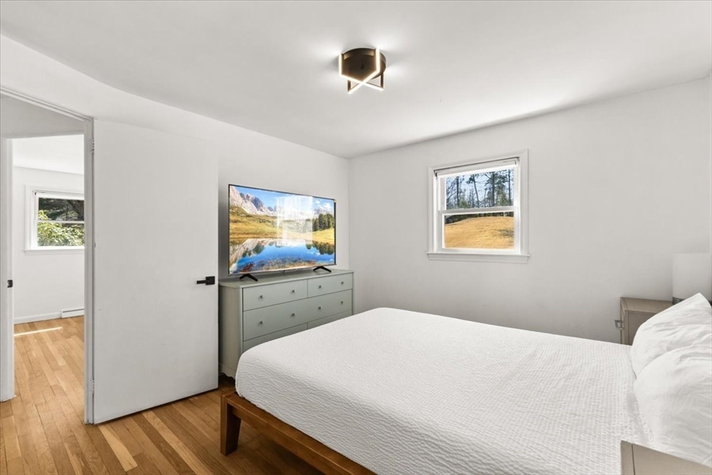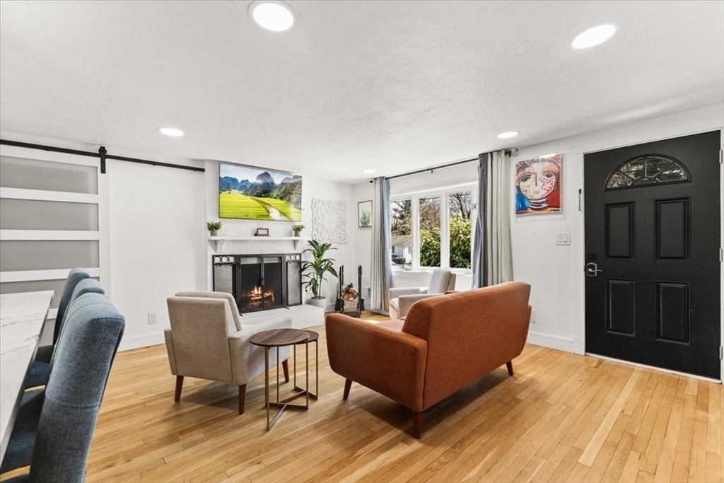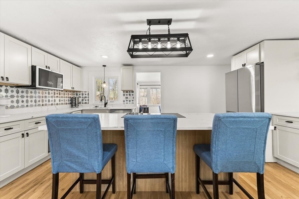 Charming 3-bed, 1-bath ranch offering true one-level living on a quiet cul-de-sac near the Braintree line—no stairs, no hassle, just easy living done right. This 1,032 sq ft home features hardwood floors throughout, an updated kitchen with quartz countertops, stainless steel appliances, and ample cabinet space, plus a renovated bathroom with modern finishes. Bright living room with recessed lighting and a full brick fireplace creates a warm, inviting space perfect for relaxing or entertaining. Enjoy year-round comfort with updated forced hot air heat and central A/C. Set on a level, fenced-in lot with low-maintenance vinyl siding, a 1-car garage, and a full basement ideal for storage or future expansion. Architectural plans and town approval are already in place for an ADU conversion, offering excellent potential for additional living space or future value. Convenient location with quick access to highways, shopping, restaurants, and commuter rail. Move-in ready and well maintained.