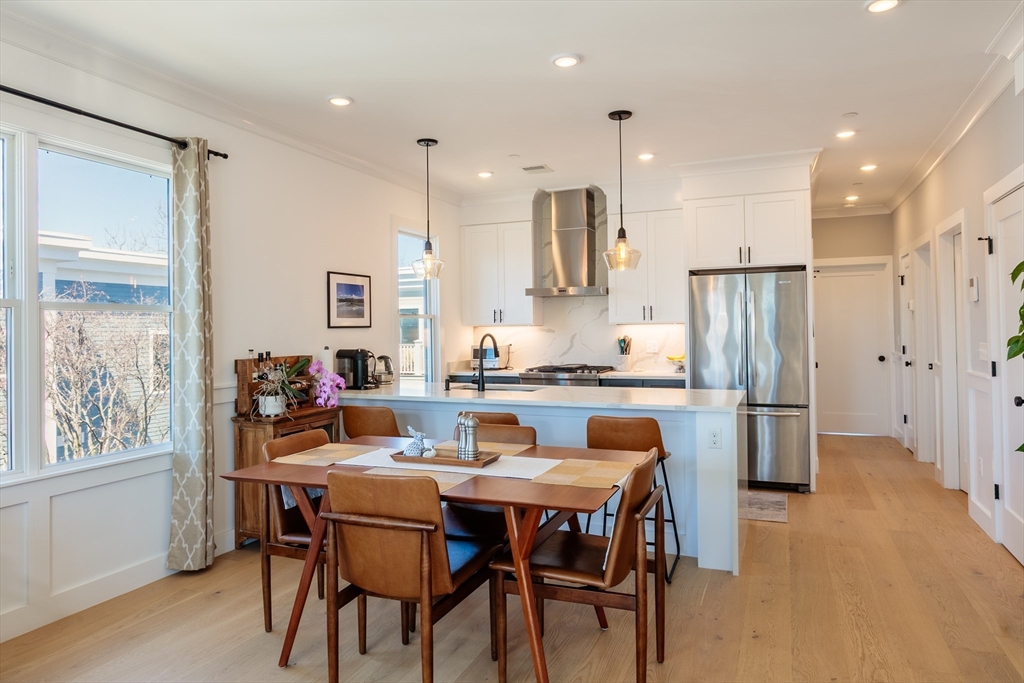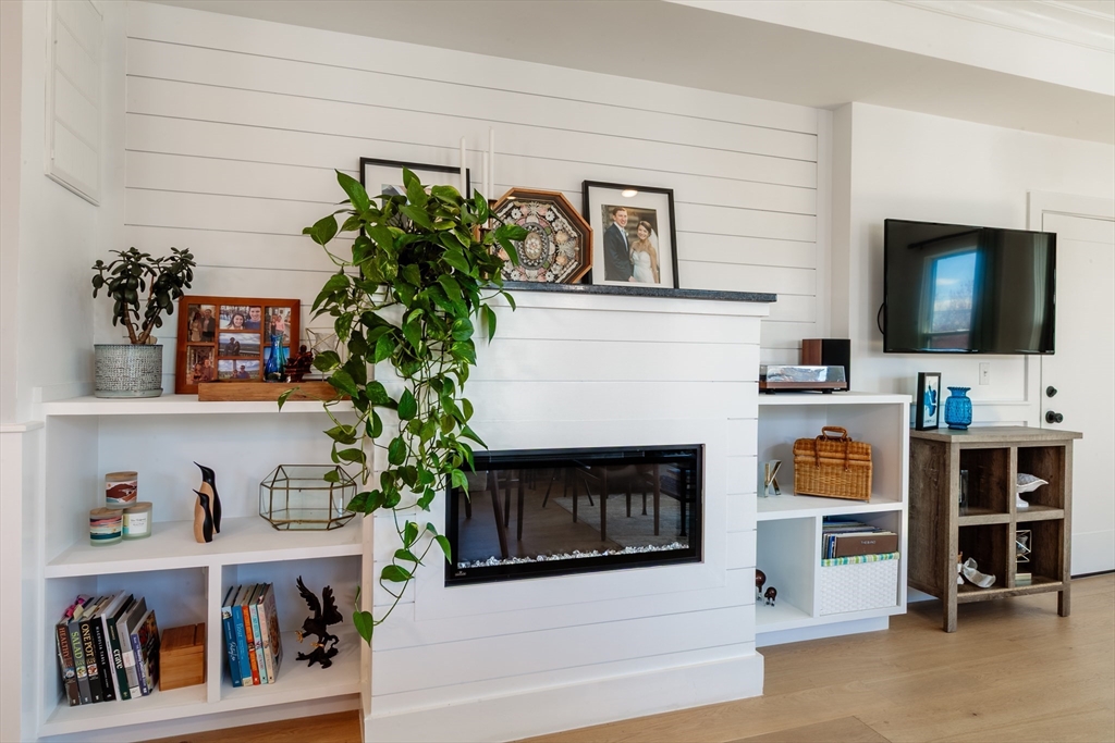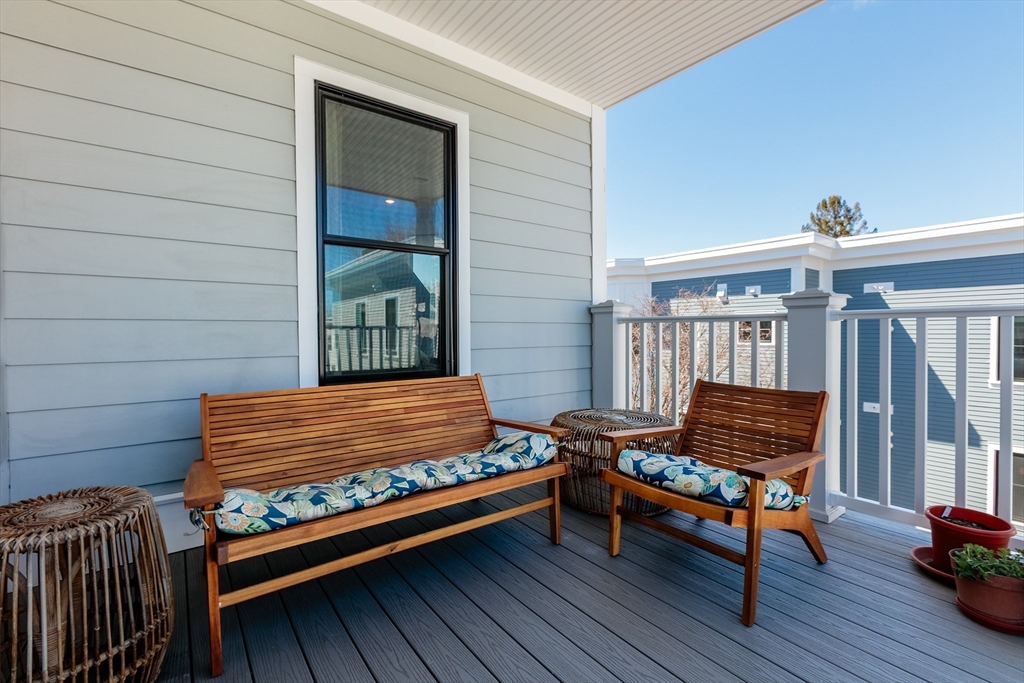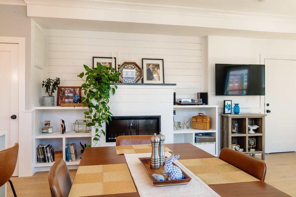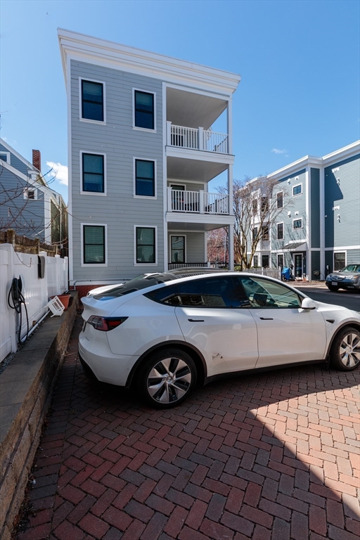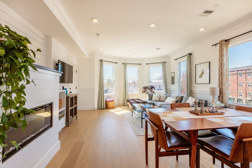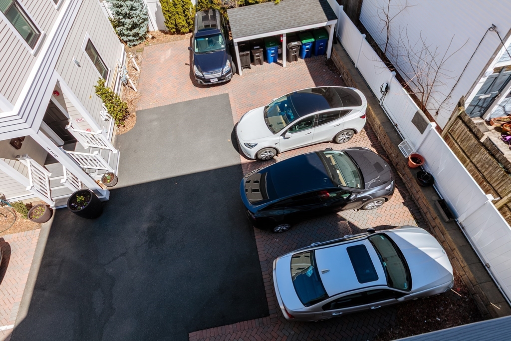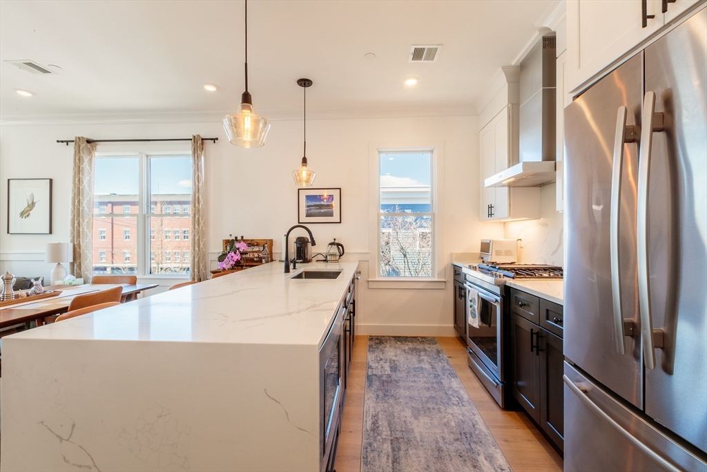 Bright, beautiful top-floor 2 bedroom/2 bath condo with parking near Harvard, Porter, Union, and Inman Squares. Private entry on second floor leads to dramatic third floor landing with skylight. Inside, the open floor plan is flanked by windows. Living/dining area has gas fireplace, recessed lighting, and built-ins. Sleek kitchen with waterfall quartz island and counters; ss appliances including vent hood and drawer microwave; pendant lights; pantry closet. Off a central hall are 2 bedrooms, office (used as nursery), second full bath, and laundry closet. The primary suite has private bathroom with tiled spa shower with double sinks and medicine cabinets, double closets, and private deck. Exclusive parking space in rear with EV charger. Features include central air and gorgeous light wood floors. Walk to 3 subway stops (Red Line and GLX), several bus lines, bike path, shops, theaters, restaurants, parks, and more.
