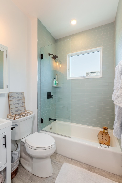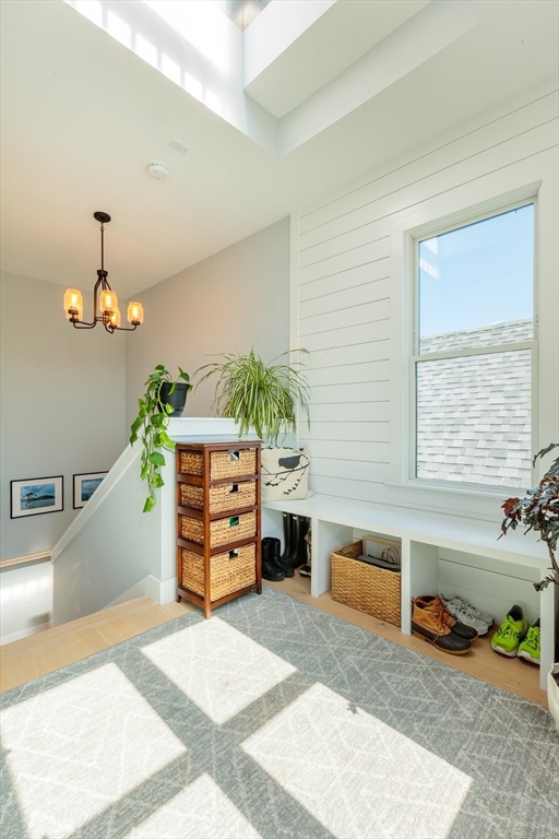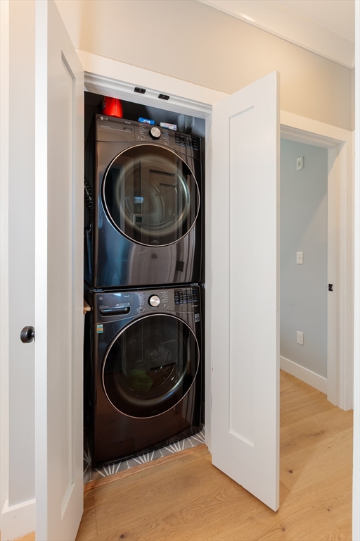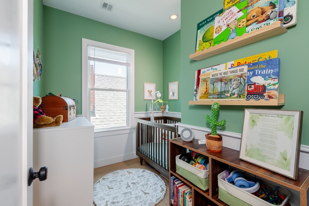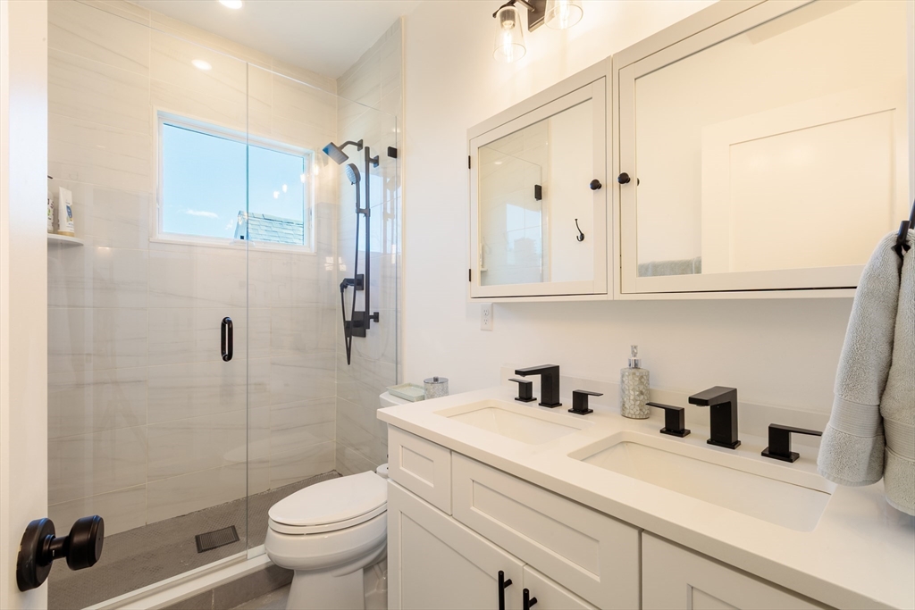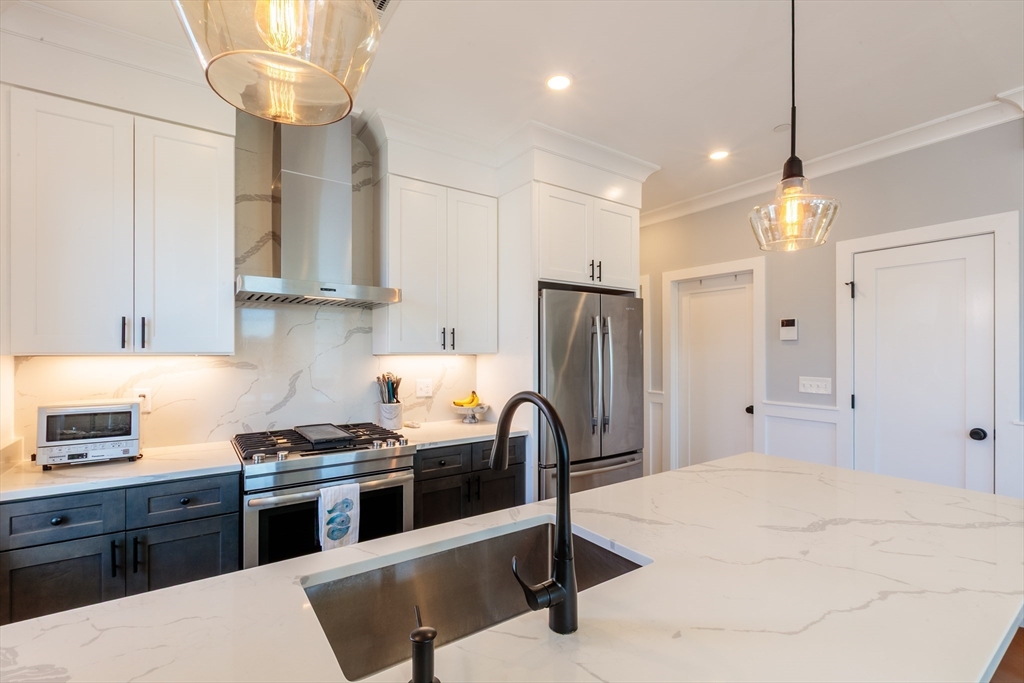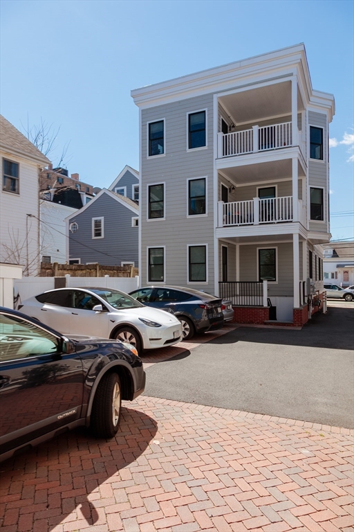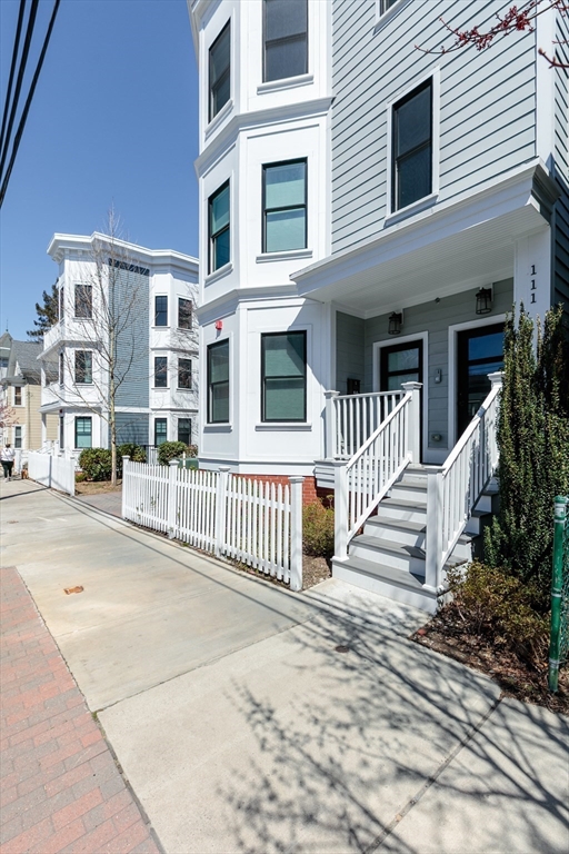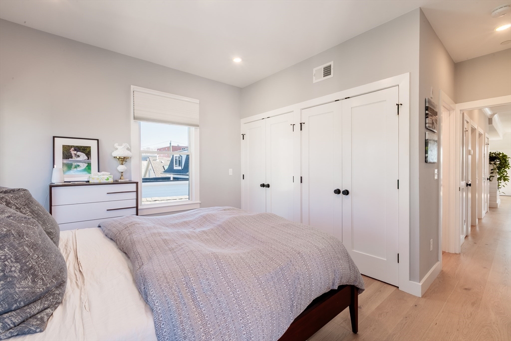 Bright, beautiful top-floor 2 bedroom/2 bath condo with parking near Harvard, Porter, Union, and Inman Squares. Private entry on second floor leads to dramatic third floor landing with skylight. Inside, the open floor plan is flanked by windows. Living/dining area has gas fireplace, recessed lighting, and built-ins. Sleek kitchen with waterfall quartz island and counters; ss appliances including vent hood and drawer microwave; pendant lights; pantry closet. Off a central hall are 2 bedrooms, office (used as nursery), second full bath, and laundry closet. The primary suite has private bathroom with tiled spa shower with double sinks and medicine cabinets, double closets, and private deck. Exclusive parking space in rear with EV charger. Features include central air and gorgeous light wood floors. Walk to 3 subway stops (Red Line and GLX), several bus lines, bike path, shops, theaters, restaurants, parks, and more.