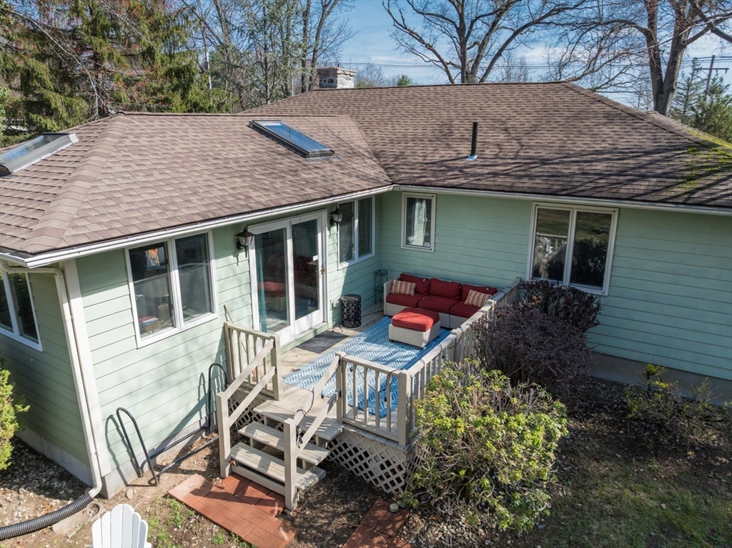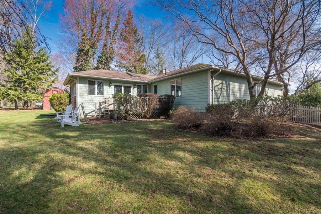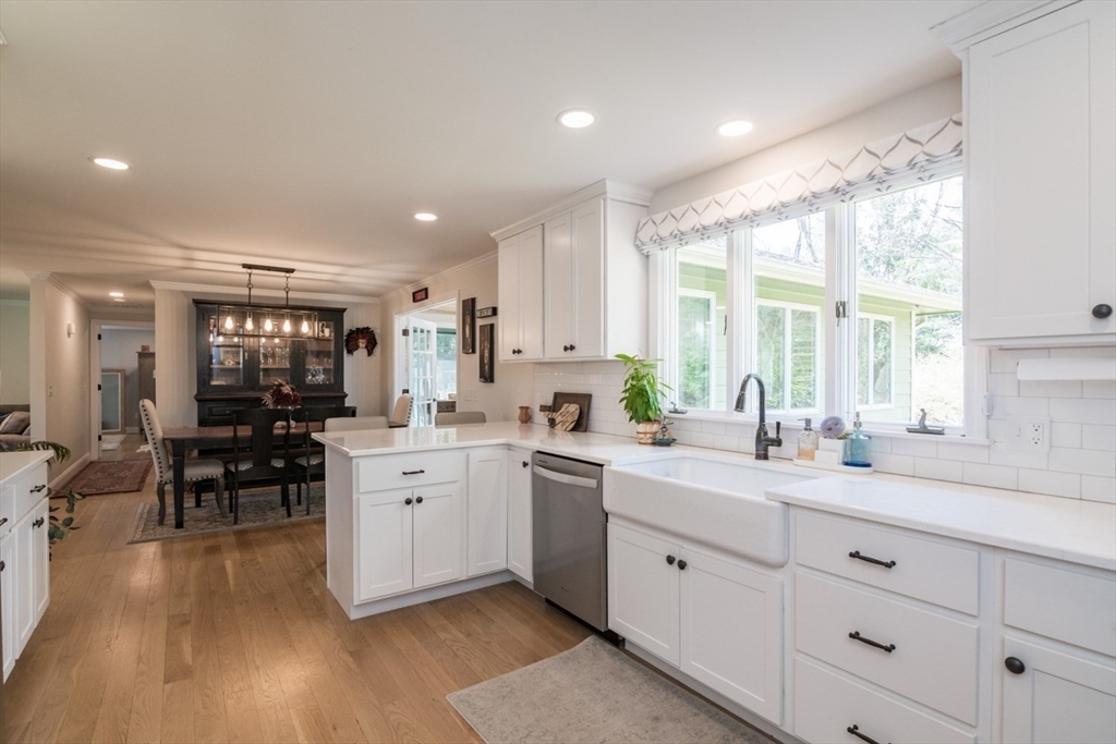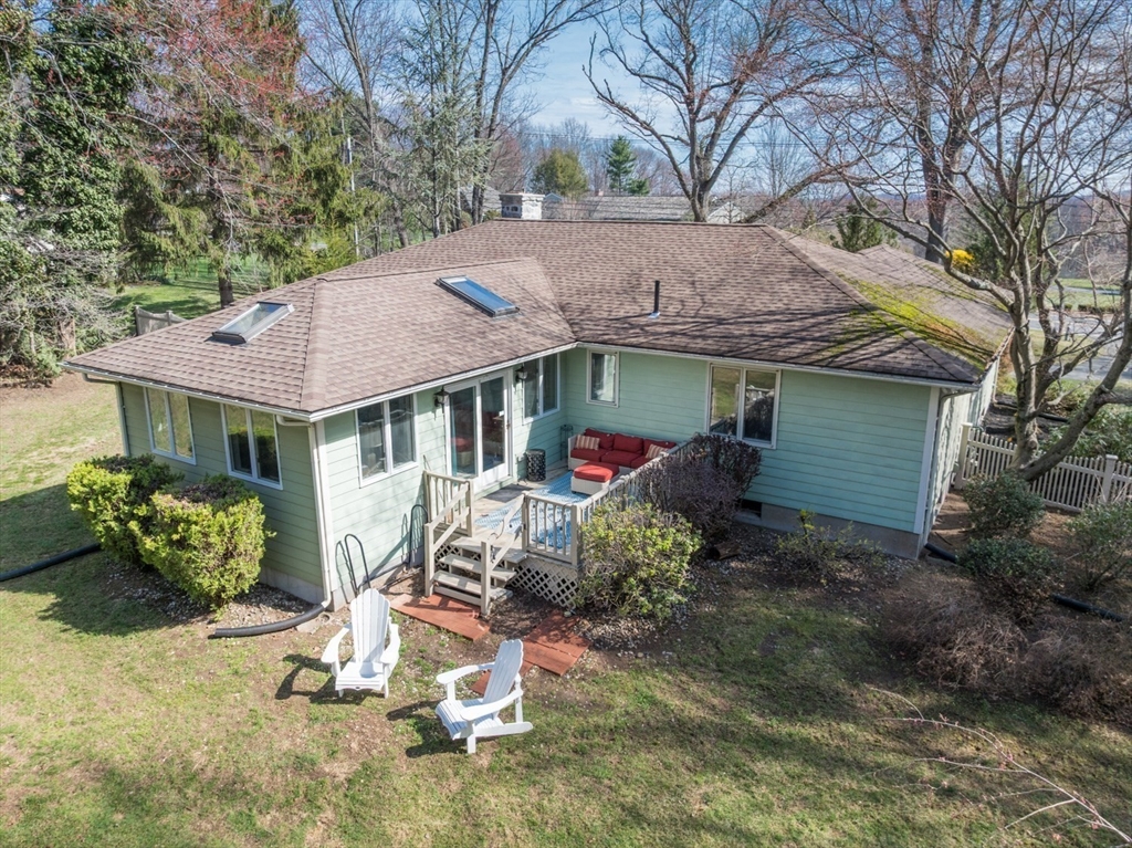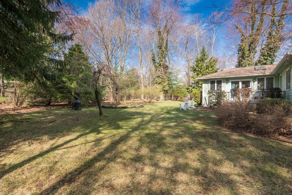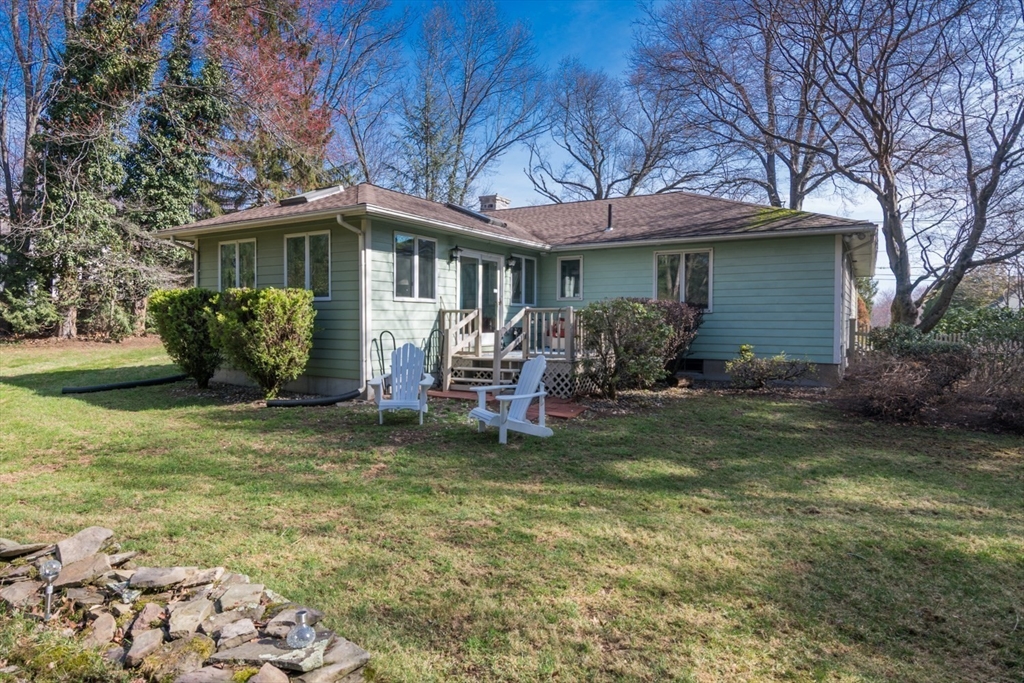 This stunning ranch has been meticulously remodeled! The gourmet kitchen has quartz counter tops with a breakfast bar, custom cabinetry, farmhouse sink & triple windows overlooking the expansive yard. The living room features a floor to ceiling stone fireplace, wood floors, recessed lights & crown molding. The open floor plan allows you to entertain with ease with a dining room that leads to a showstopping family room/sun room that includes skylights, cathedral ceiling, wainscoting & slider to the deck. Wait until you see the gorgeous primary en-suite! Very spacious bedroom with custom walk-in closet & fully remodeled spa-like primary bath with glass enclosed shower. The 2nd bedroom is also an en-suite with another equally impressive remodeled bathroom! A new half bath was added to the floor plan. This home sits on almost an acre, located on a corner lot yet yard feels private & has been fenced in - plus a circular driveway. Truly move-in ready, this home has been transformed!