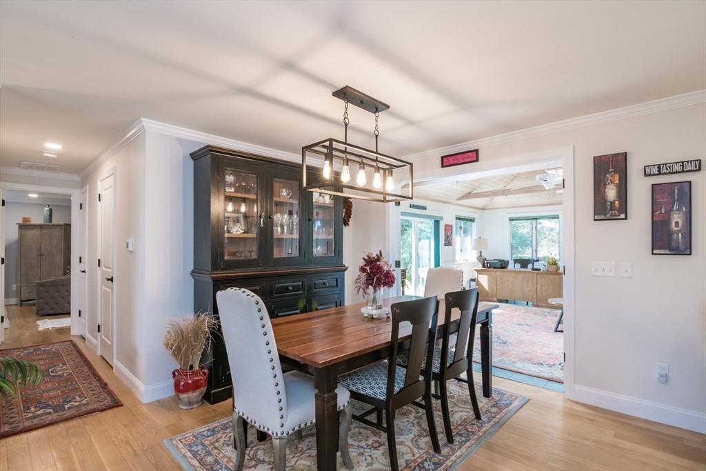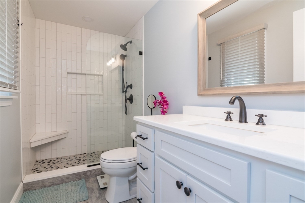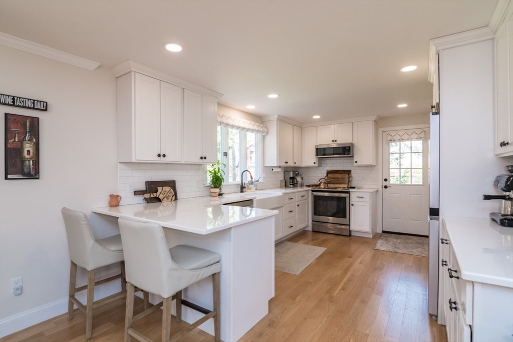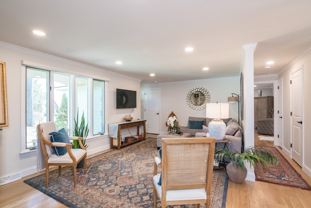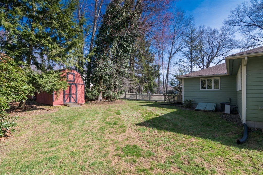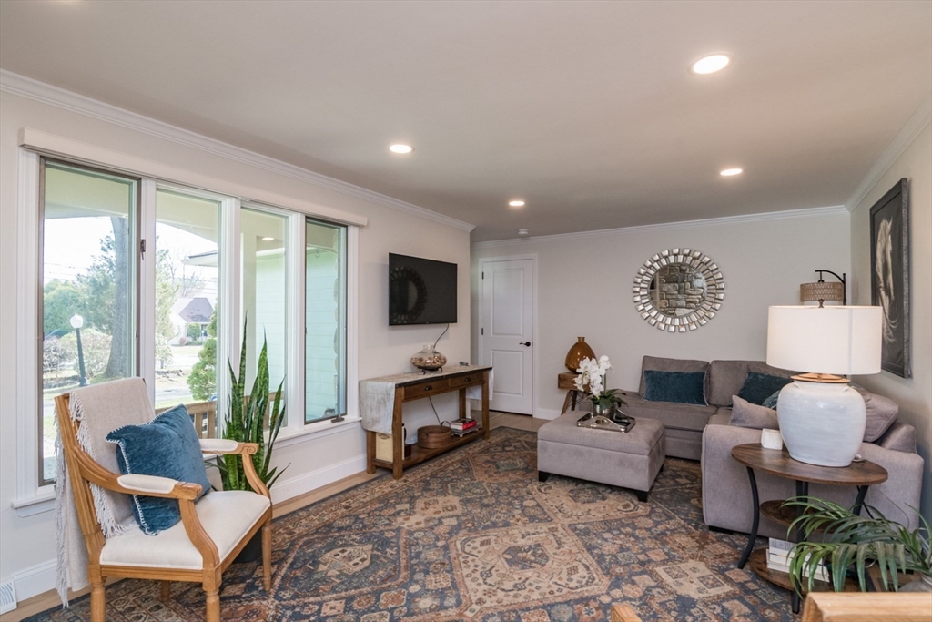 This stunning ranch has been meticulously remodeled! The gourmet kitchen has quartz counter tops with a breakfast bar, custom cabinetry, farmhouse sink & triple windows overlooking the expansive yard. The living room features a floor to ceiling stone fireplace, wood floors, recessed lights & crown molding. The open floor plan allows you to entertain with ease with a dining room that leads to a showstopping family room/sun room that includes skylights, cathedral ceiling, wainscoting & slider to the deck. Wait until you see the gorgeous primary en-suite! Very spacious bedroom with custom walk-in closet & fully remodeled spa-like primary bath with glass enclosed shower. The 2nd bedroom is also an en-suite with another equally impressive remodeled bathroom! A new half bath was added to the floor plan. This home sits on almost an acre, located on a corner lot yet yard feels private & has been fenced in - plus a circular driveway. Truly move-in ready, this home has been transformed!