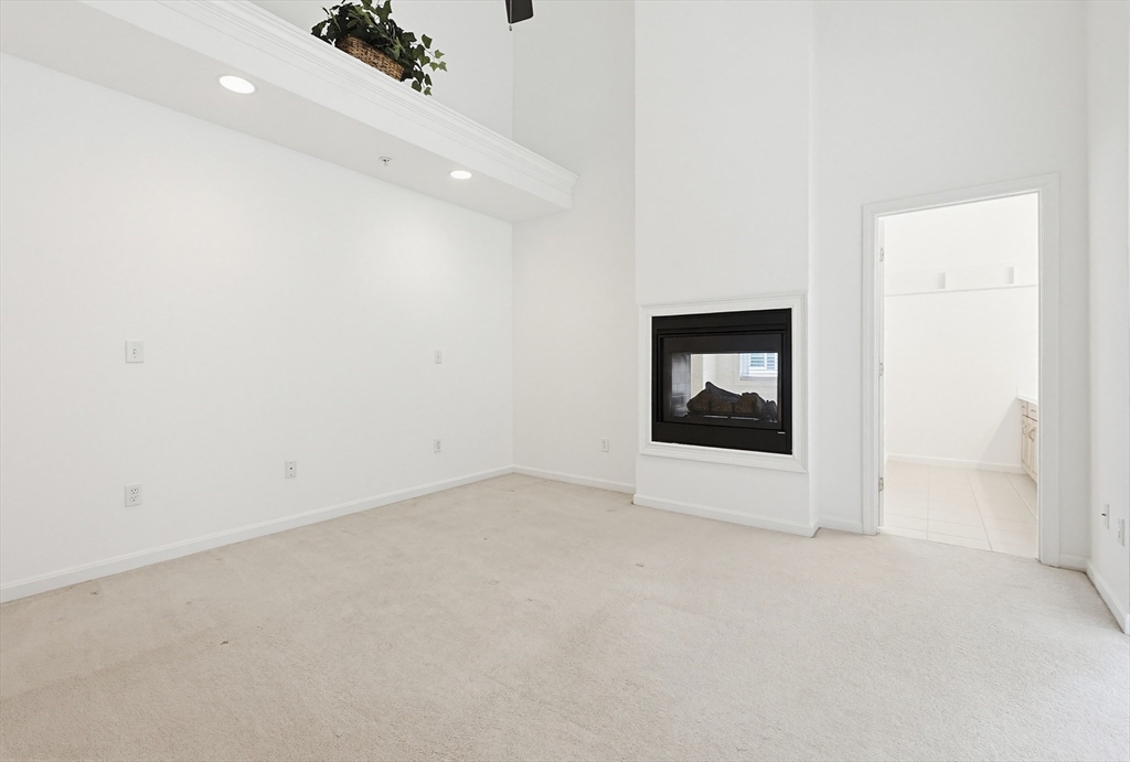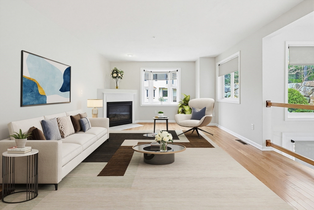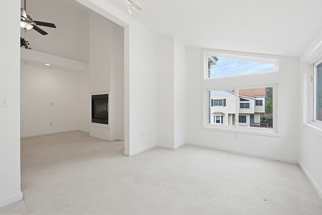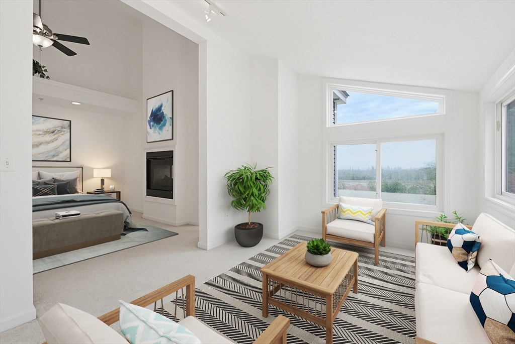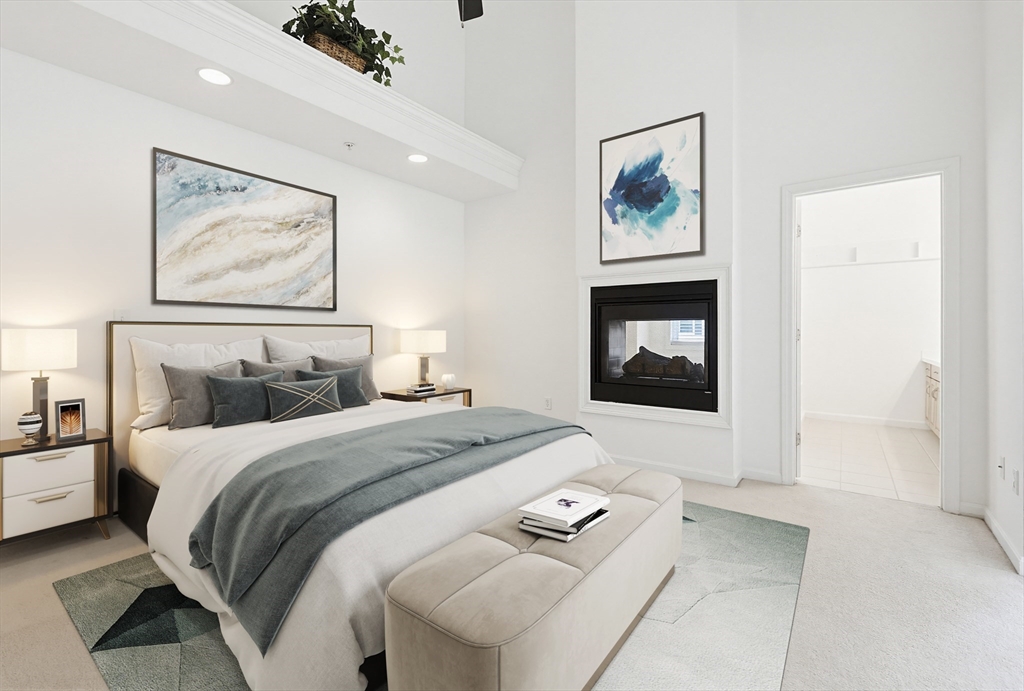 Step into this elegantly designed townhome and feel immediately at home. Ascend the curved staircase to the open main level, where dramatic windows fill the space with natural light. The living and dining areas connect beautifully, centered around a warm gas fireplace—perfect for today’s casual lifestyle. The kitchen features generous cabinetry, and gas cooking. Upstairs, the expansive primary suite offers soaring ceilings, a sunny sitting area, a dual-sided gas fireplace shared with the luxurious en-suite bath, and generous closets. A spacious second bedroom includes its own bath, cathedral ceiling, and ceiling fan. The versatile loft is ideal for an office or hobby space. The finished lower-level family room offer a quiet respite.