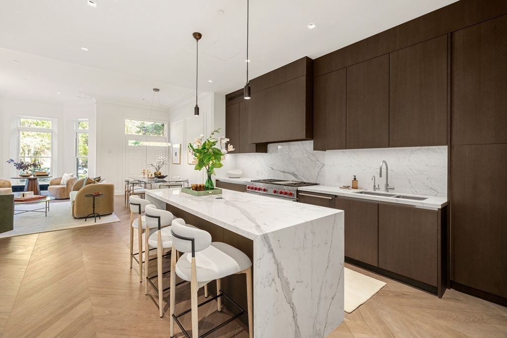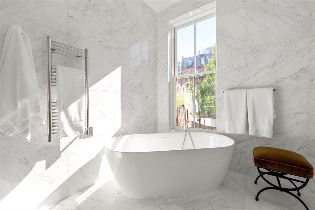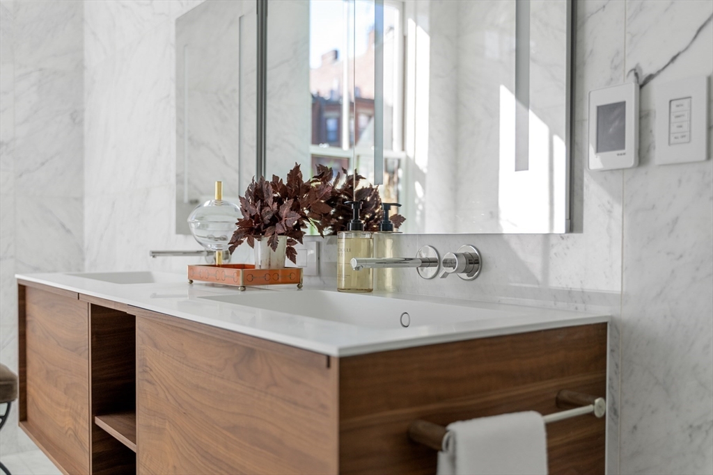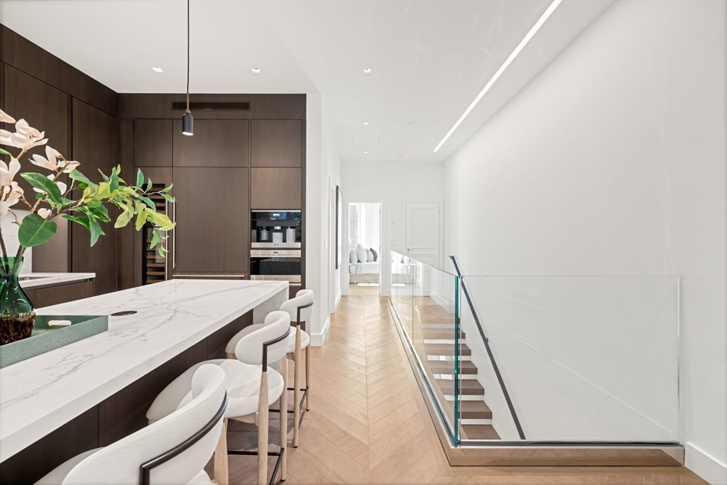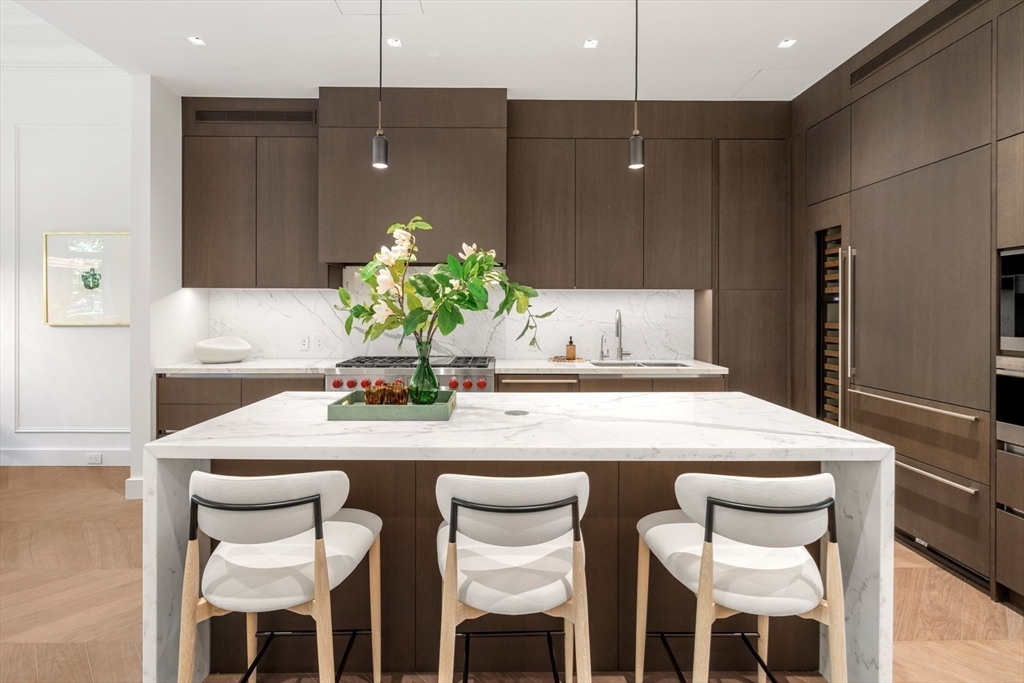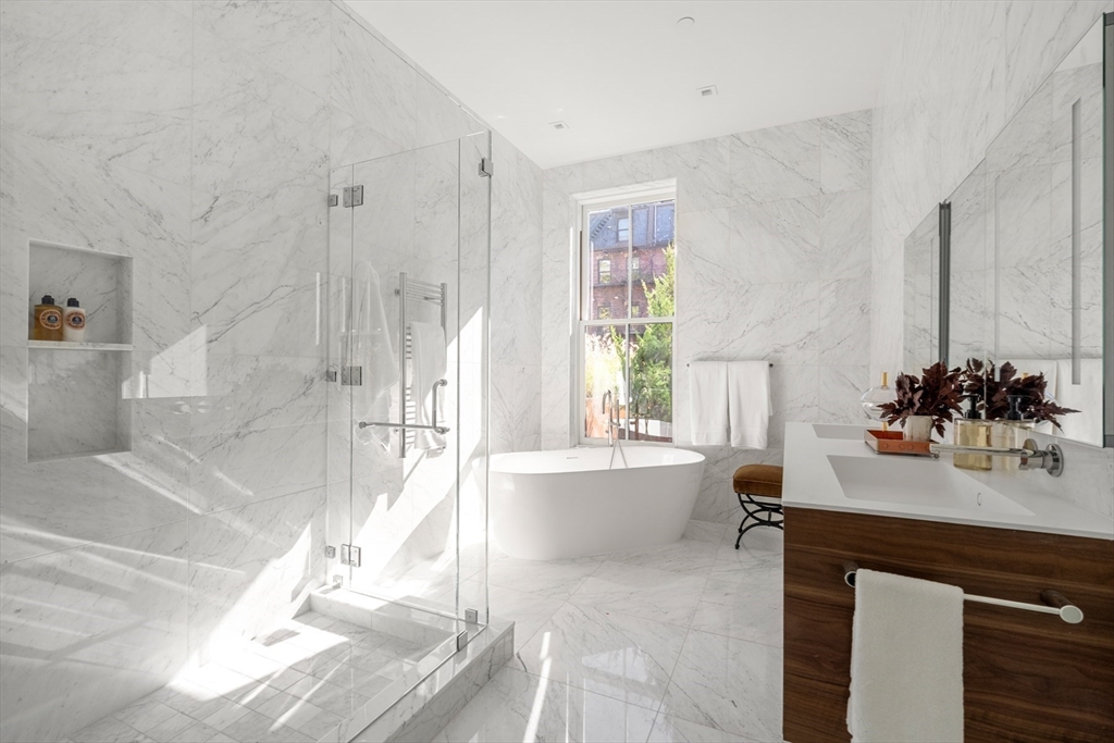 Welcome to Maison Commonwealth, Boston’s newest premier concierge boutique development where European elegance meets the historic charm of Back Bay. This remarkable 3 bedroom plus interior study/family room, 3.5 bath Parlor/Garden townhome offers over 2,400 sq. ft. of refined living, two private outdoor retreats, soaring near 12-ft ceilings, intricate plaster moldings, and imported marble fireplaces. The parlor level showcases elegant entertaining spaces overlooking tree-lined Commonwealth Avenue and a stunning primary suite with direct access to a private terrace. The lower level features a spacious family room and two ensuite bedrooms opening to a private brick walled patio. Floor-to-ceiling marble baths, hand-carved European mantels, and sleek Italian kitchens with Wolf & Sub-Zero appliances define the home’s world-class design. Concierge service, direct access to 1 heated garage parking, and private storage complete this rare offering. Storage unit in garage.