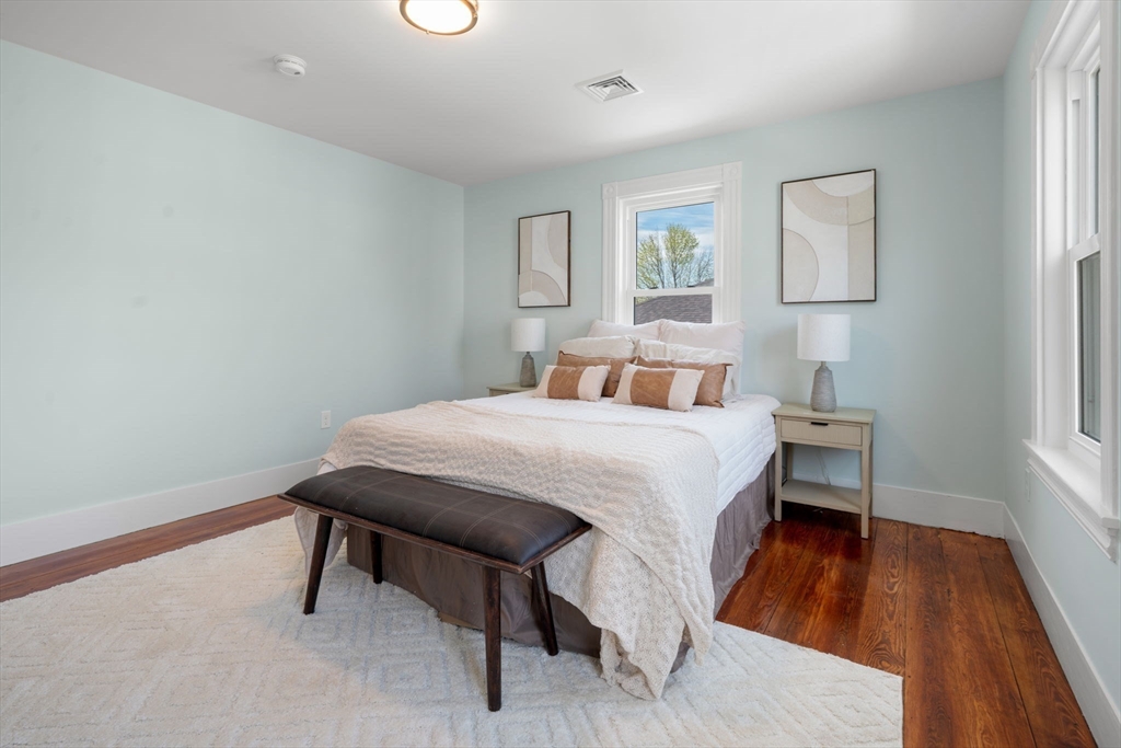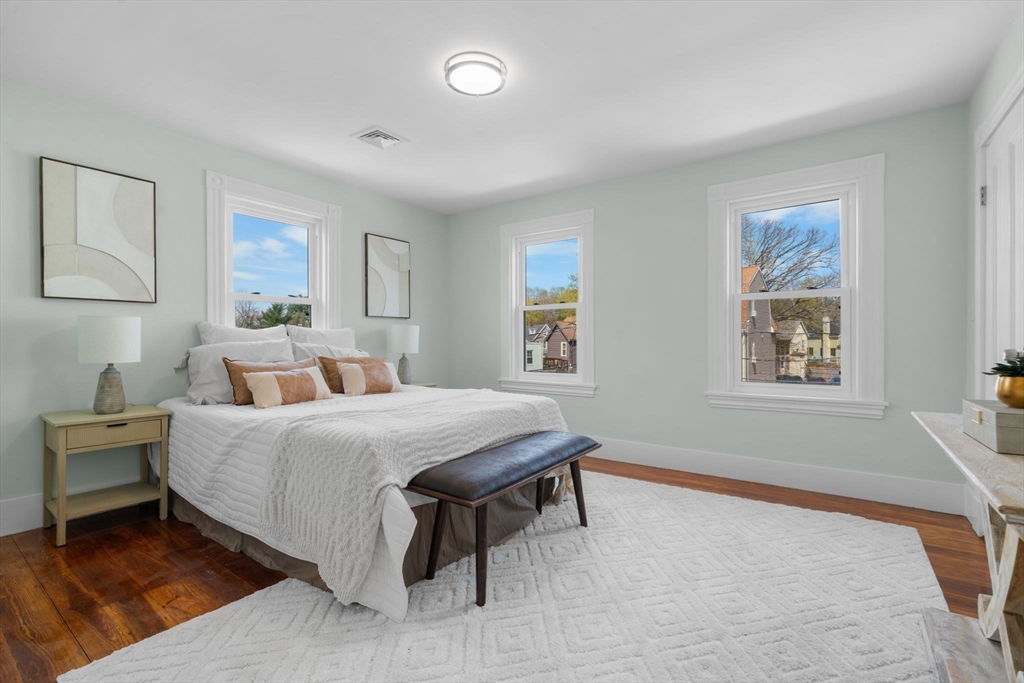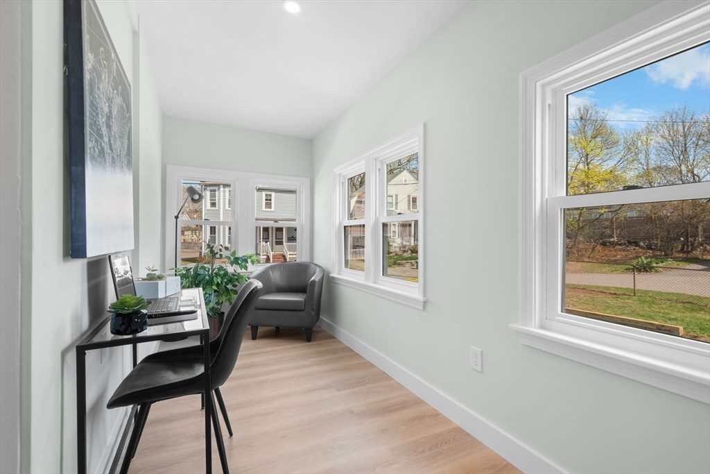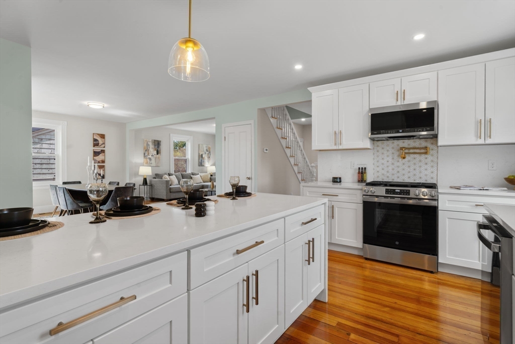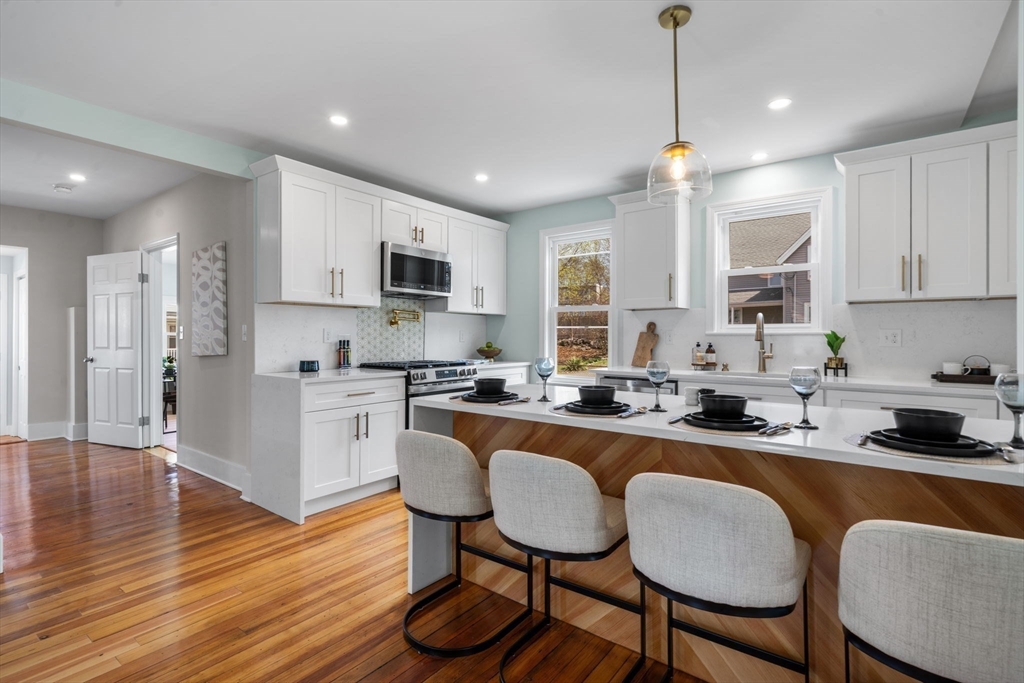 WOW!!! Newly renovated from top to bottom, this stunning home is tucked away on a quiet dead-end street just minutes from Norwood Center. Offering 5 bedrooms, 3 full bathrooms, and 3 levels of living space, it provides the perfect blend of thoughtful design and modern updates. The open-concept living and dining area flows seamlessly into a beautifully updated kitchen, featuring refinished hardwood floors throughout. The kitchen is a true showstopper, complete with waterfall quartz countertops, matching backsplash, and stainless steel appliances. A dedicated first-floor office and 5 spacious bedrooms across multiple levels offer flexibility and privacy. Additional highlights include a large backyard, heated front and back porches, central A/C, new plumbing, updated electrical with 200 amp service, and a brand-new electric hot water tank. Just 5 minutes to the train station — Boston in under 30 minutes. A true commuter’s dream. Don’t miss this rare opportunity in Norwood!