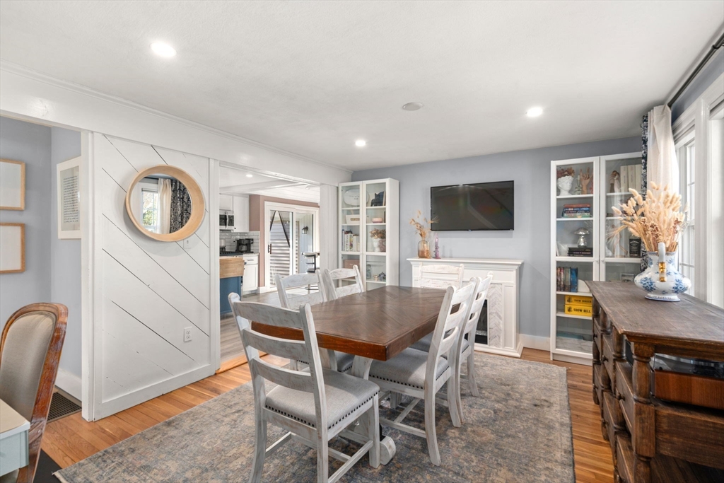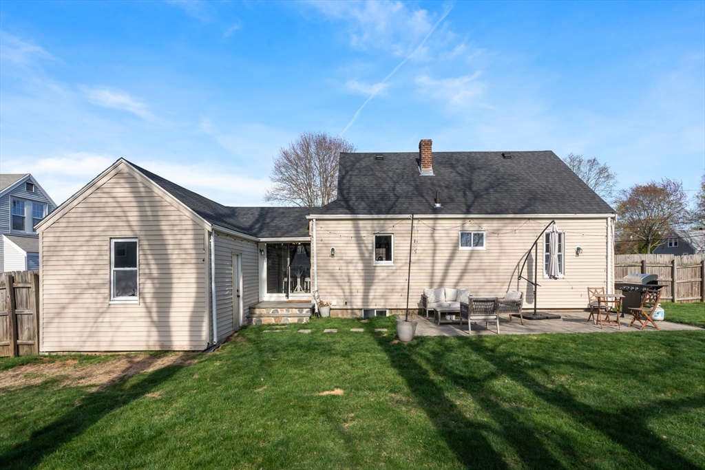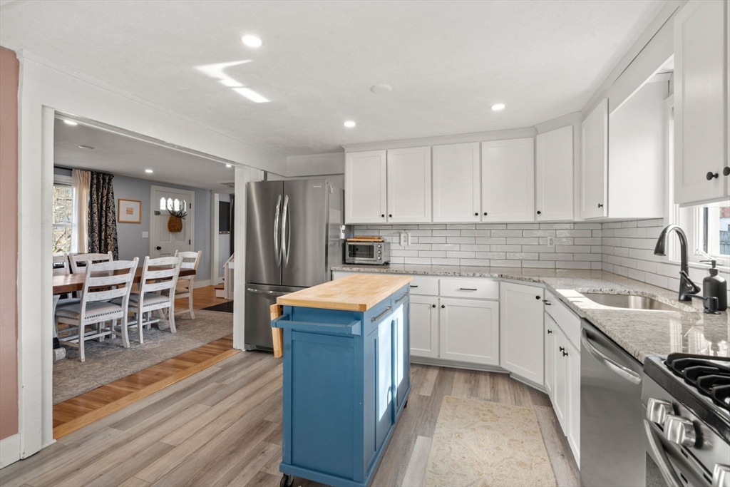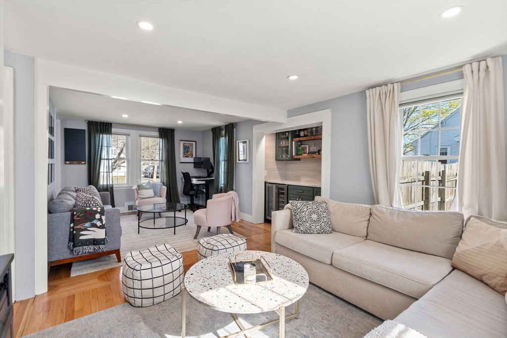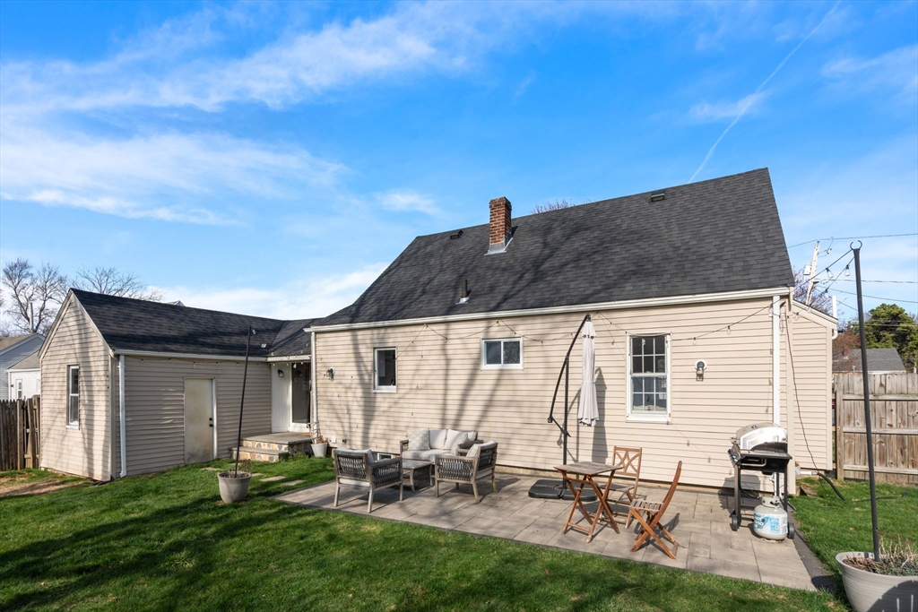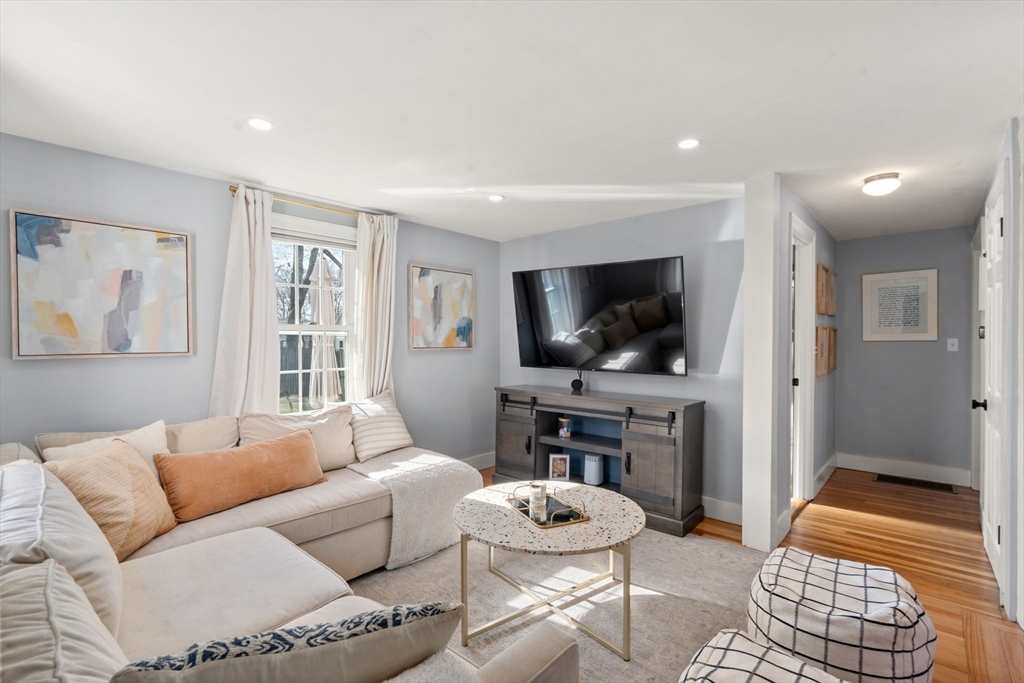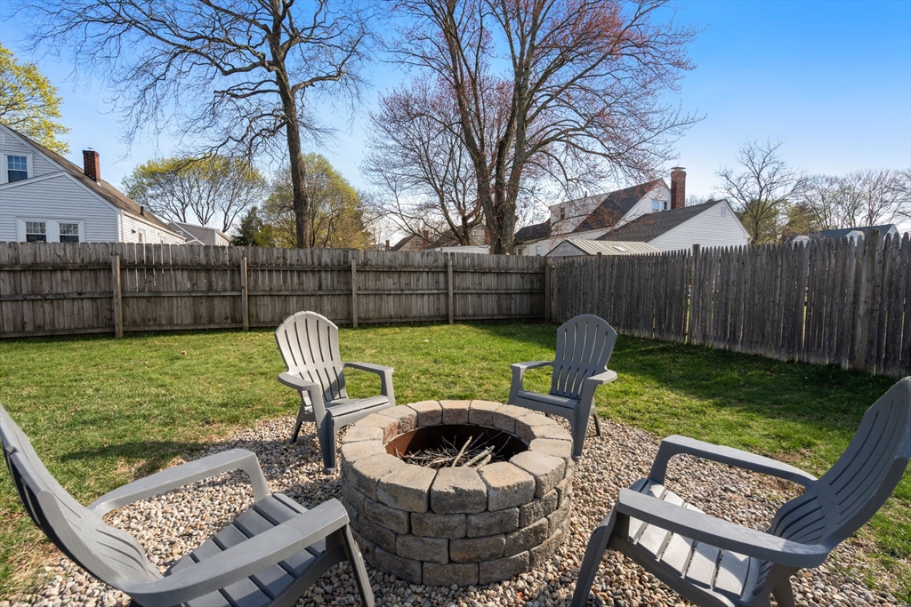 Updated,move-in ready 2-bedroom (formerly a 3-bedroom) offering comfort & style, in a desirable Norwood neighborhood! Open-concept, eat-in kitchen with vaulted ceilings that flows seamlessly into the dining area, creating a bright and spacious feel. The beautifully refreshed kitchen (2020) includes refaced cabinetry, new countertops, backsplash, and flooring. Enjoy a front-to-back living room with hardwood floors, recessed lighting (2021), and a built-in wet bar (2021)—perfect for entertaining. Major updates include central air, new furnace, tankless hot water, and roof (all 2020), plus Harvey windows. Step outside to a level, fenced-in backyard complete with a new patio, firepit, and back stairs (2022)—ideal for outdoor gatherings. A one-car garage with loft storage adds convenience. Basement plumbed for 1/2 bath. Easy access to Route 95, Route 1, and nearby shopping. Stamped, town-approved plans in hand to expand to a 4-bedroom, 2-bath home. Truly turnkey!