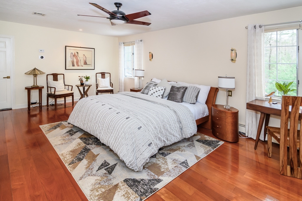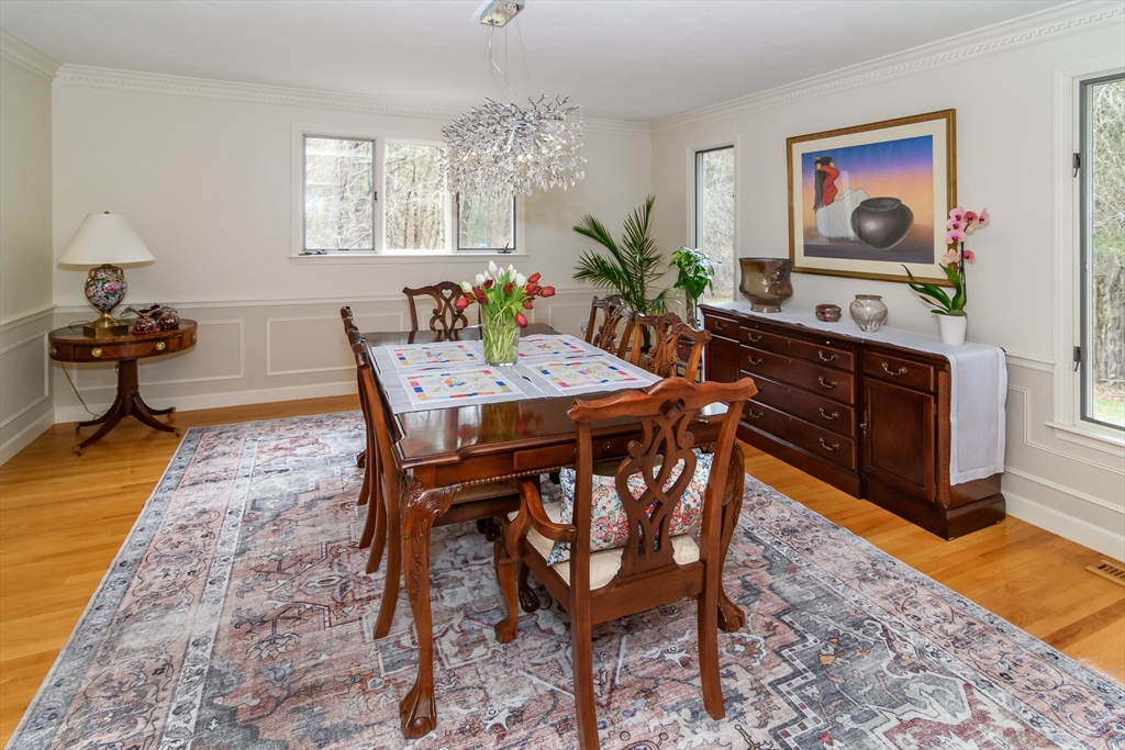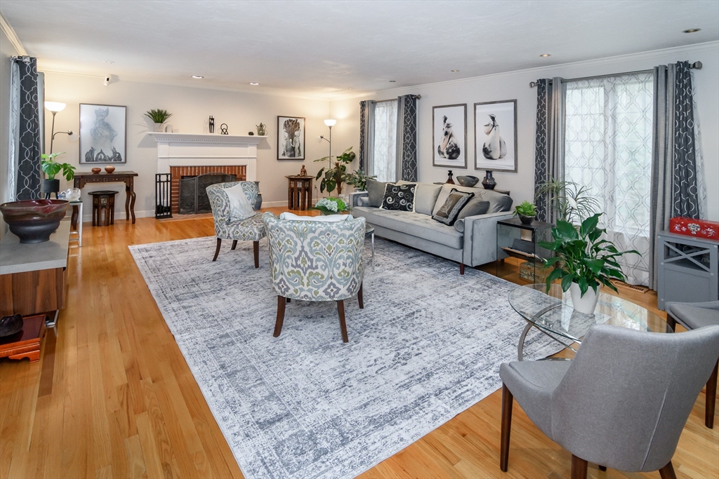 Timeless charm and modern updates in this 5 bedroom colonial. Enjoy an inviting open floor plan, gleaming hardwood floors and an abundance of natural light.The kitchen and bathrooms have been thoughtfully updated. Designed for both indoor and outdoor entertaining, the open family/kitchen with built-ins and fireplace lead to a three season sun room and tiered decks along with an idyllic patio ideal for entertaining. The first floor includes formal dining and living room with a fireplace, home office also with a fireplace. Second floor offers primary ensuite with an abundant walk-in dressing room inclusive of sitting area ideal for yoga or relaxation, accompanied by 1 ensuite bedroom and 3 additional bedrooms with a shared bath. Lower level offers lots of extra storage or an opportunity to create additional finished space. Set on a beautifully landscaped two-acre lot, access to trails and protected land, top notch schools and 25 minutes to downtown Boston.
