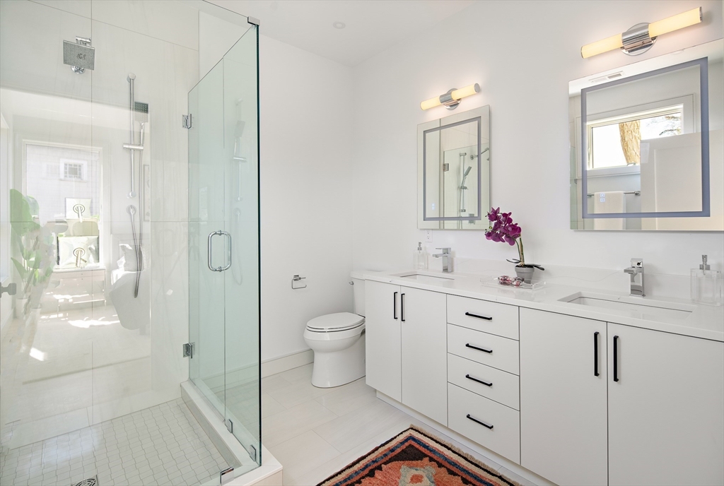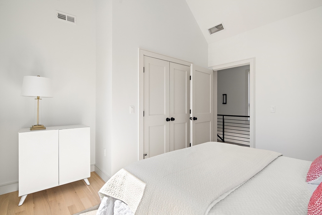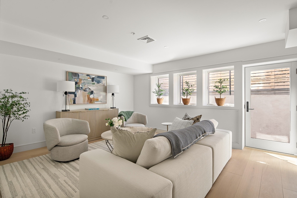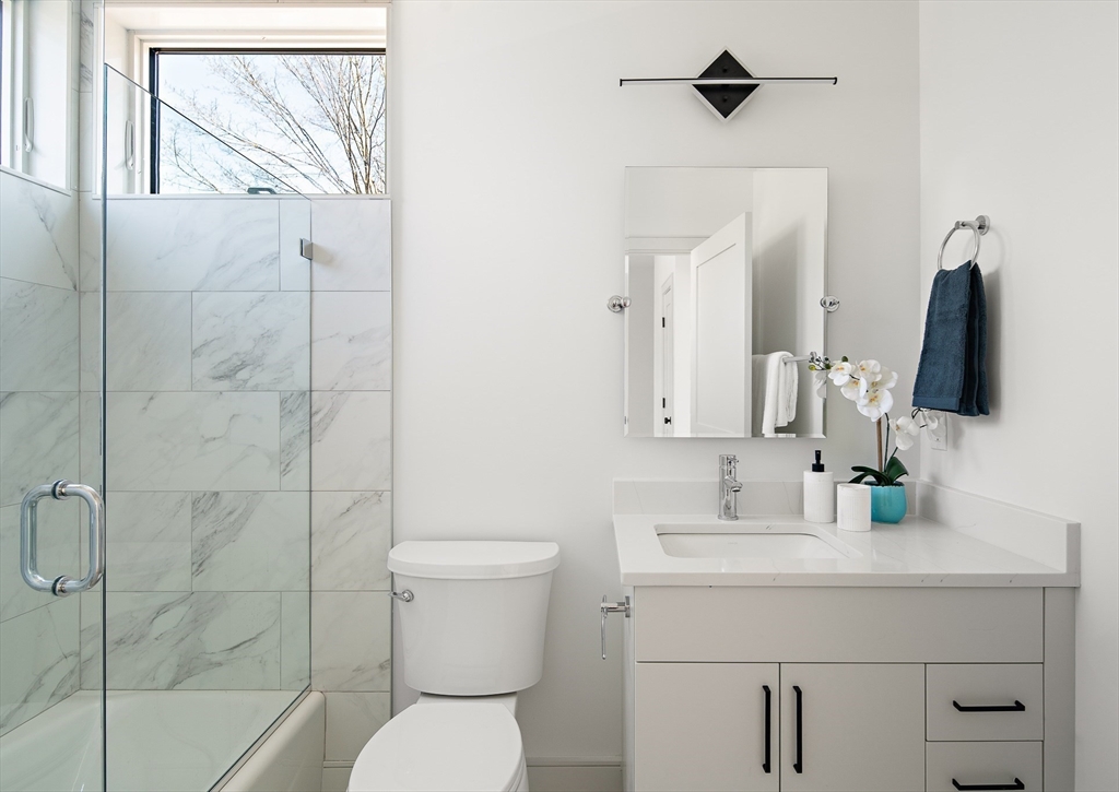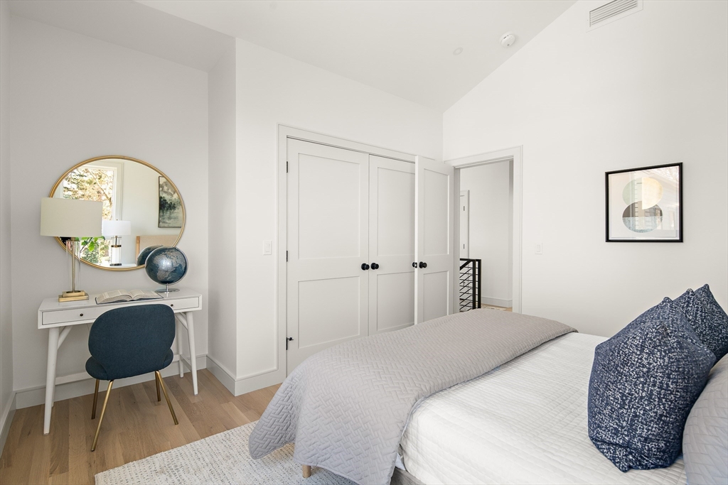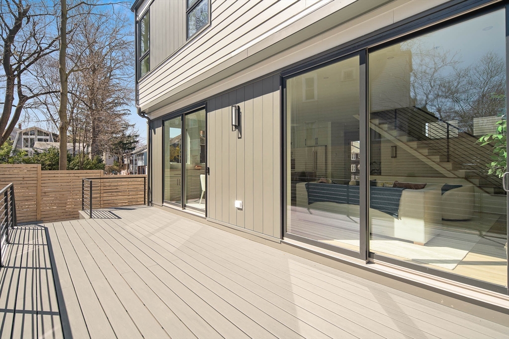 Sun drenched and impeccably crafted, this newly built home offers refined modern living with elevated finishes throughout. The main level features high ceilings, an open living and dining area, and oversized glass doors leading to a private deck and landscaped yard, ideal for indoor outdoor living. The kitchen is outfitted with custom cabinetry, quartz countertops, and a Thermador appliance suite. A modern staircase leads to a generous primary suite with a private bath and dual closets, along with two additional bedrooms and a full bathroom. The lower level offers a spacious bedroom or office, a full bath, a family room with walk out access to outdoor space, and a laundry room. Designed for comfort and efficiency, the home includes a heat pump system, ERV ventilation, and foam insulation. Ideally located near Fresh Pond and Huron Village, minutes from Sofra, Intelligentsia, and public transportation to Harvard Square and Cambridge destinations.