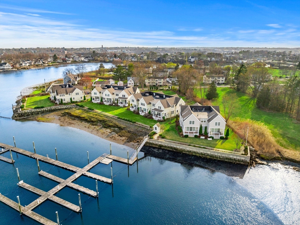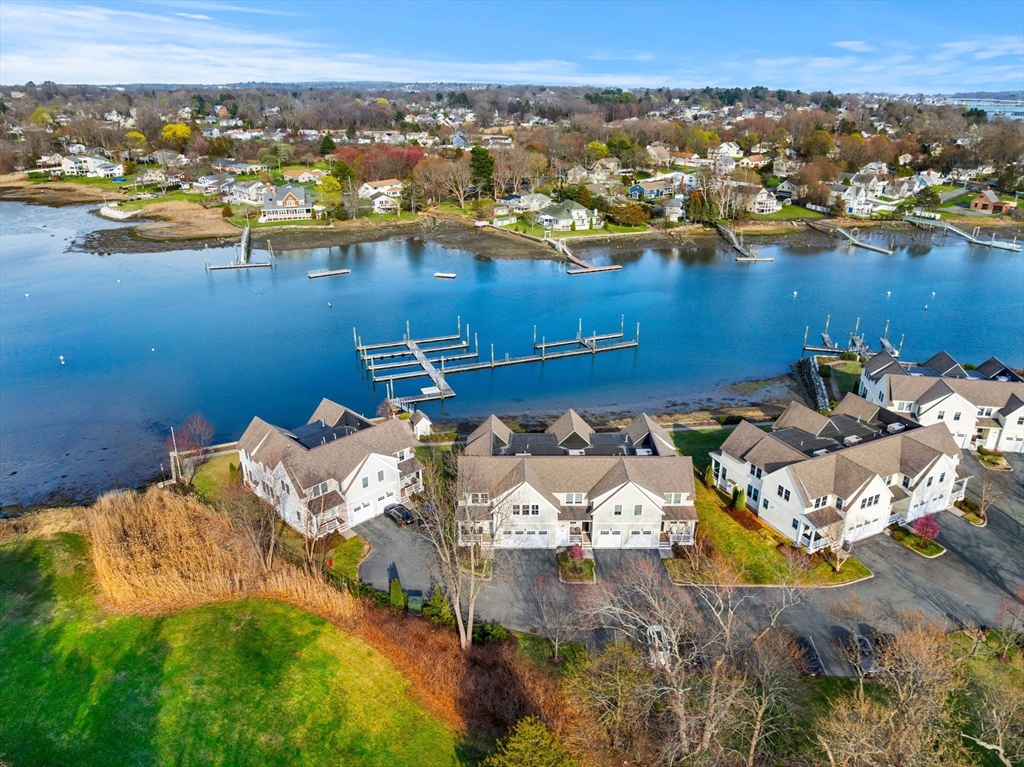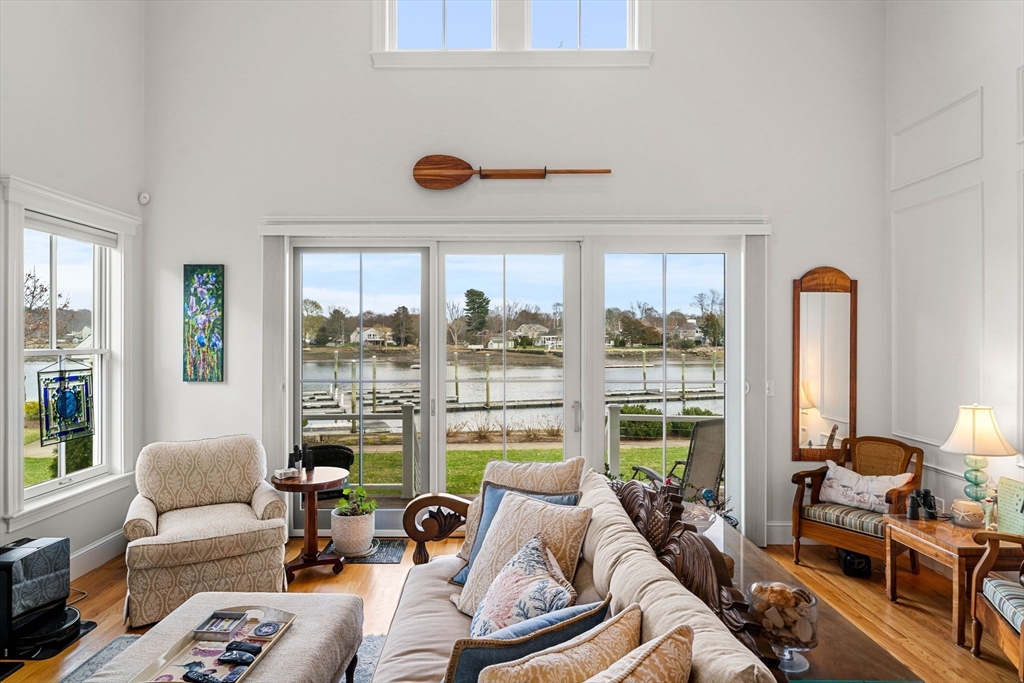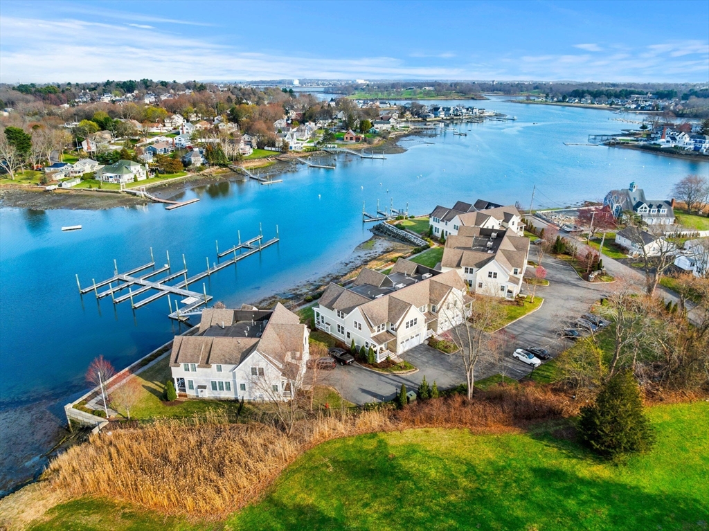 Begin each day with breathtaking views of the Danvers River from this exceptional waterfront end unit townhouse at Mariners Point. One of only two oversized residences, this rare offering features 9 foot ceilings on both levels, a desirable first floor primary suite, and a private two car garage with storage. Enjoy true riverfront living with your own private boat slip just steps from the home. The light filled interior showcases hardwood floors throughout, custom moldings, and refined craftsmanship. The upgraded kitchen features new countertops, gas cooking with double ovens, a wine chiller, and generous cabinetry. The first floor primary suite offers a private bath and nearby laundry. Upstairs are two spacious bedrooms, a renovated guest bath with soaking tub, and a versatile loft overlooking the dramatic two story great room and water views. A rare opportunity to own a premier waterfront retreat