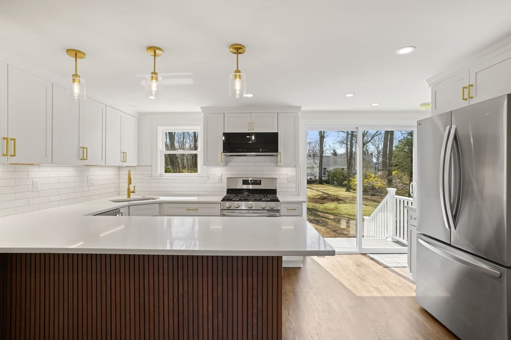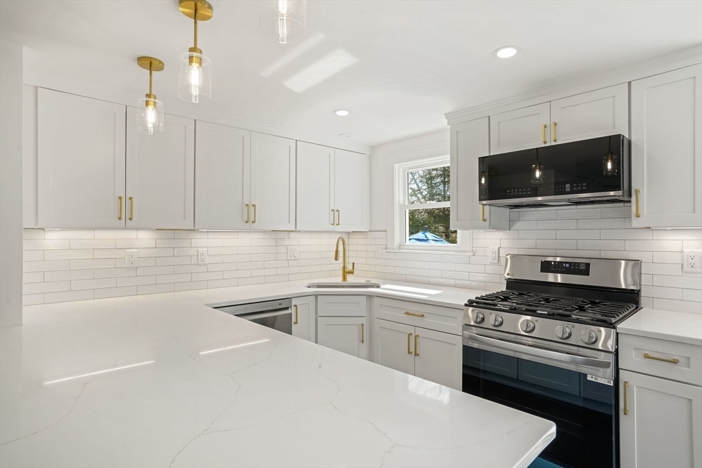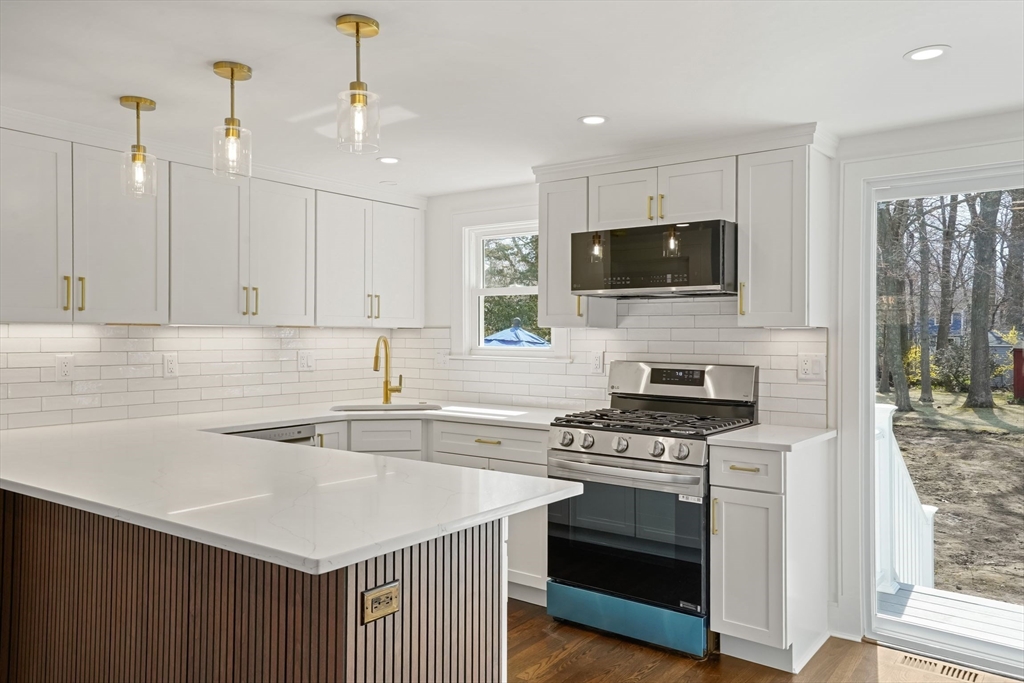 Exciting renovation offering by noted builder. Beautiful redesigned open full plan. Living room with hardwood floors, open kitchen with custom white shaker style cabinets, quartz counters, white tile backsplash, stainless appliance package, gas cooking, three bedrooms with fitted closets, spectacular bath with custom vanity, LED mirror, designer fixtures, linen closet, recessed lights and hardwood floors through out, new slider access to rear patio and expansive level lot, A/C, new electrical and plumbing, full basement with laundry hook up. Not in a flood zone. Green Harbor beach and Marina nearby, shops and restaurants of Brant Rock, and pickleball, tennis, volleyball and kayak launch at Peter Igo Recreational Park.