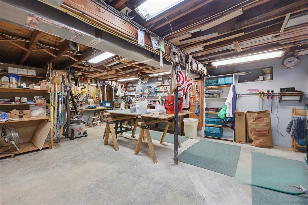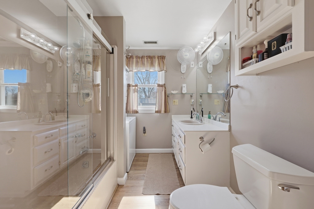 Spacious Colonial set on a fenced-in lot with an extra-large driveway and detached one-car garage—perfect for multi-generational living. This versatile home offers 4 bedrooms and 3 full baths with a flexible layout. A welcoming foyer opens to a sun-filled living room with bay window, hardwood floors, and wood-burning fireplace, plus a cozy family room with hardwood, paneling, and bay window. The eat-in kitchen features ample cabinetry and great natural light. Two spacious bedrooms and a full bath complete the main level. Upstairs boasts a vaulted-ceiling rec room with built-ins open to a second kitchen with SS appliances, tiled backsplash, and oversized walk-in pantry. Two bedrooms, 2 full baths, one with laundry, and a primary suite with en suite and walk-in closet complete the level. Additional features include central air, solar panels, on-demand water heater, generator, composite deck, patio, and storage shed. Conveniently located to Route 495. Ideal for a variety of living needs!