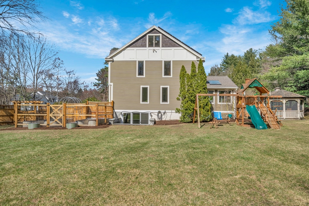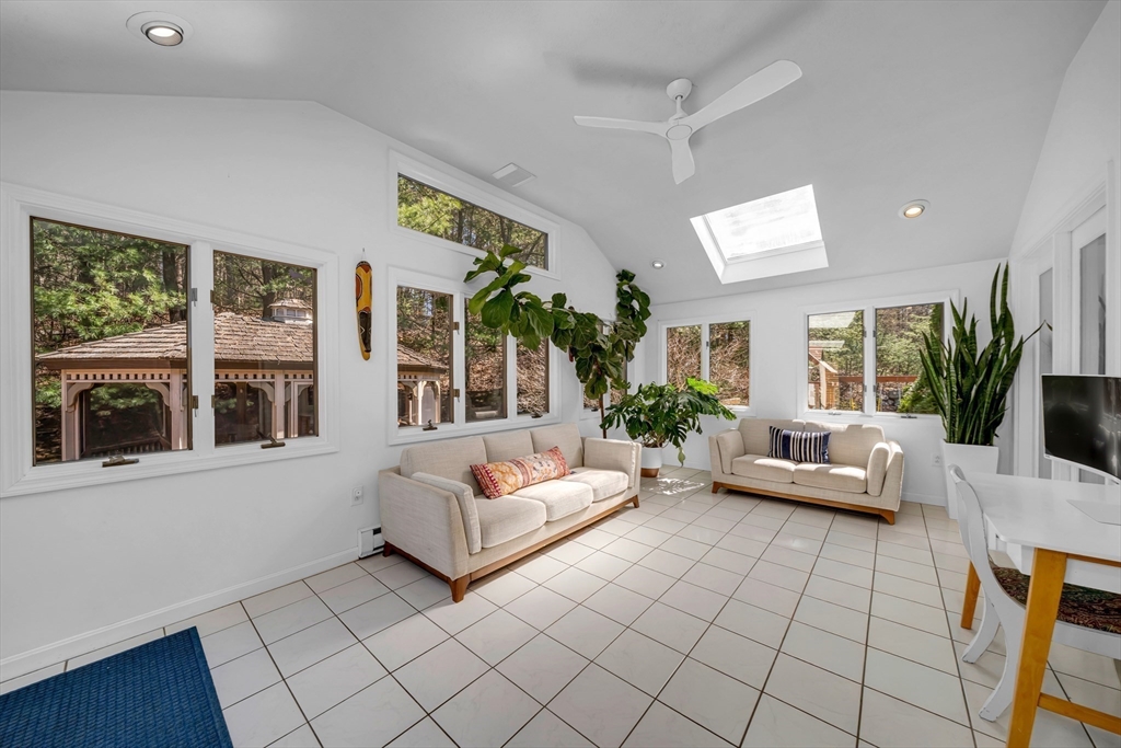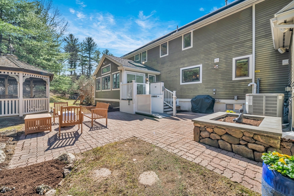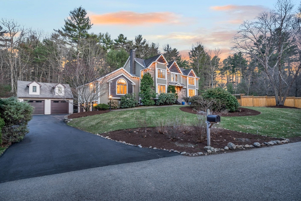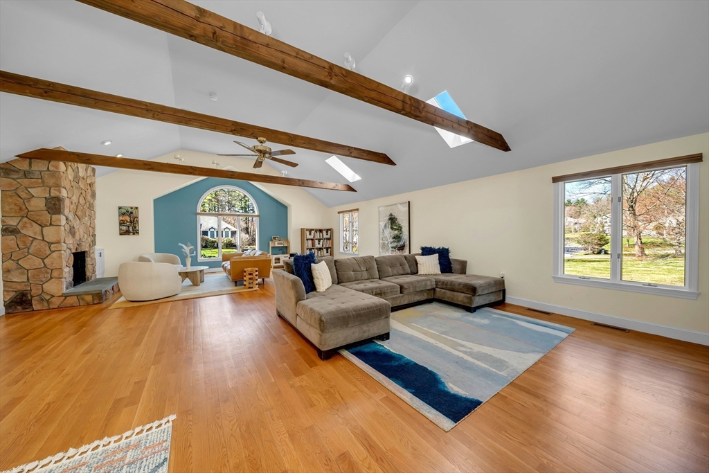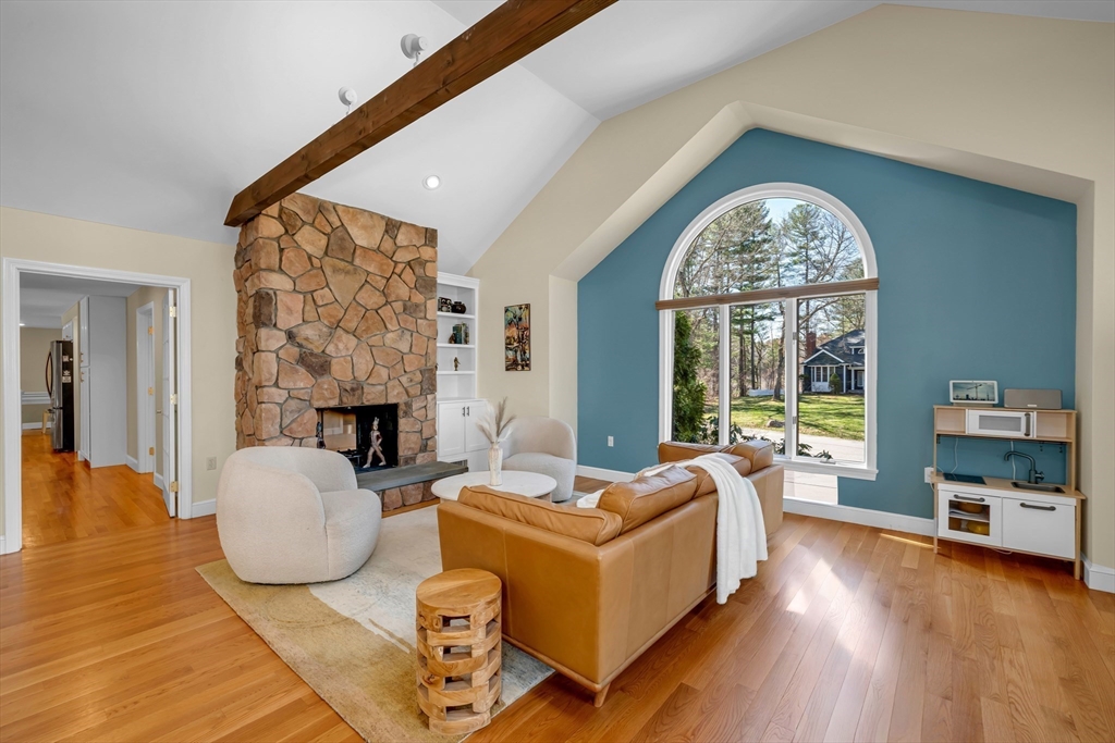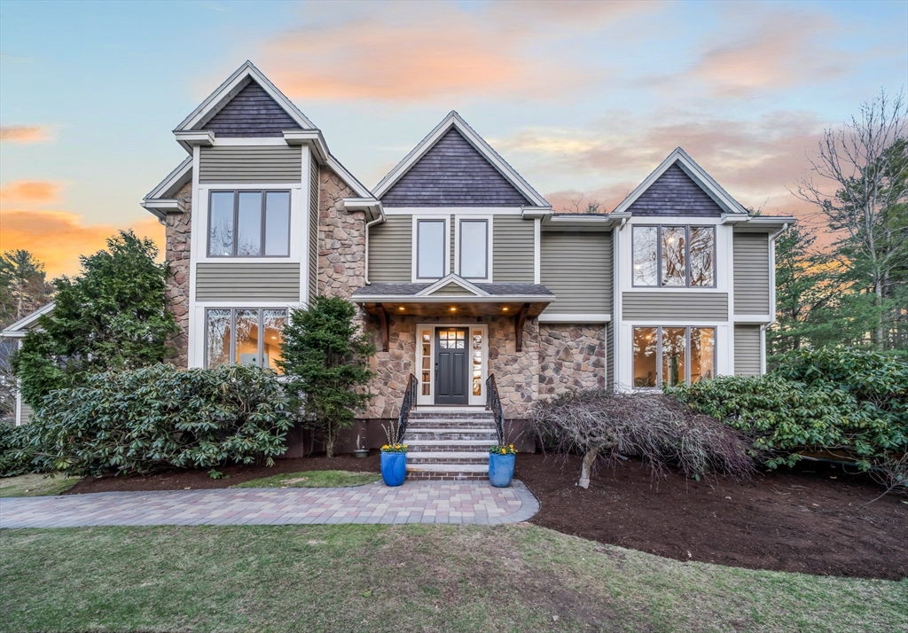 Extensively renovated 5-bed contemporary on a private acre in Andover with a residential elevator, owned solar array, and walk-out in-law or au pair suite, a rare combination at any price point. Set on a quiet cul-de-sac near Foster’s Pond. Vaulted beamed ceilings, skylights, stone fireplace with custom built-ins, and walls of windows define the great room. Updated kitchen with induction range and island opens to patio and gazebo. Sunroom, dining room, and den complete the main level. Four bedrooms upstairs include a primary suite with spa bath and soaking tub, one en-suite, and two sharing a full bath. Third floor adds a home office and guest room. Lower level includes in-law or au pair suite with kitchenette, bedroom, bath, private walk-out, plus mudroom and exercise area. Features include cedar privacy fence, fenced garden with raised beds, 3-car attached garage with EV charger and epoxy floors, detached 2-car garage, and owned 41-panel solar array transferring at no cost.