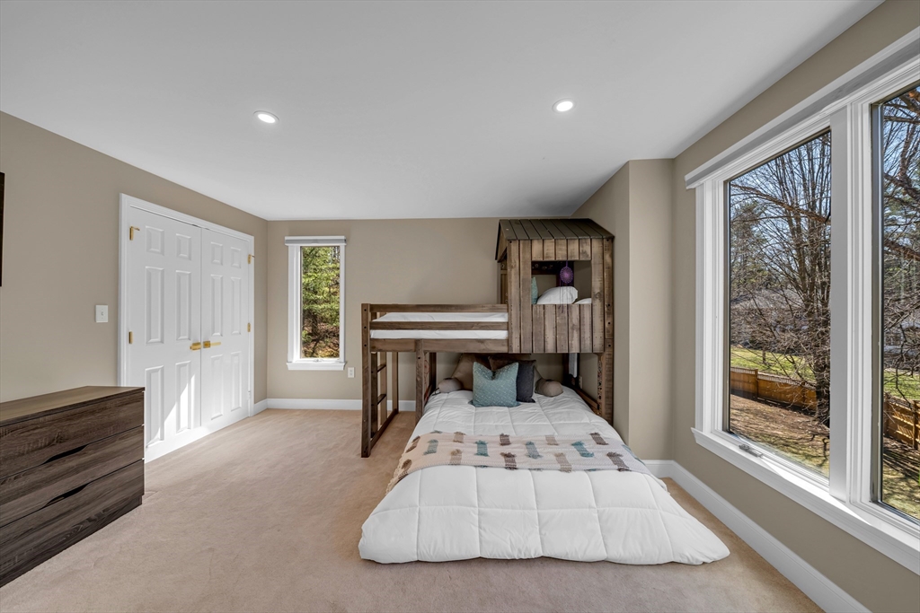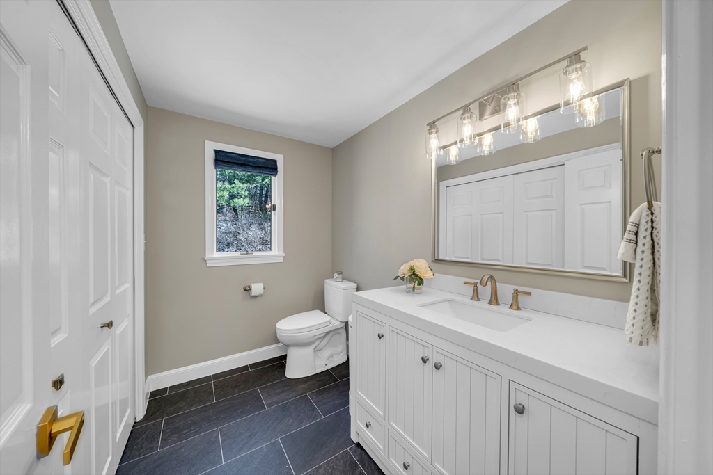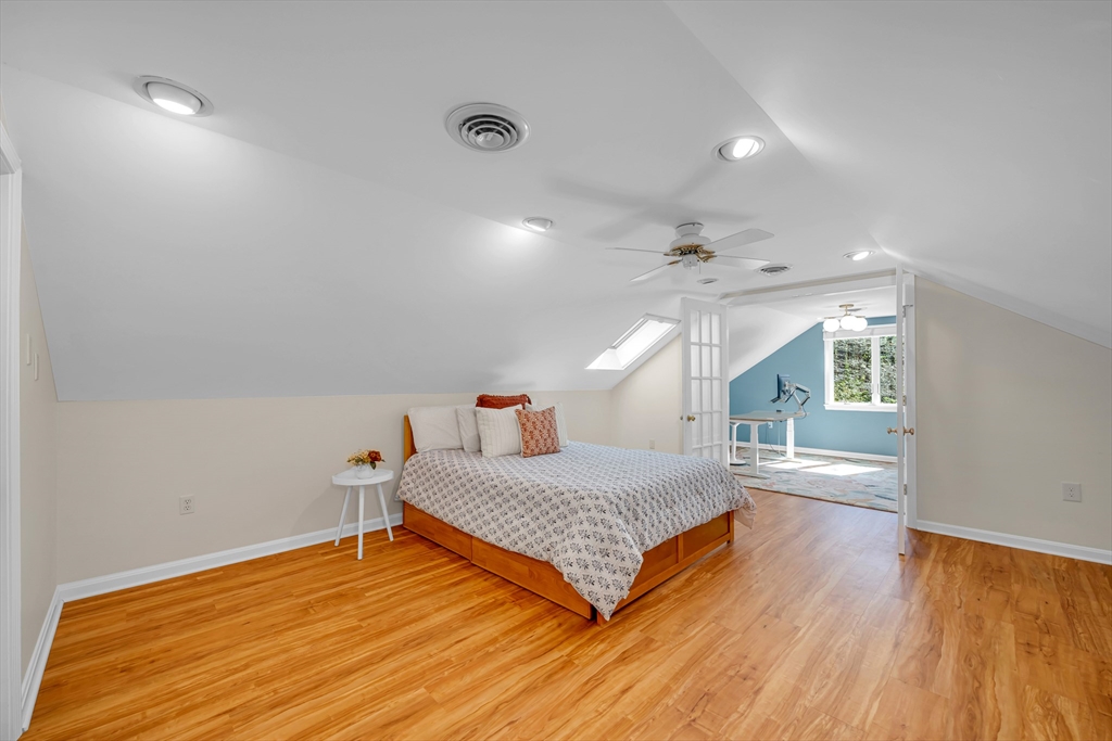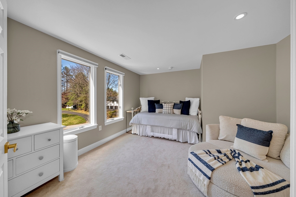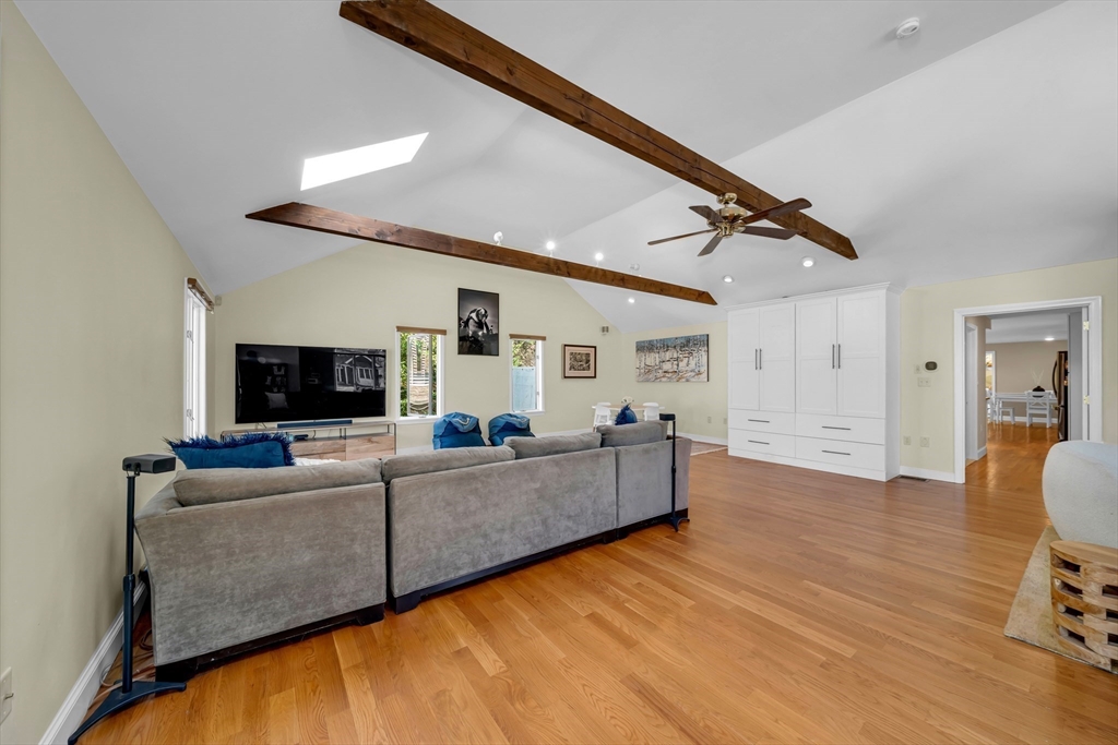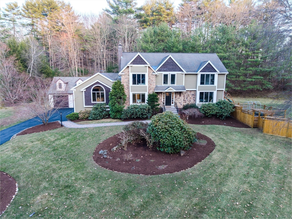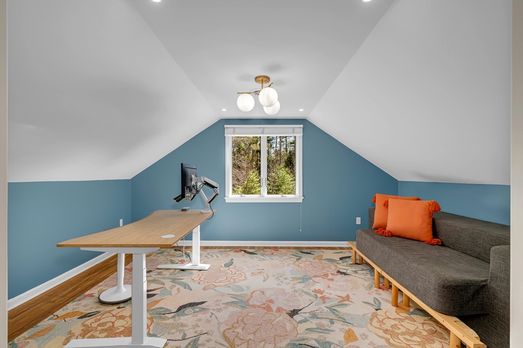Extensively renovated 5-bed contemporary on a private acre in Andover with a residential elevator, owned solar array, and walk-out in-law or au pair suite, a rare combination at any price point. Set on a quiet cul-de-sac near Foster’s Pond. Vaulted beamed ceilings, skylights, stone fireplace with custom built-ins, and walls of windows define the great room. Updated kitchen with induction range and island opens to patio and gazebo. Sunroom, dining room, and den complete the main level. Four bedrooms upstairs include a primary suite with spa bath and soaking tub, one en-suite, and two sharing a full bath. Third floor adds a home office and guest room. Lower level includes in-law or au pair suite with kitchenette, bedroom, bath, private walk-out, plus mudroom and exercise area. Features include cedar privacy fence, fenced garden with raised beds, 3-car attached garage with EV charger and epoxy floors, detached 2-car garage, and owned 41-panel solar array transferring at no cost.