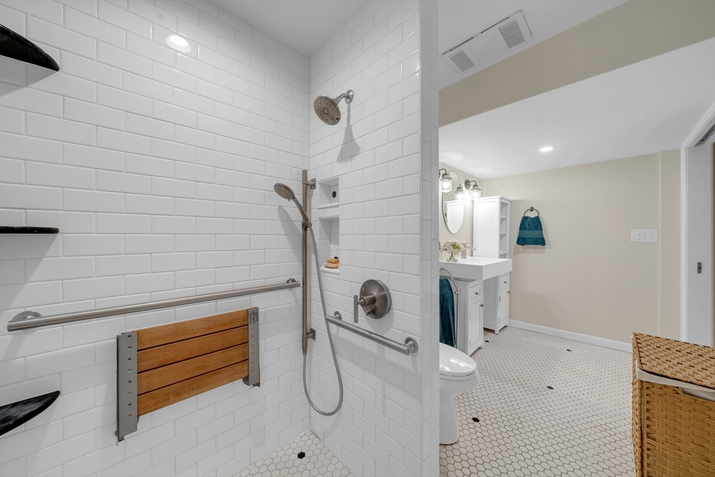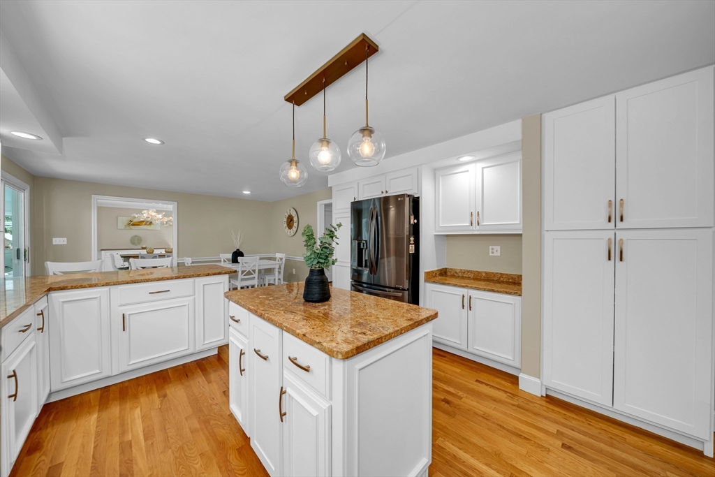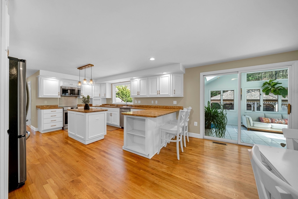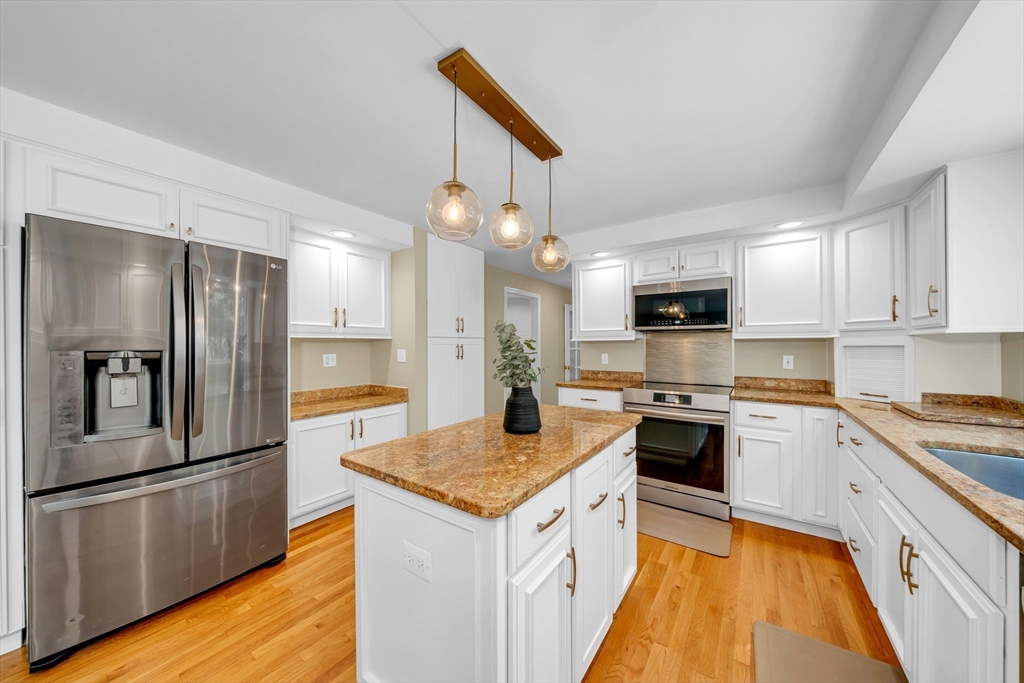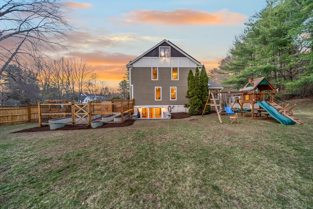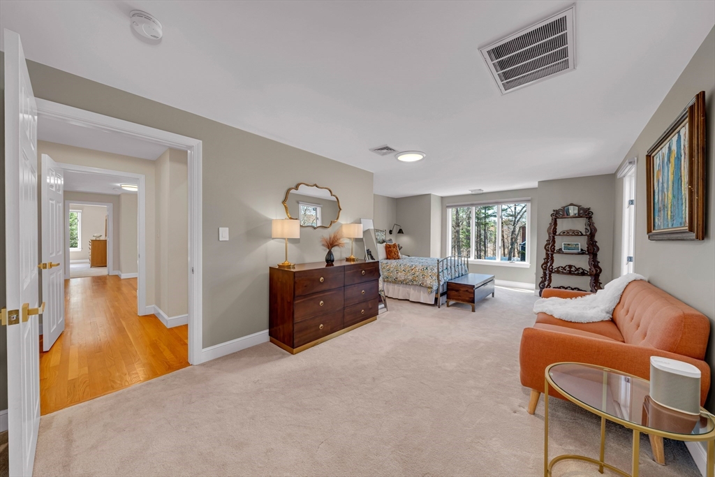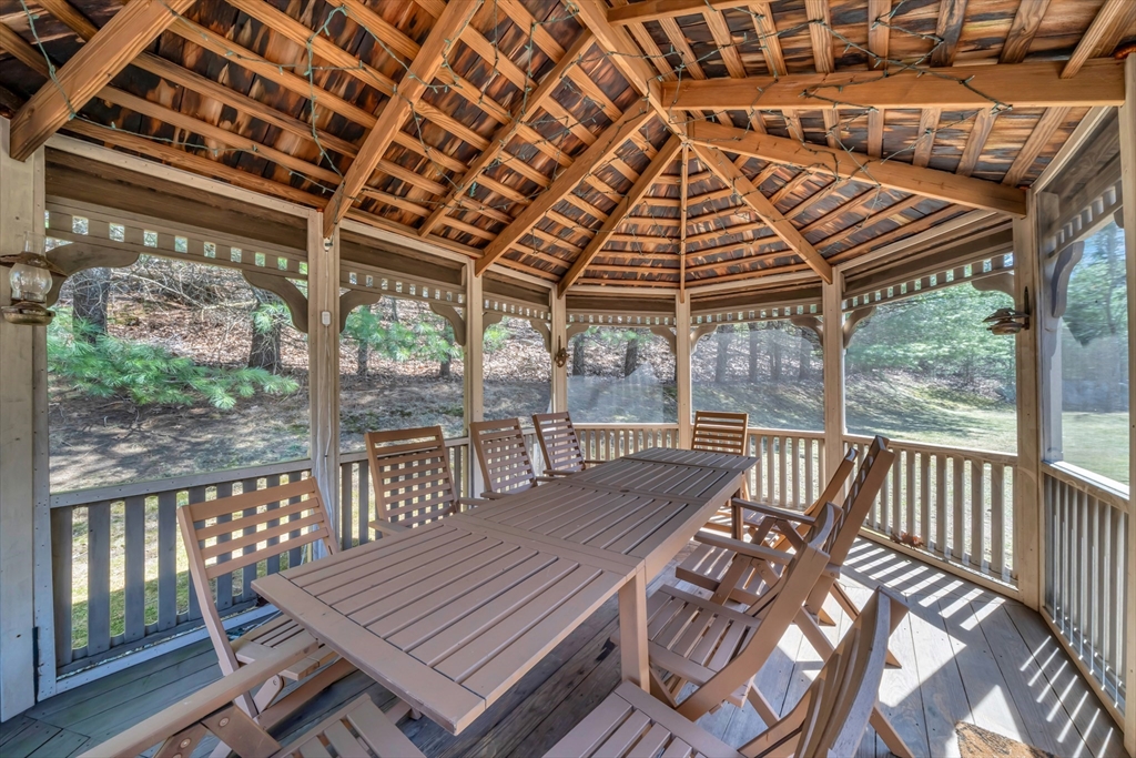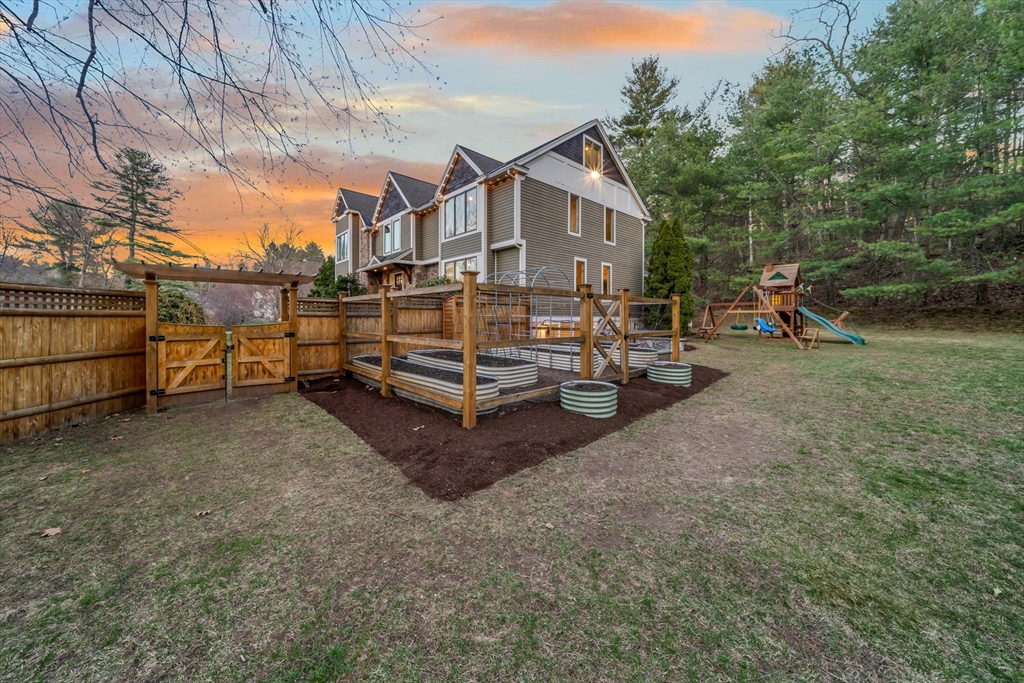 Extensively renovated 5-bed contemporary on a private acre in Andover with a residential elevator, owned solar array, and walk-out in-law or au pair suite, a rare combination at any price point. Set on a quiet cul-de-sac near Foster’s Pond. Vaulted beamed ceilings, skylights, stone fireplace with custom built-ins, and walls of windows define the great room. Updated kitchen with induction range and island opens to patio and gazebo. Sunroom, dining room, and den complete the main level. Four bedrooms upstairs include a primary suite with spa bath and soaking tub, one en-suite, and two sharing a full bath. Third floor adds a home office and guest room. Lower level includes in-law or au pair suite with kitchenette, bedroom, bath, private walk-out, plus mudroom and exercise area. Features include cedar privacy fence, fenced garden with raised beds, 3-car attached garage with EV charger and epoxy floors, detached 2-car garage, and owned 41-panel solar array transferring at no cost.
