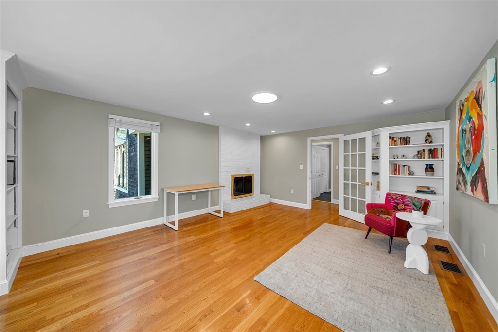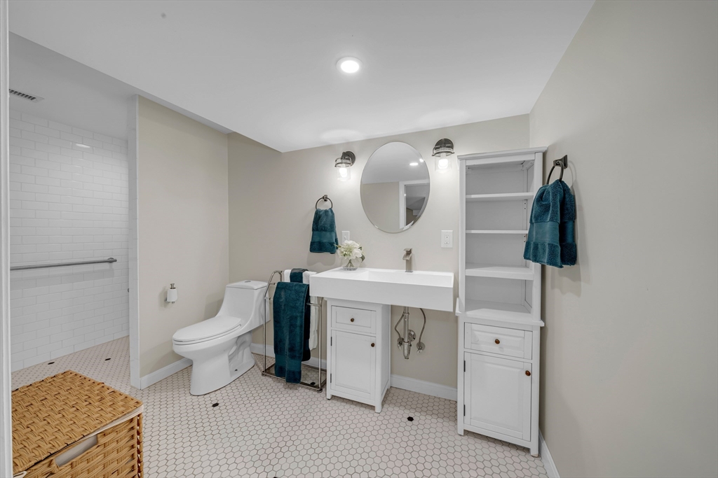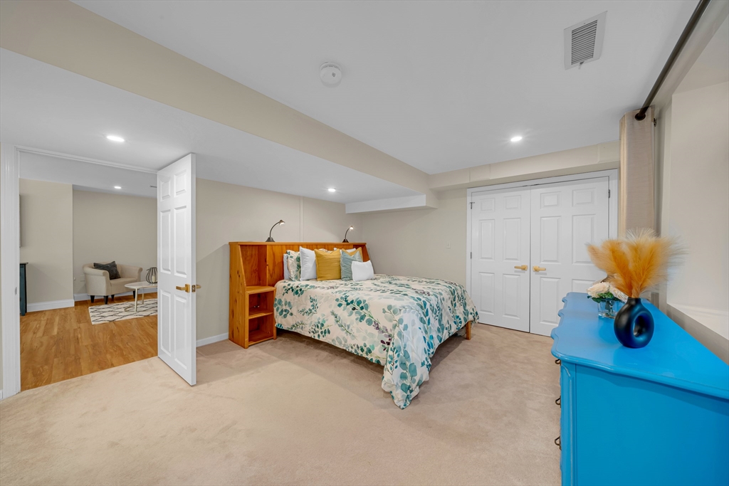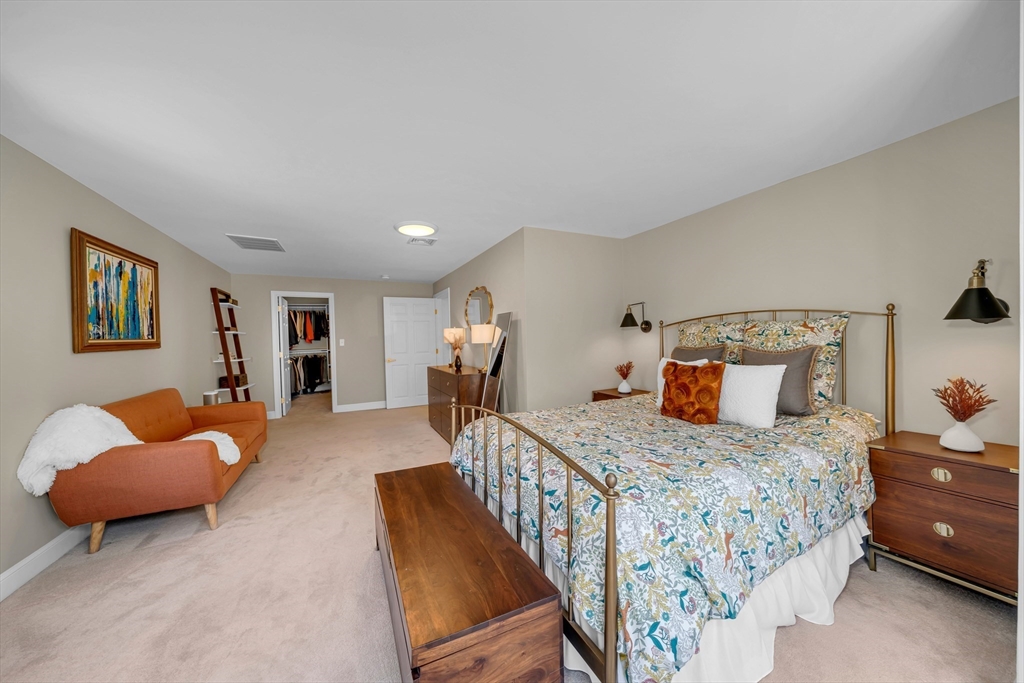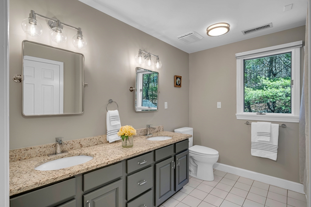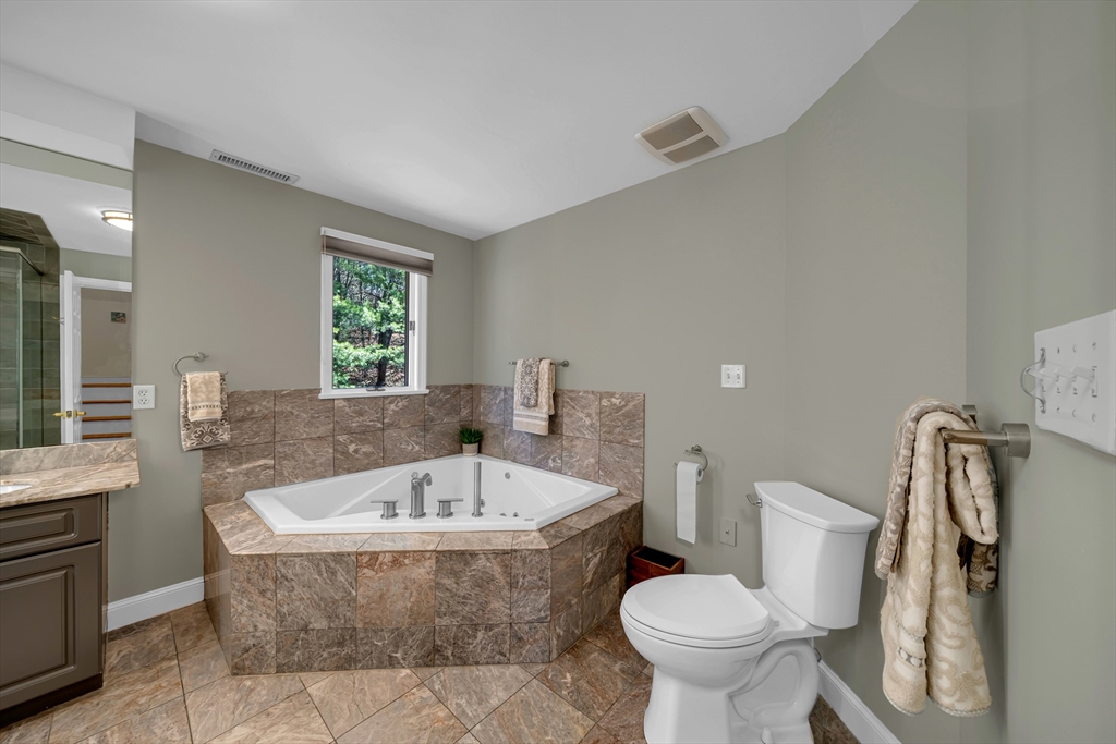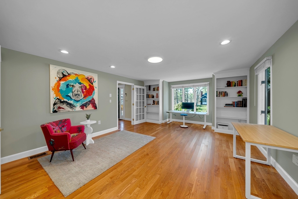 Extensively renovated 5-bed contemporary on a private acre in Andover with a residential elevator, owned solar array, and walk-out in-law or au pair suite, a rare combination at any price point. Set on a quiet cul-de-sac near Foster’s Pond. Vaulted beamed ceilings, skylights, stone fireplace with custom built-ins, and walls of windows define the great room. Updated kitchen with induction range and island opens to patio and gazebo. Sunroom, dining room, and den complete the main level. Four bedrooms upstairs include a primary suite with spa bath and soaking tub, one en-suite, and two sharing a full bath. Third floor adds a home office and guest room. Lower level includes in-law or au pair suite with kitchenette, bedroom, bath, private walk-out, plus mudroom and exercise area. Features include cedar privacy fence, fenced garden with raised beds, 3-car attached garage with EV charger and epoxy floors, detached 2-car garage, and owned 41-panel solar array transferring at no cost.