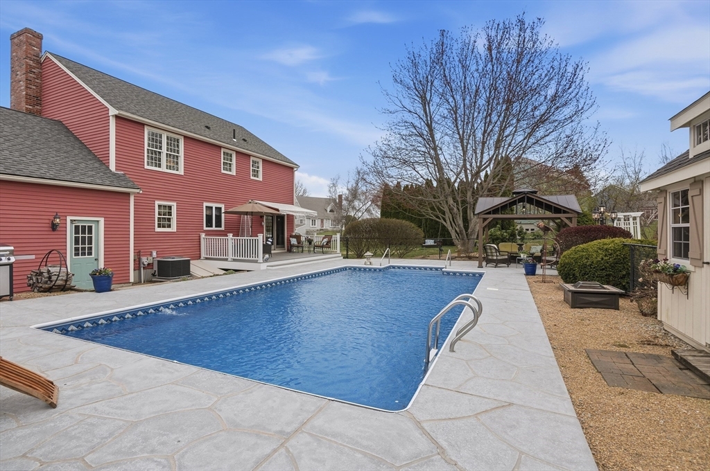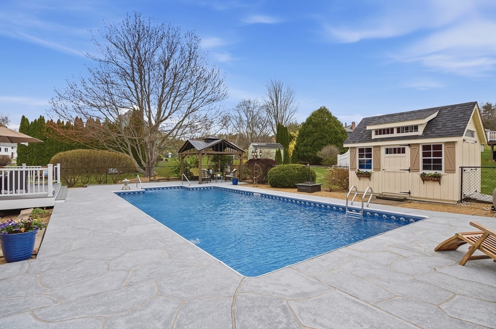 Welcome to the Highlands in Sutton! This lovingly-maintained, one-family owned 3 bed, 2.5 bath Colonial features hardwood floors throughout the first floor and plush neutral carpeting upstairs. The updated kitchen offers quartz countertops, tile backsplash, and modern cabinetry. Enjoy year-round comfort with a cozy wood-burning fireplace, central air, and a central vacuum system. Embrace summer with seamless indoor-outdoor living; head out to the retractable-awning covered deck overlooking the pool area, complete with a gazebo, storage shed, perennial gardens and an irrigation system. Convenient 1st-floor laundry, with additional storage space in the basement and walk-up loft in the oversized 2-car garage. Minutes to Market 32 and Route 146, offering small-town charm with easy access to commuting routes.