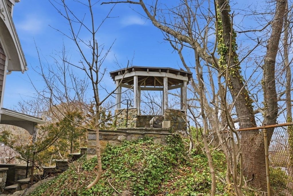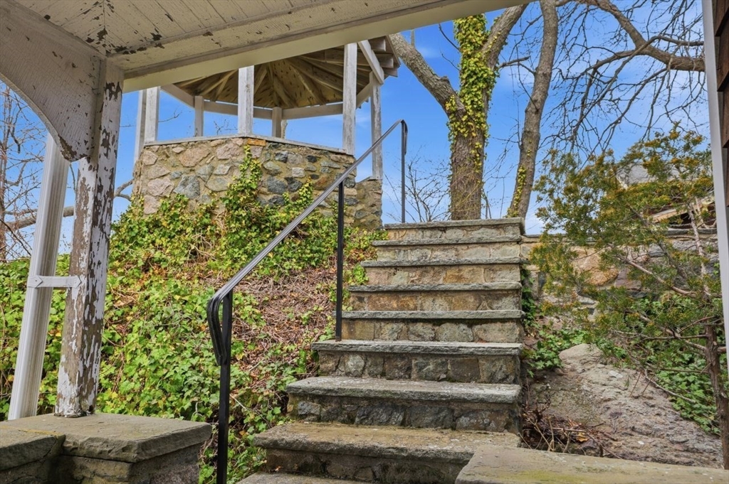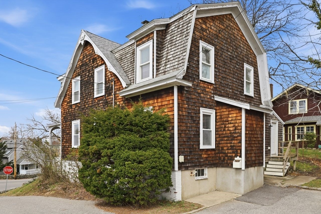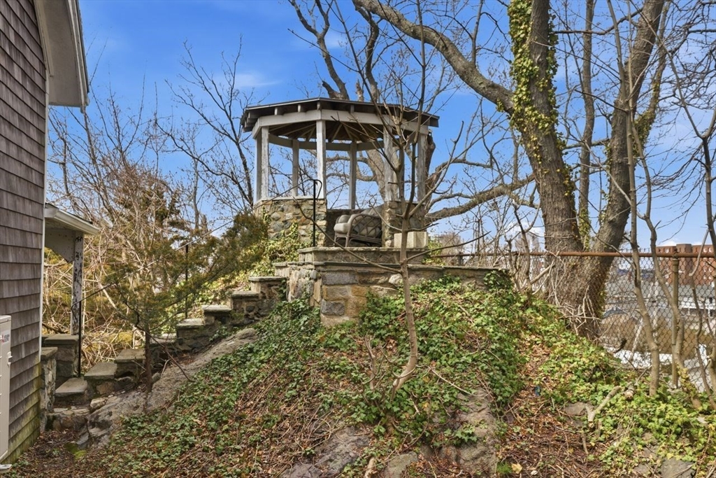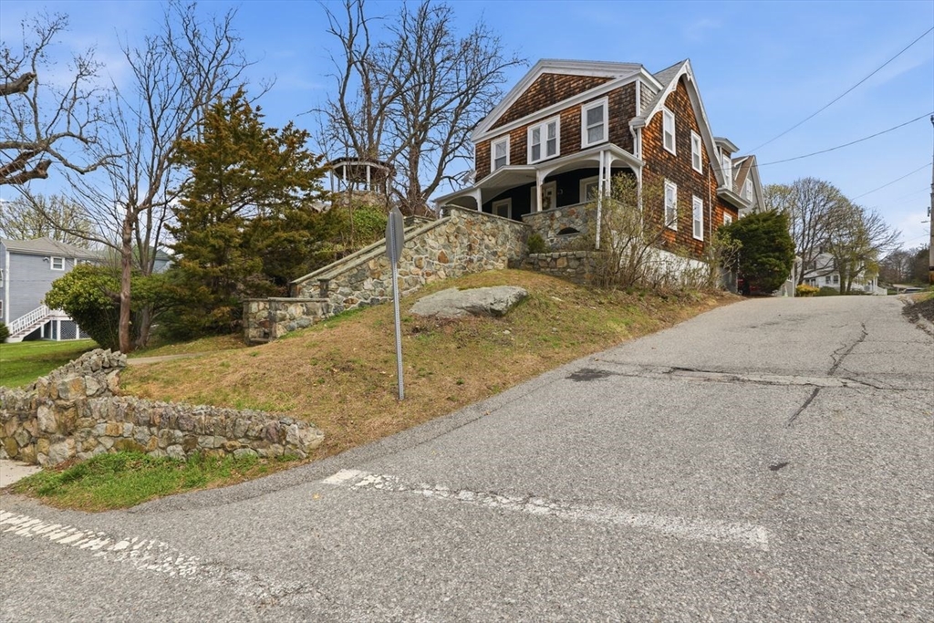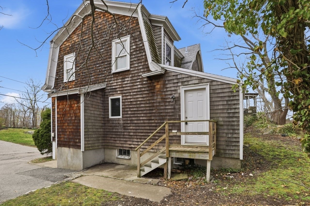 Perched atop a hill, this charming shingle-style Colonial is framed by a welcoming rocking chair front porch and striking stonework, leading to a picturesque stone gazebo with distant ocean views. This spacious 8-room home was fully gut renovated just 8 years ago and features beautiful hardwood floors, central air and a sun filled floor plan. The white kitchen with granite countertops includes a large walk-in pantry and flows seamlessly off the mudroom/laundry area for added convenience. The first floor offers both living and family rooms, along with a bedroom and a beautifully renovated full bath—ideal for guests or flexible living. Upstairs, you'll find a large sitting area, three generously sized bedrooms (one currently used as a home office), and a full bath with a walk-in shower. Enjoy sidewalks to Nantasket Beach, shops, restaurants and a nearby playground, offering the best of coastal living! Convenient to commuter boat and train to Boston. No flood insurance required.