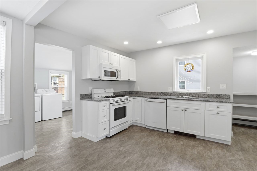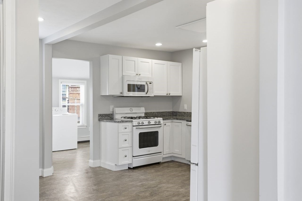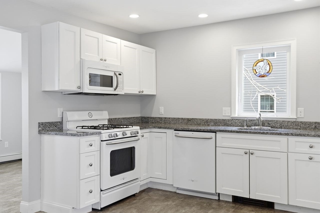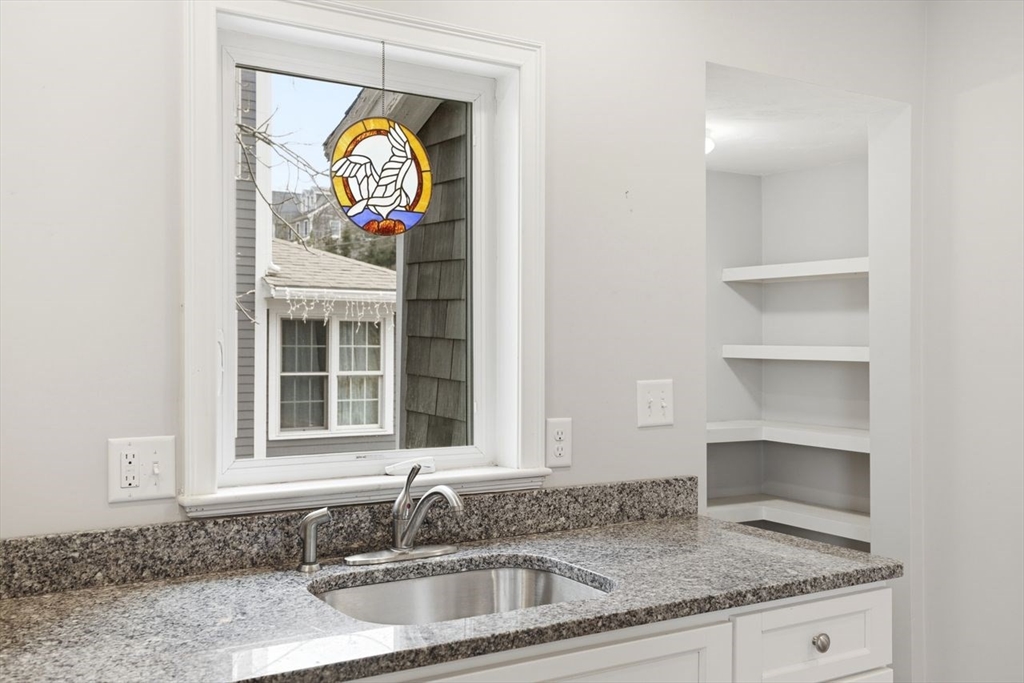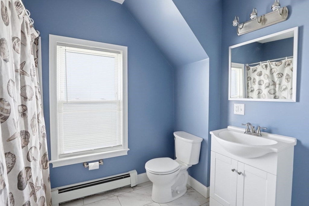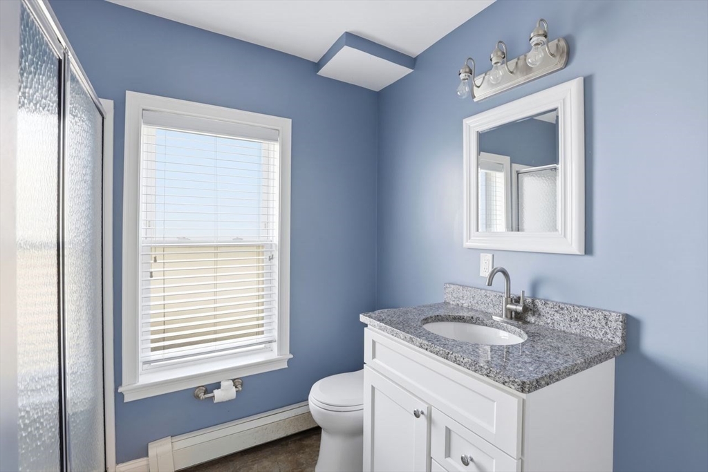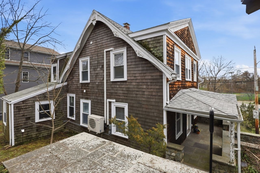 Perched atop a hill, this charming shingle-style Colonial is framed by a welcoming rocking chair front porch and striking stonework, leading to a picturesque stone gazebo with distant ocean views. This spacious 8-room home was fully gut renovated just 8 years ago and features beautiful hardwood floors, central air and a sun filled floor plan. The white kitchen with granite countertops includes a large walk-in pantry and flows seamlessly off the mudroom/laundry area for added convenience. The first floor offers both living and family rooms, along with a bedroom and a beautifully renovated full bath—ideal for guests or flexible living. Upstairs, you'll find a large sitting area, three generously sized bedrooms (one currently used as a home office), and a full bath with a walk-in shower. Enjoy sidewalks to Nantasket Beach, shops, restaurants and a nearby playground, offering the best of coastal living! Convenient to commuter boat and train to Boston. No flood insurance required.