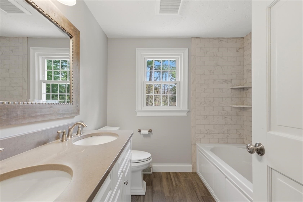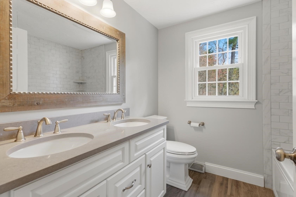 *Showings begin at OPEN HOUSES this FRIDAY, April 17th, from 3-5pm and SATURDAY, April 18th, from 12-2pm for qualified buyers* Impeccably gorgeous custom built offering located in a picturesque Walpole Country Club neighborhood. Featuring an open concept floor plan with attractive Brazilian walnut flooring. Beautiful newly renovated bathrooms, and the gorgeous kitchen offering granite counters, stainless steel appliances and an island with seating for four. The kitchen flows seamlessly to the open dining room and the elegant cathedral skylit family room featuring a fireplace and attractive chandelier. Bright front to back living room completes the first floor. Second floor offers four good sized bedrooms with a walk-in closet in the primary bedroom. New composite deck and private level fenced in yard for play. The recent updates include: new roof, hot water tank, replacement windows, exterior trim, central air and fresh paint throughout. *Offers due by Monday, April 20th by 5pm please*