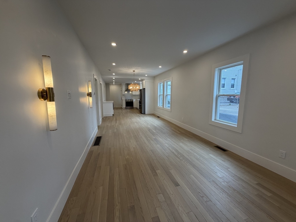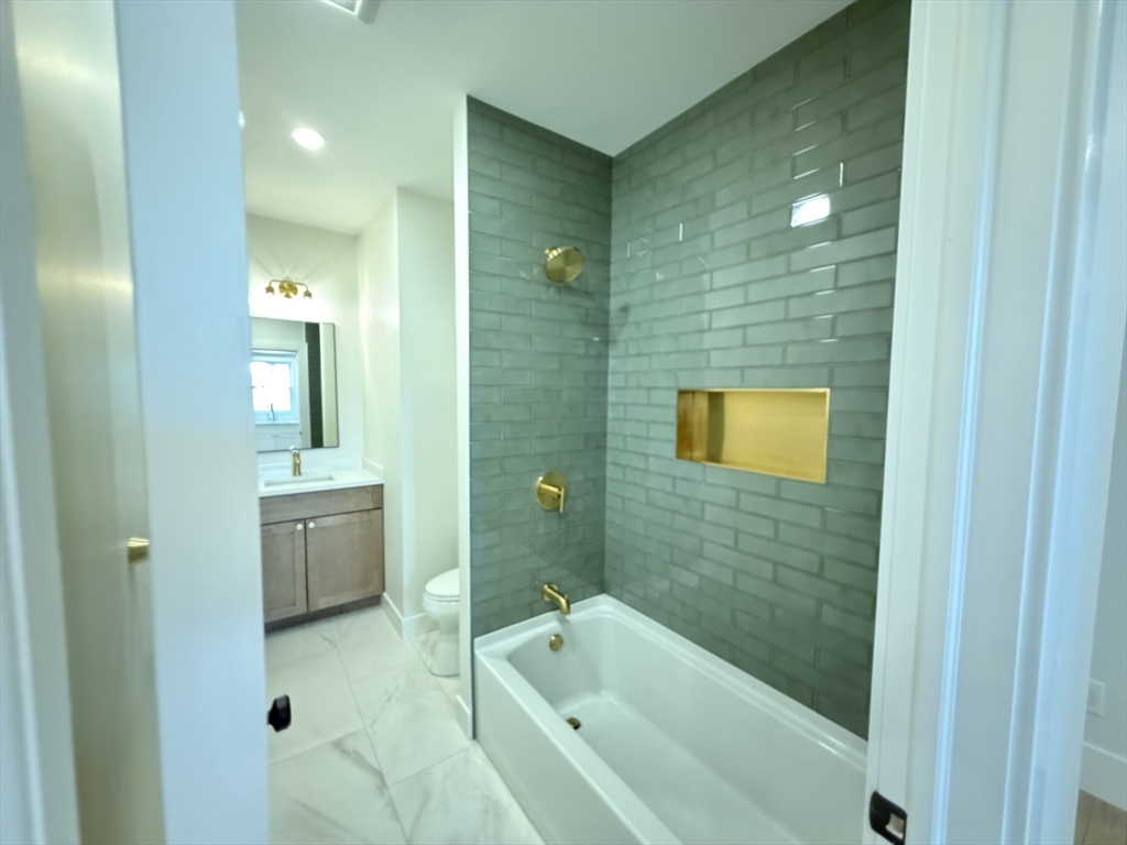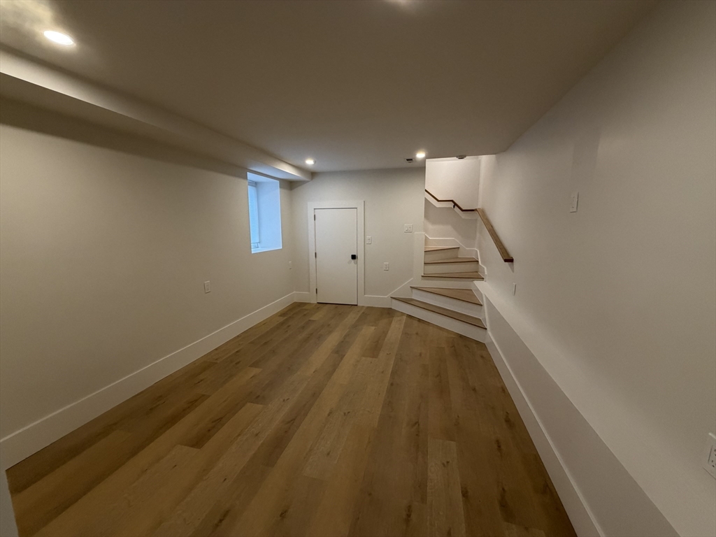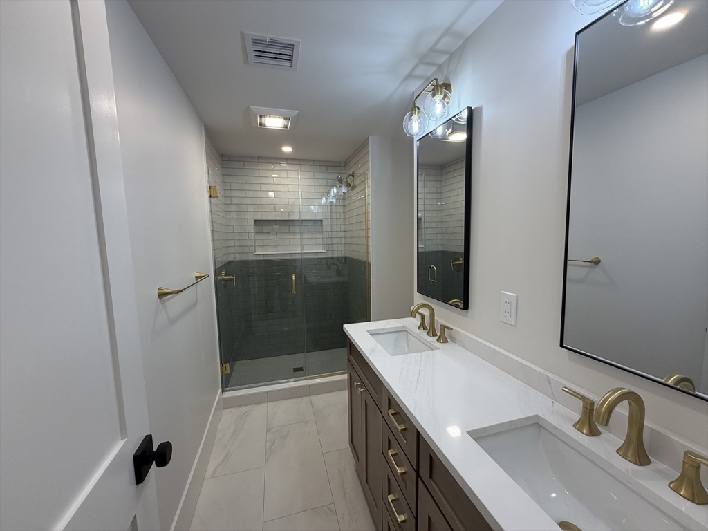 Be the first to live in this newly renovated multi-level 3-bedroom, 2-bath apartment that blends modern elegance with functional design on quiet side street on the Medford/Somerville line.The main level open-concept combines living room, dining room and kitchen. Modern kitchen with white shaker cabinetry, quartz countertops, stainless steel appliances, built-in microwave, brass hardware & quartz backsplash.Two bedrooms w/deep custom closets on the main level. Beautiful full tiled bath w/tub complete main level. Lower-level features primary king-size en-suite with walk-in closet w/custom built-in drawers and shelves. Spa-like bathroom includes double vanity, green subway tile and matte brass rain shower fixtures. Oak hardwood flooring. Central AC. In-Unit laundry. Exclusive private storage space. Exclusive use of backyard space. One assigned off-street parking. Walk to restaurants, gourmet shops, Tufts Green Line, Ball Sq,/Magoun Sq. Bus to Sullivan Station at end of street. No pets.